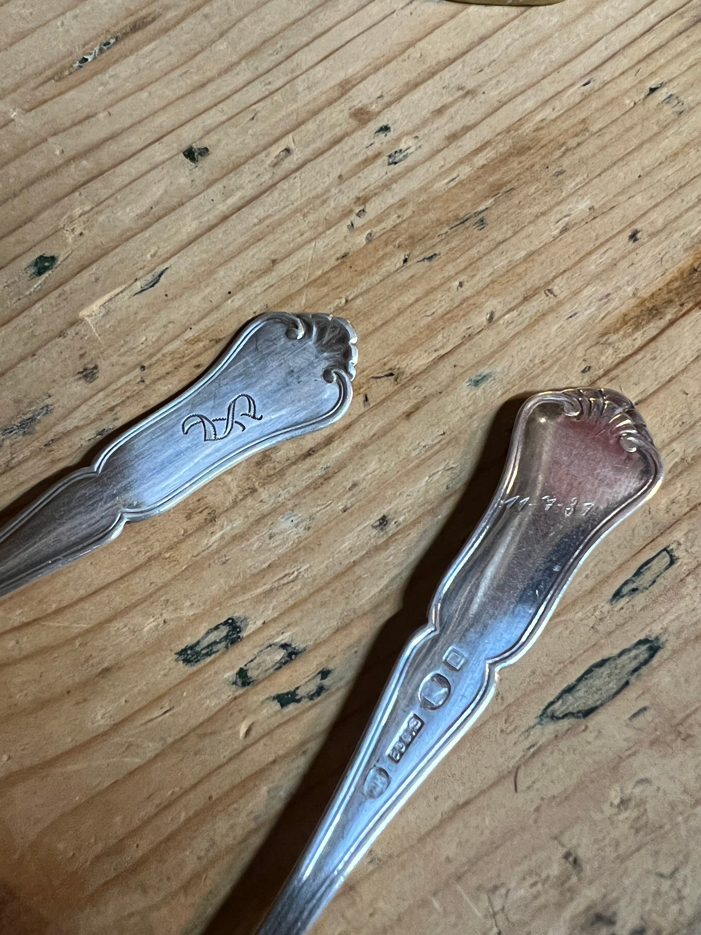 The set includes 2 antique/vintage silver spoons for salt and pepper. Both of them with Norwegian silver stamp 830s and producer's logo (Th. Marthinsen), and dated 11-7-31. The spoon was designed by Lars Meum in 1929. Very early production of the design.
