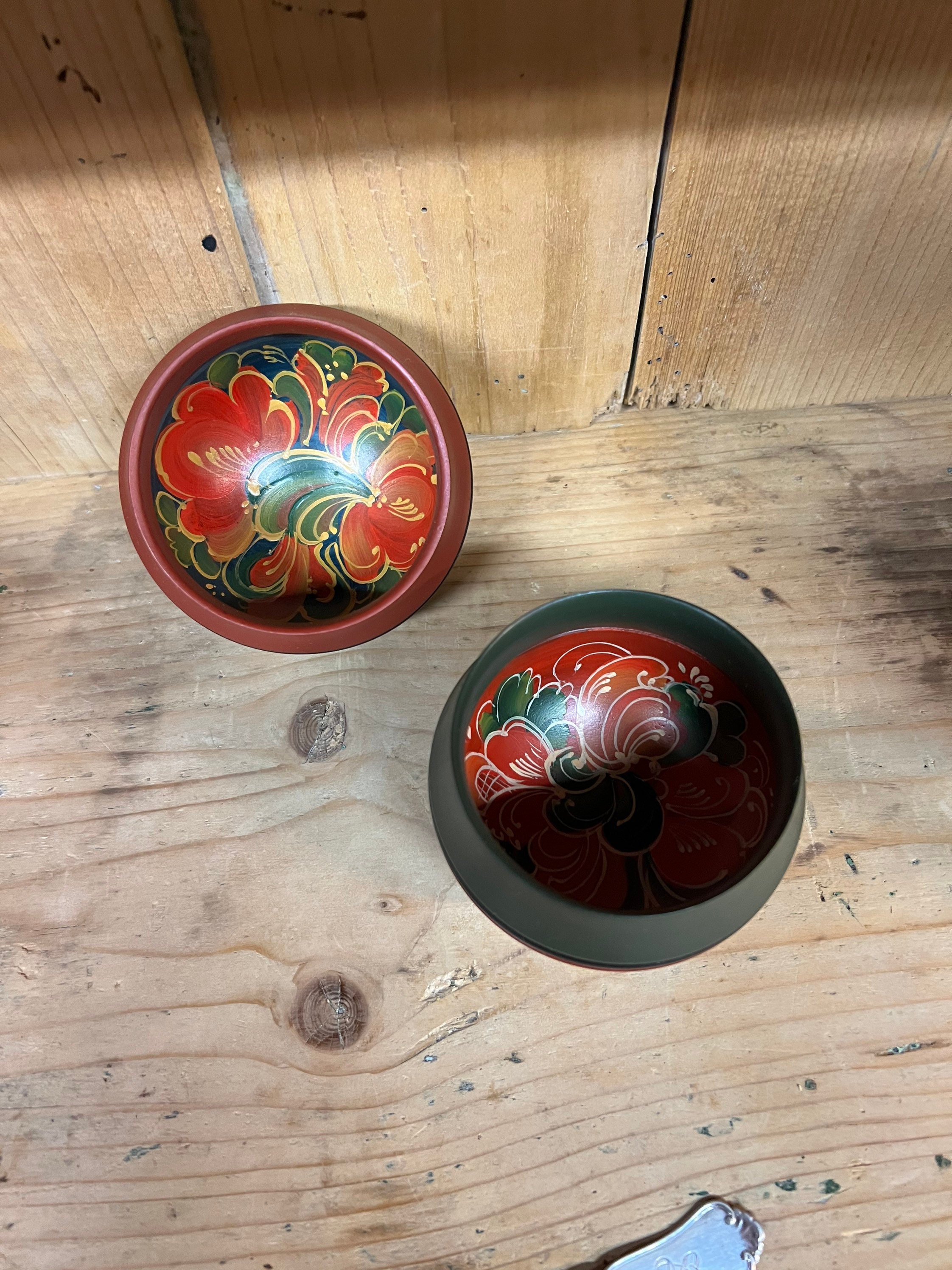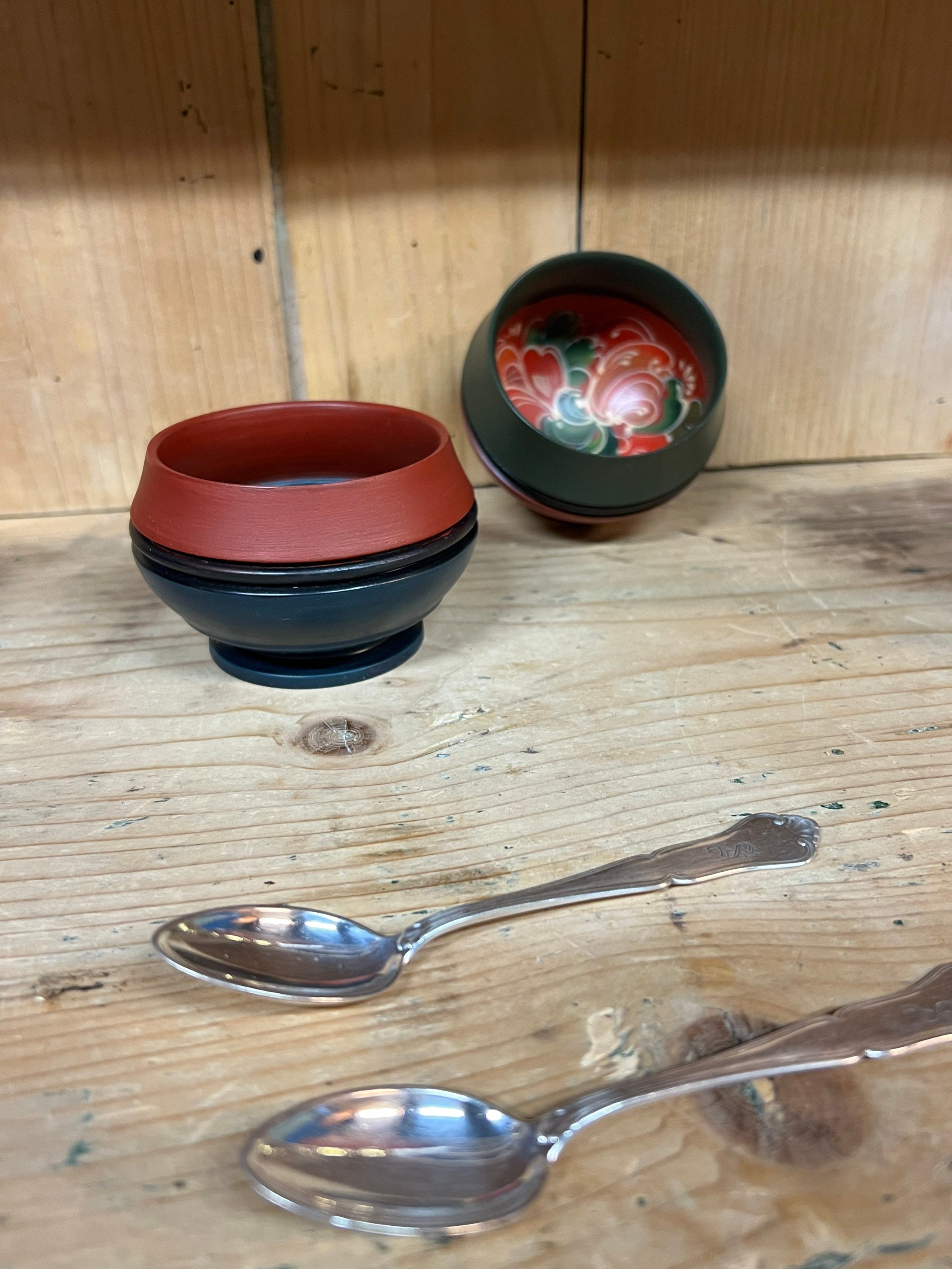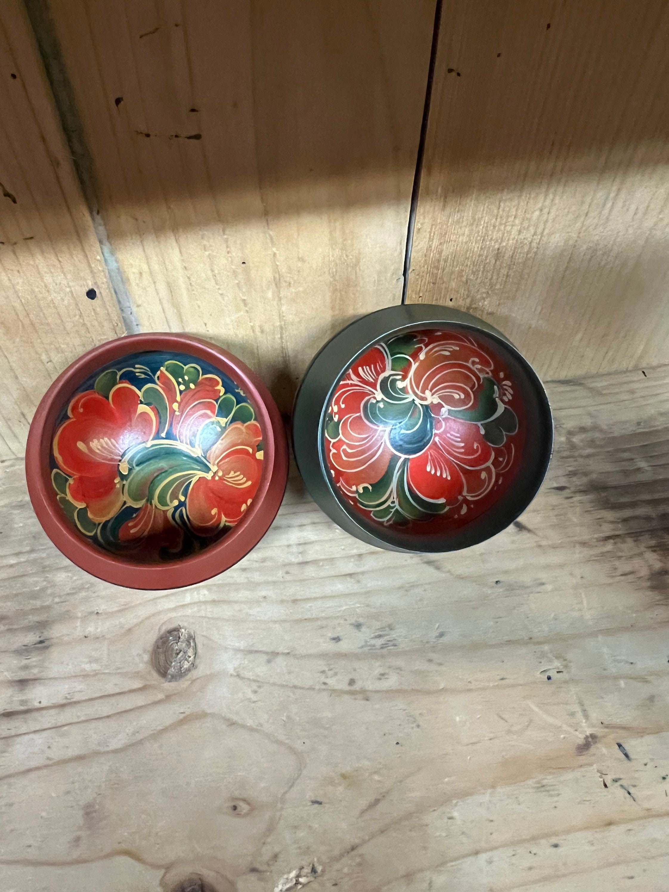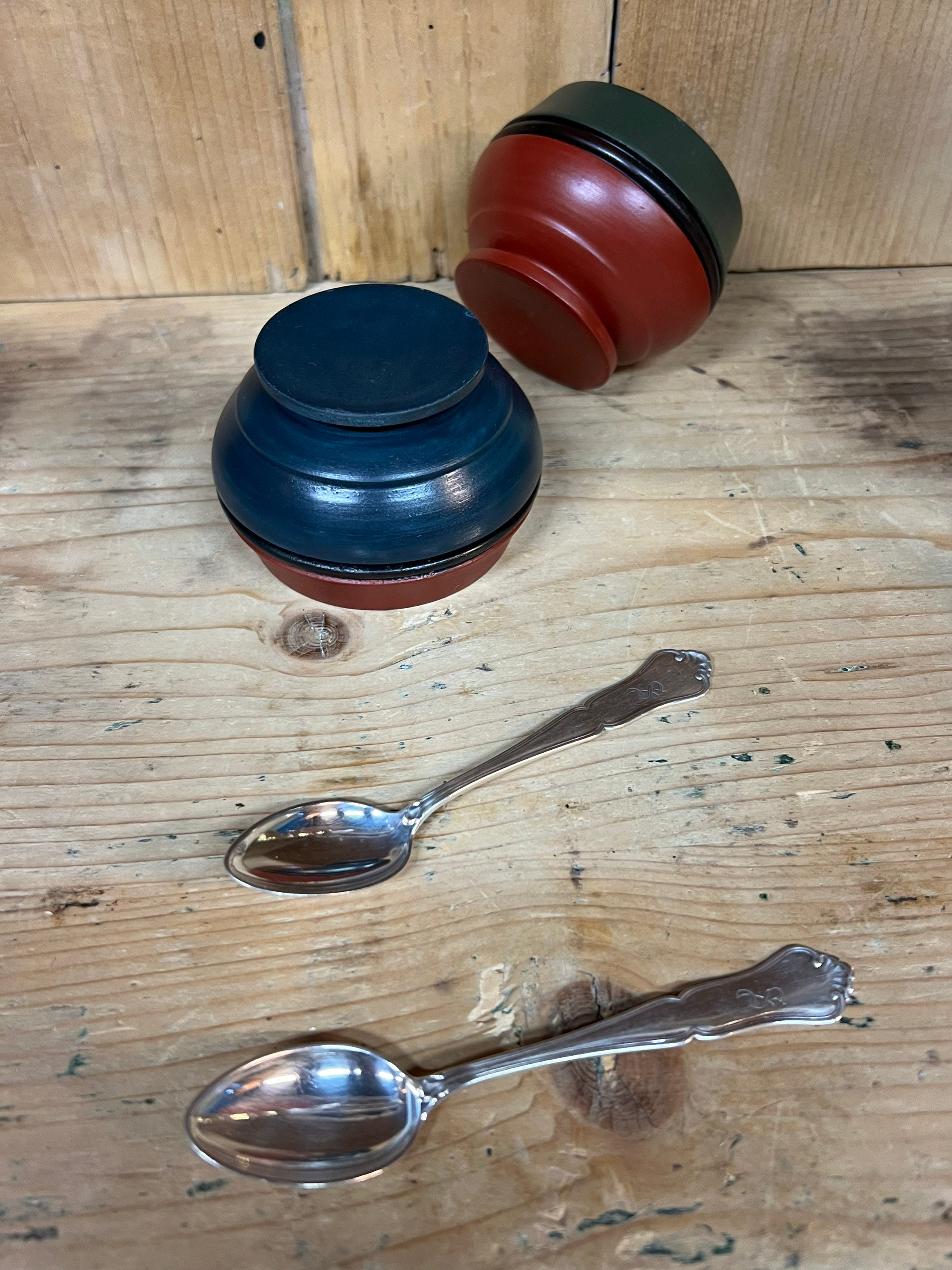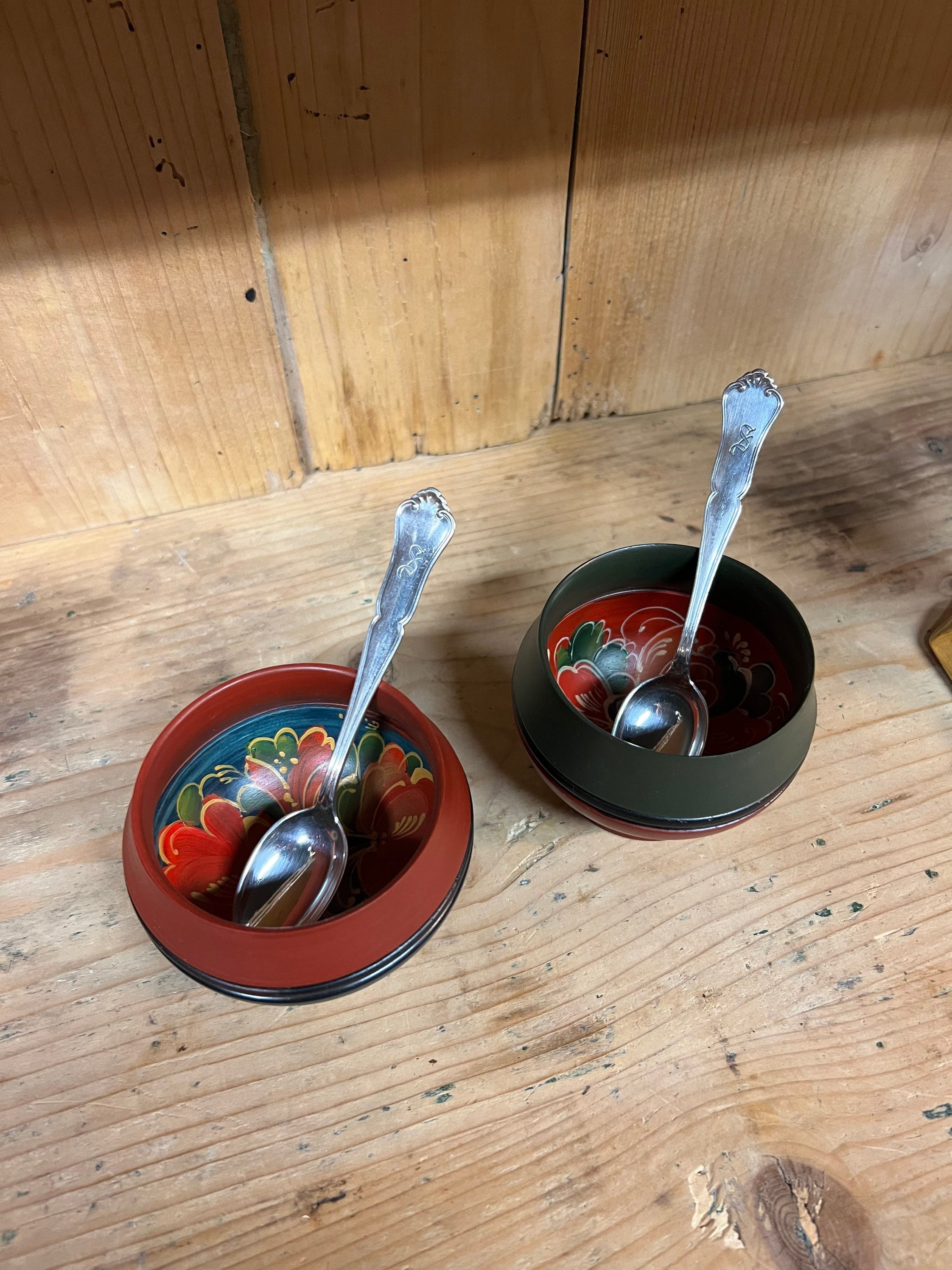 A set of sweet Norwegian rosemaling Salt and Pepper Pot / bowl in wood with 2 antique silver spoon.