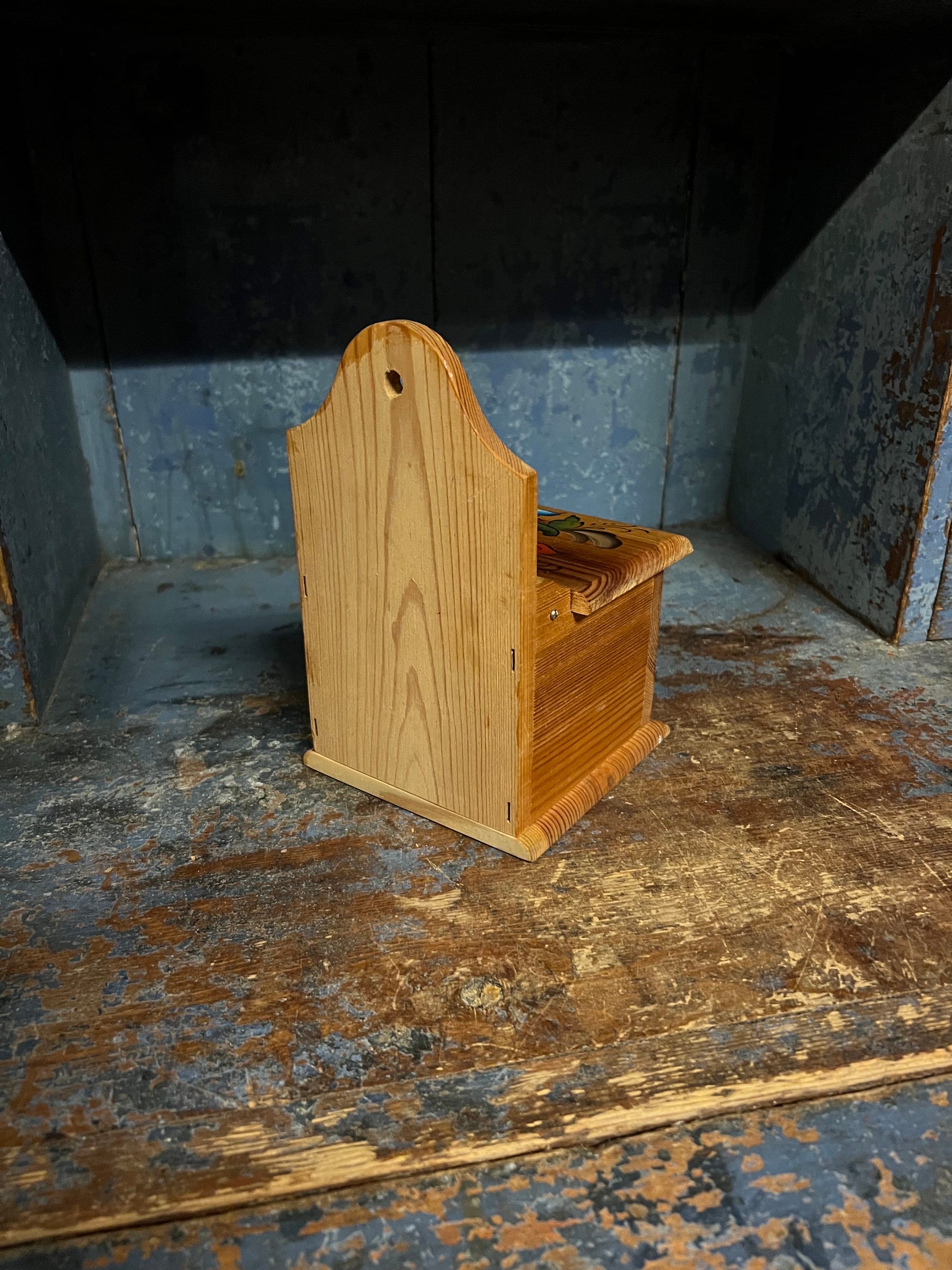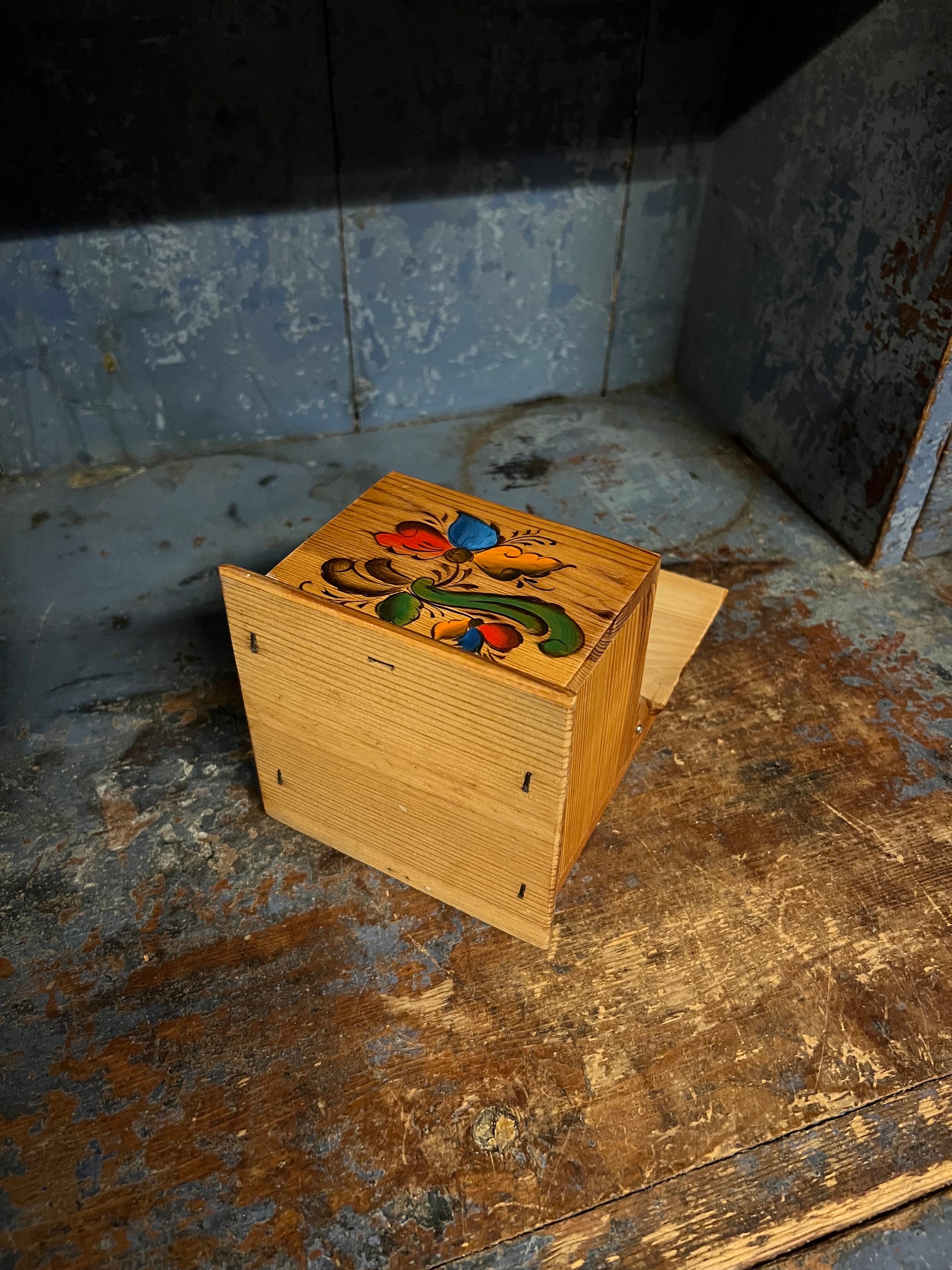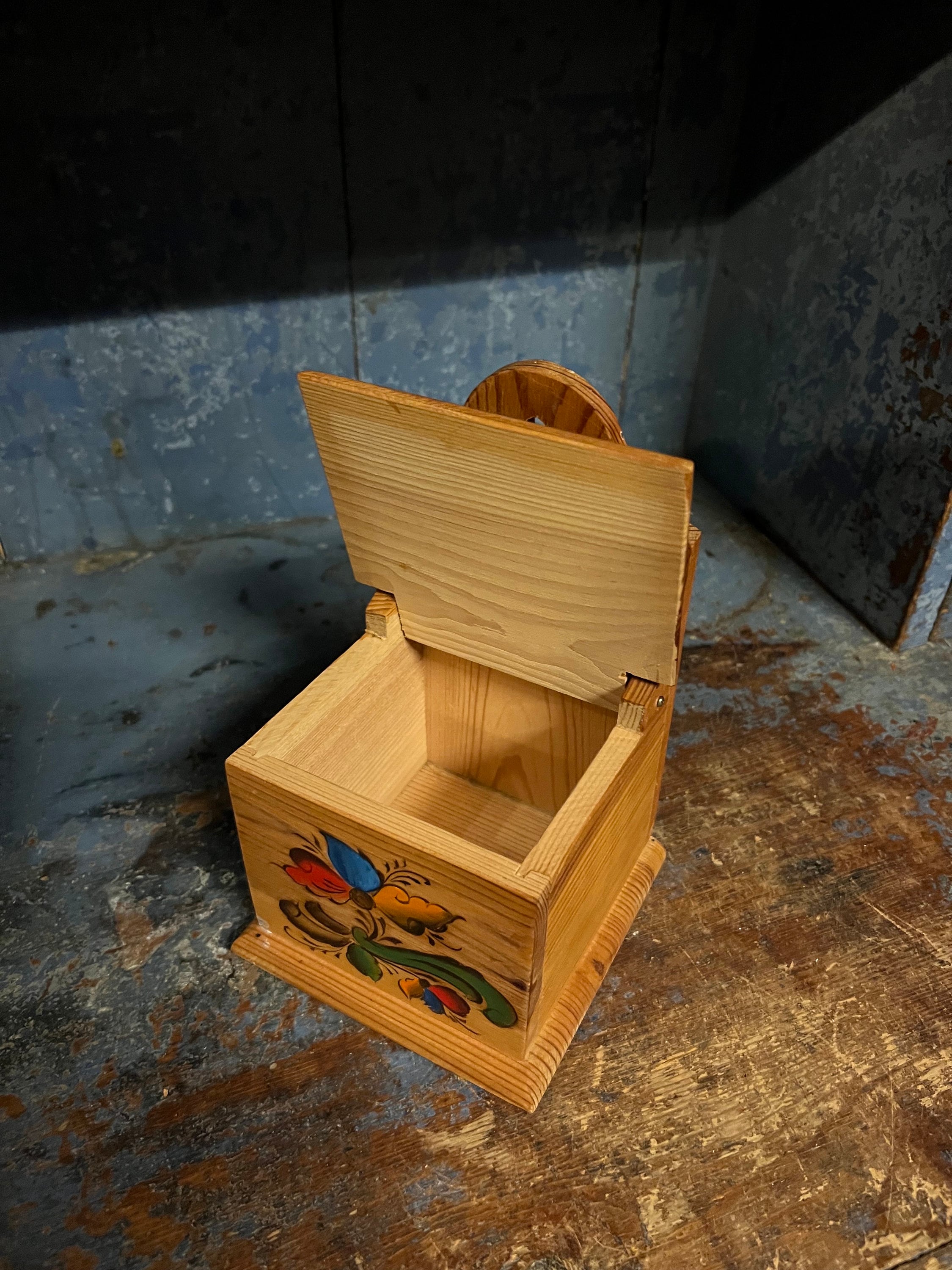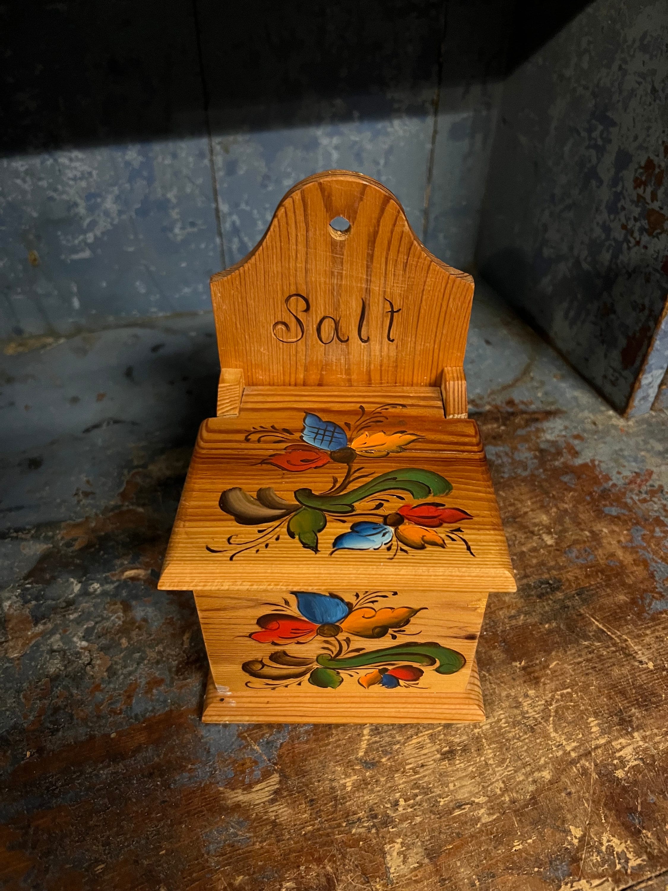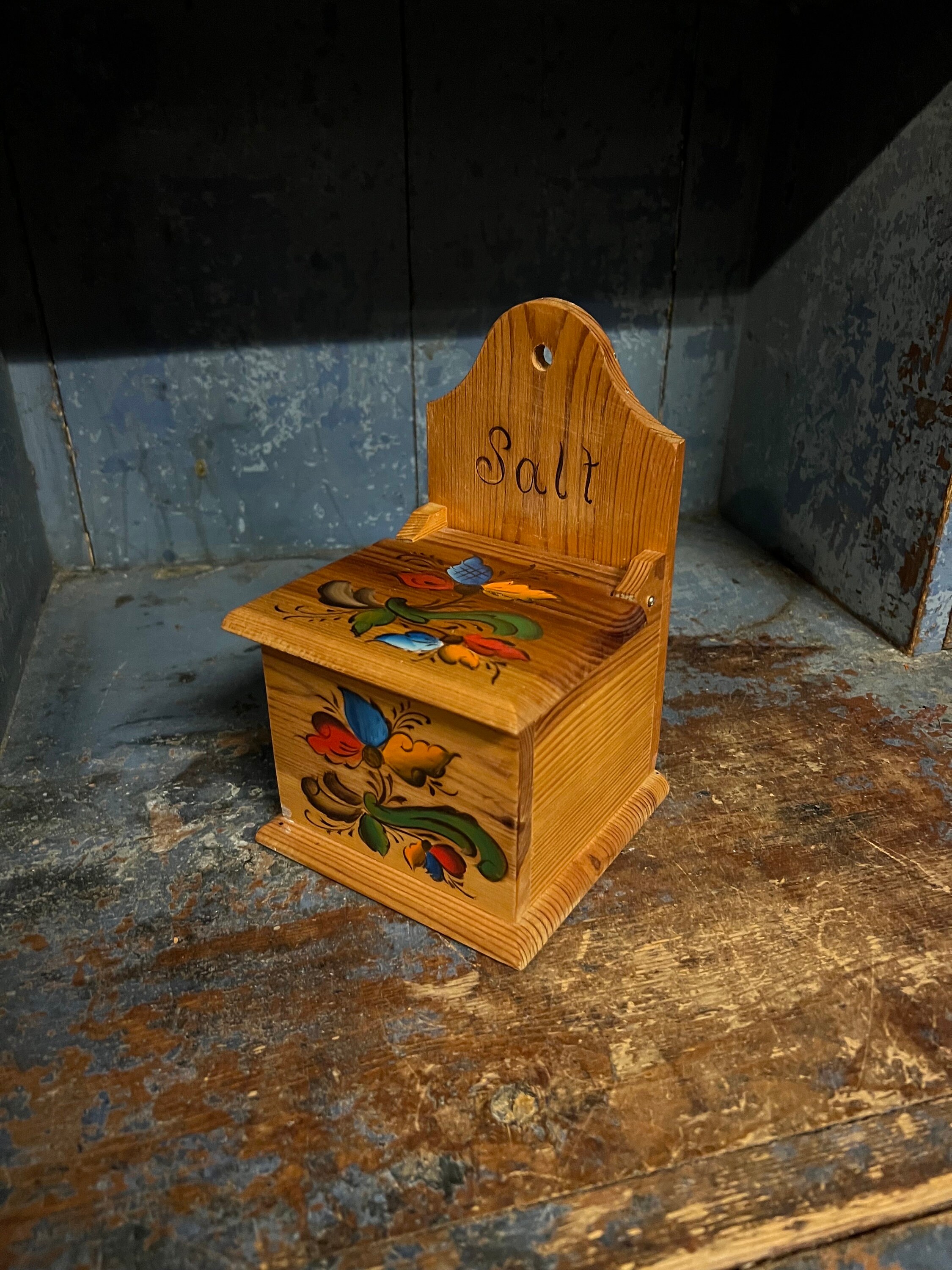 VINTAGE Handcrafted/ hand crafted / hand painted / handpainted / handmade wooden salt box/ wall decor with lid from Telemark, Norway. Professionally painted / decorated with Rosemaling pattern. Nature wood beige color with beautiful patina.