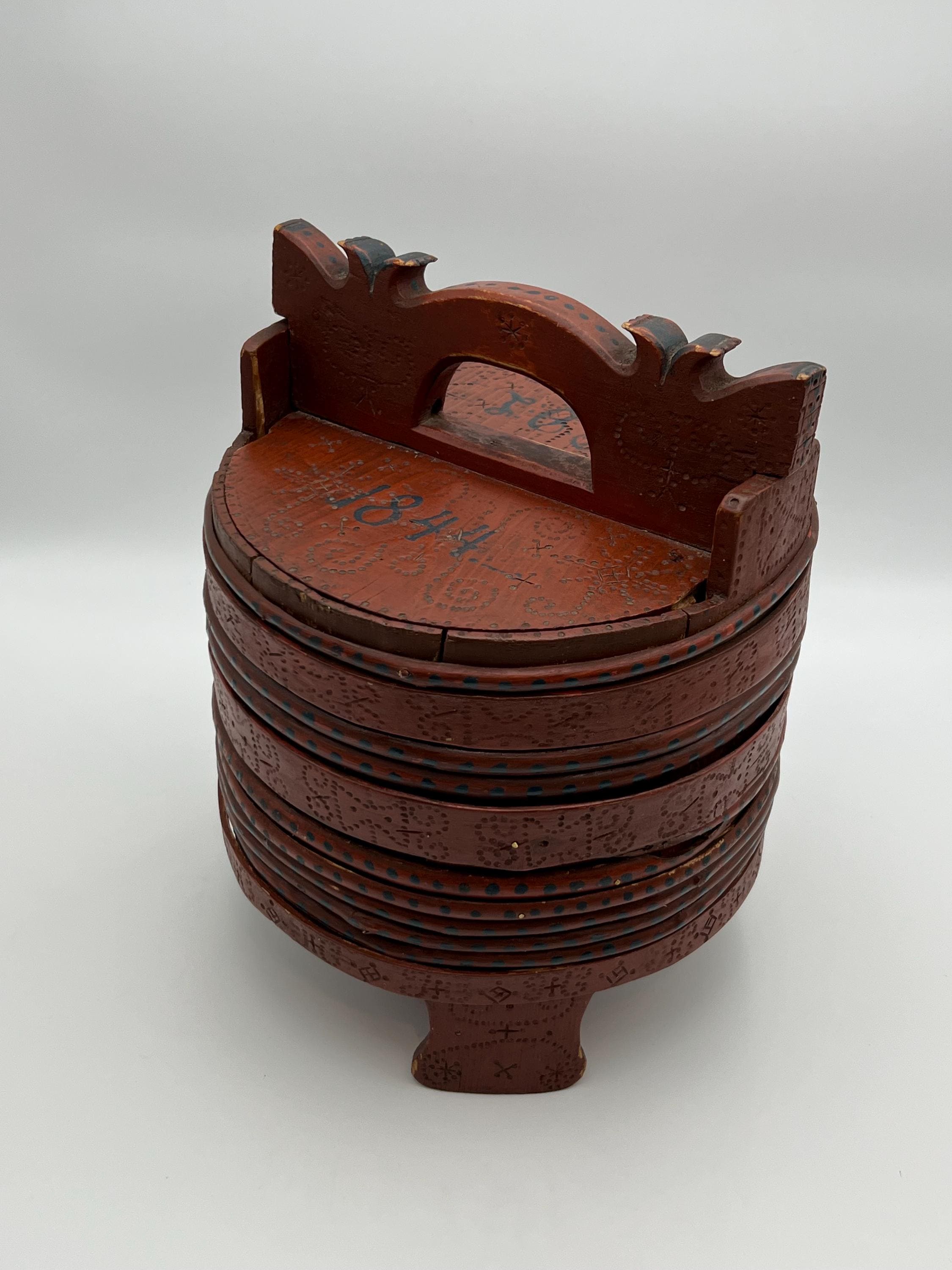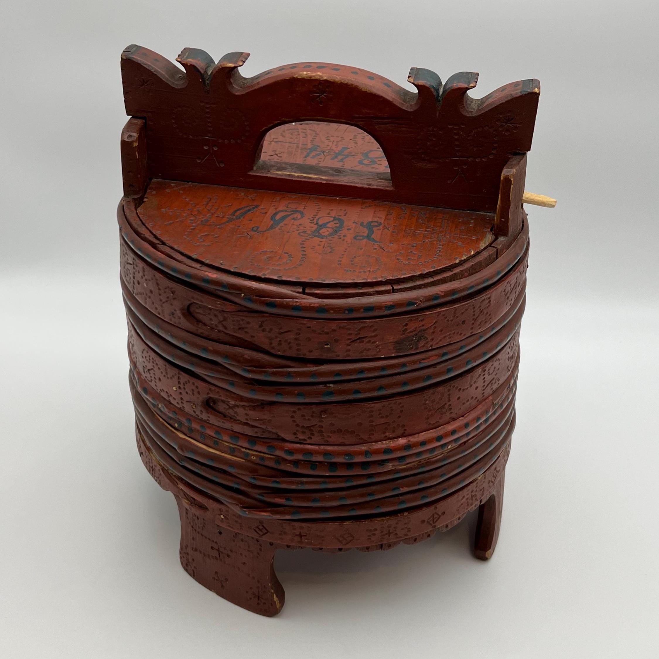 --Later painted farmhouse red and gifted in 1844 (possibly a wedding gift from parents to daughter, dated on lid with initials "I.T.D.L.")