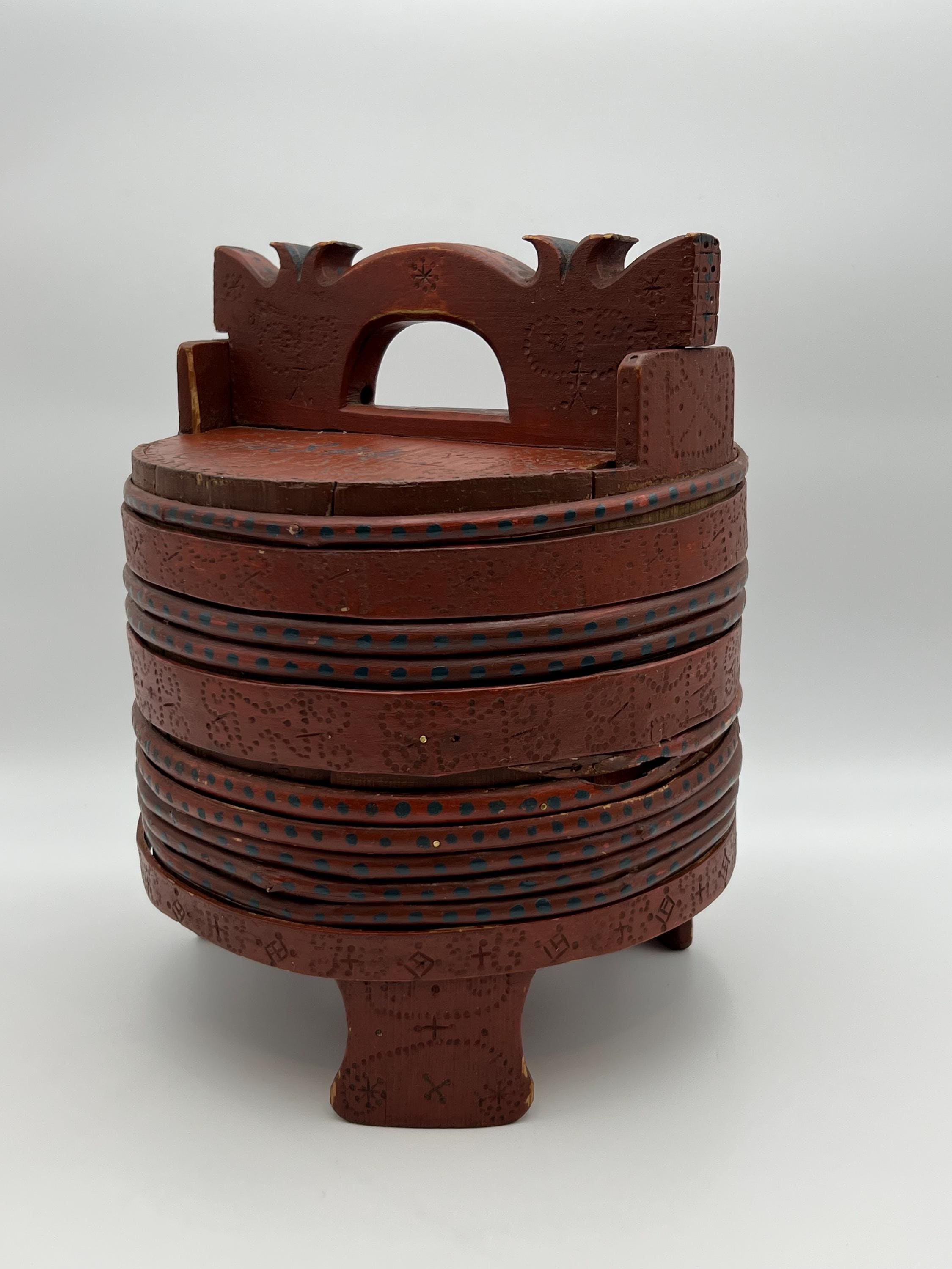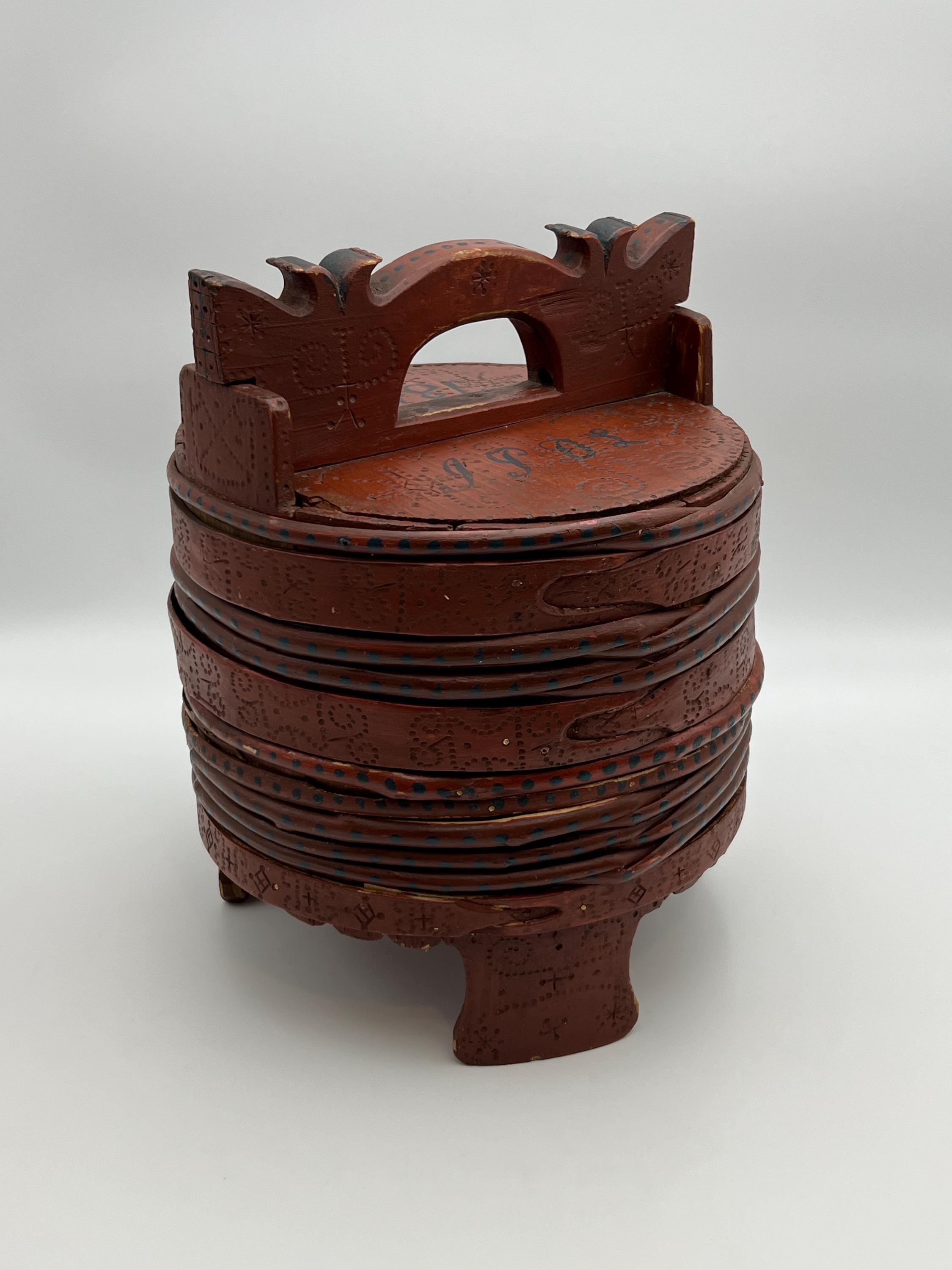A museum-quality primitive butter bucket from Telemark, Norway, hand-carved and scorched with intricate details. This rare piece features:
