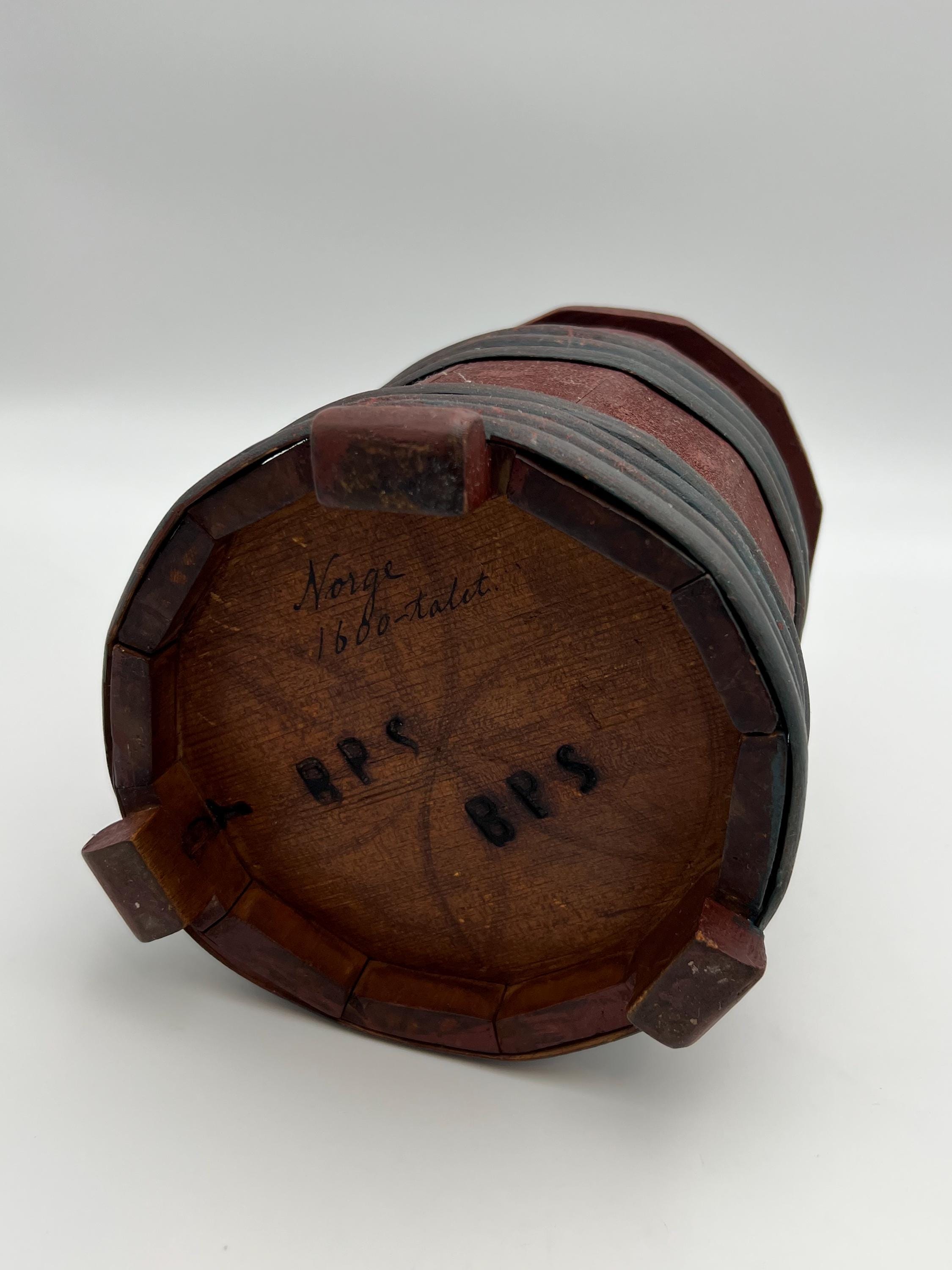 This stunning butter bucket/tankard from Norway or Iceland showcases exceptional Baroque-era craftsmanship. Handcrafted from natural pine and painted in farmhouse red with a green belt, it features: