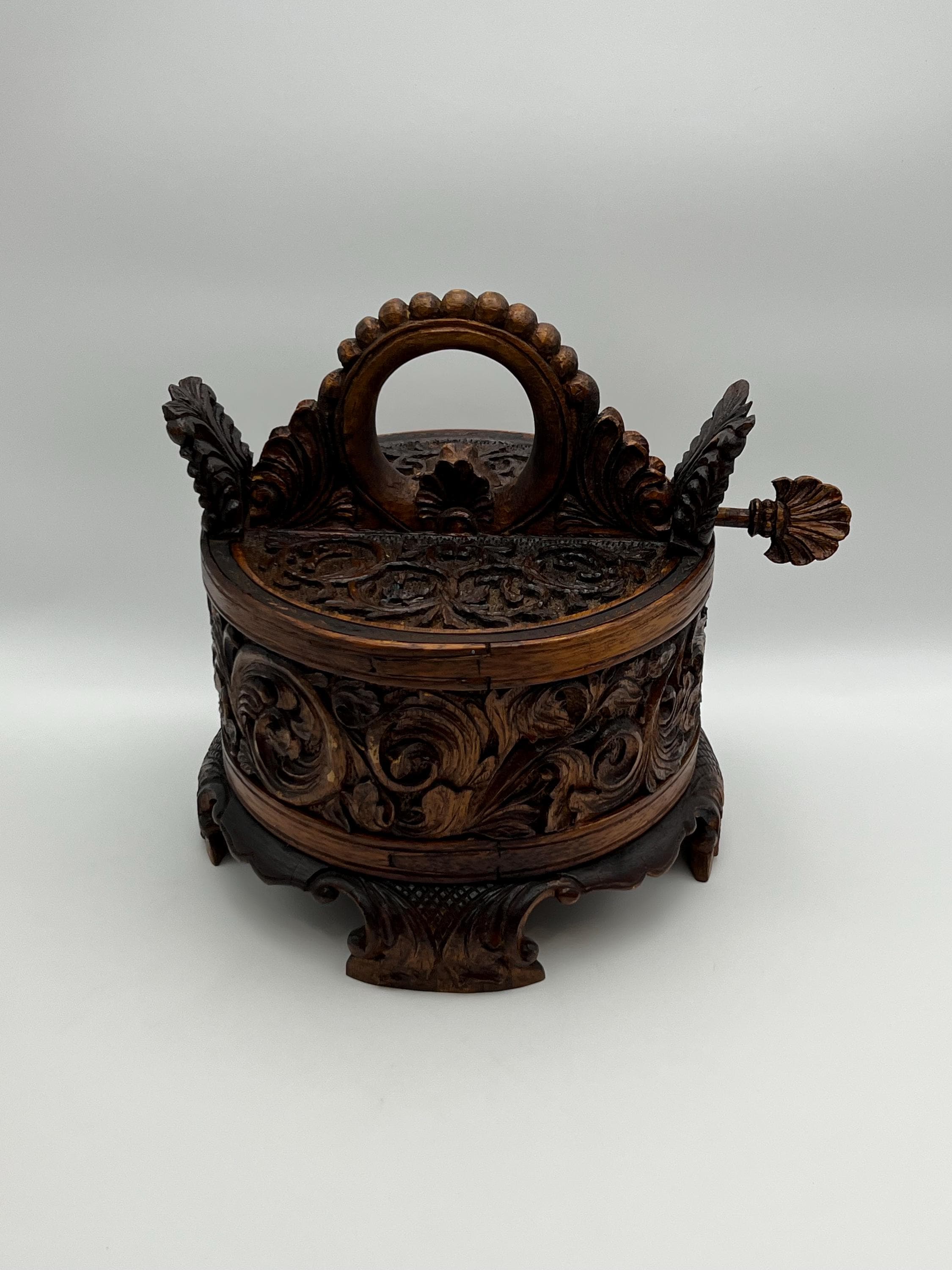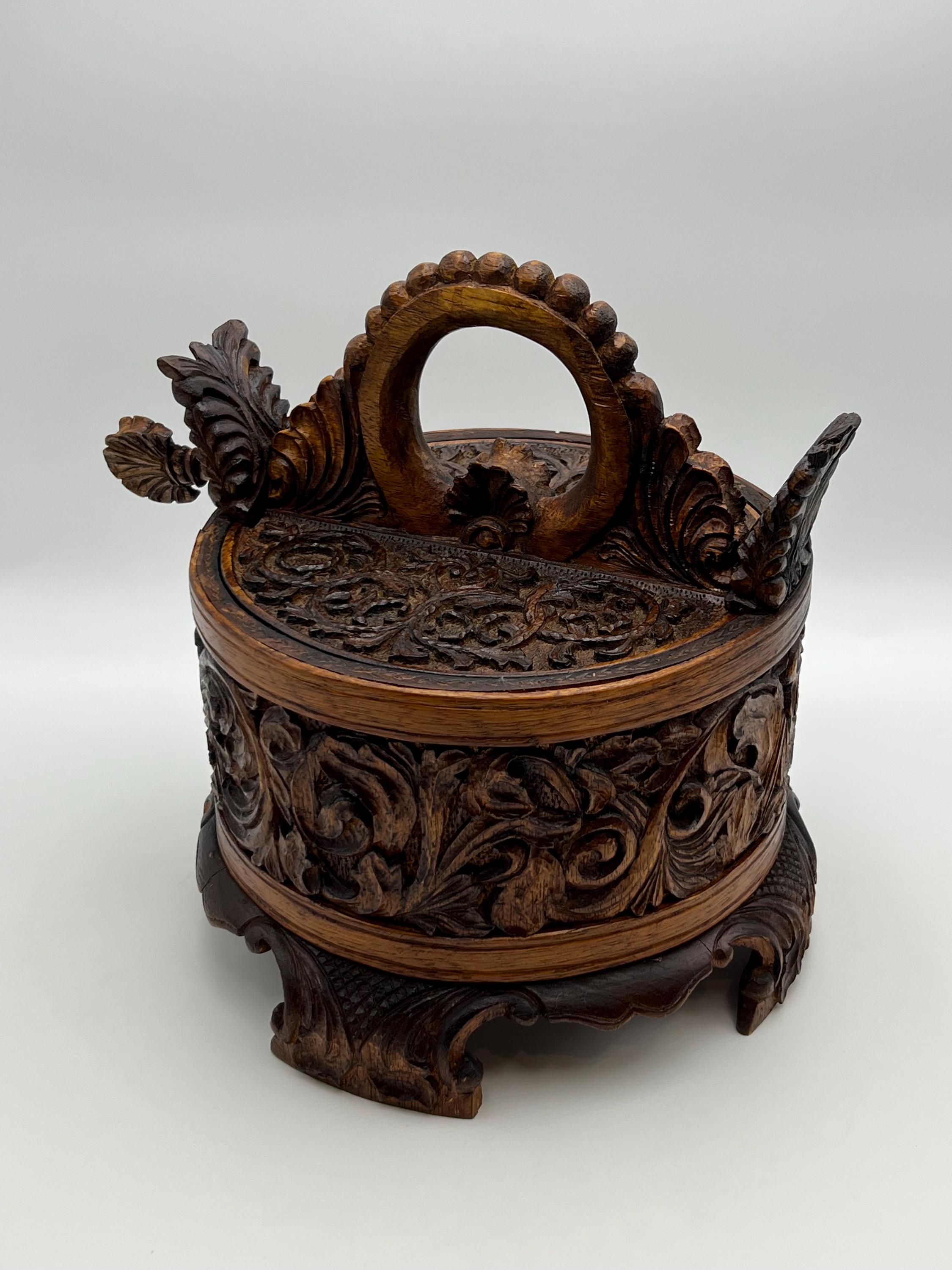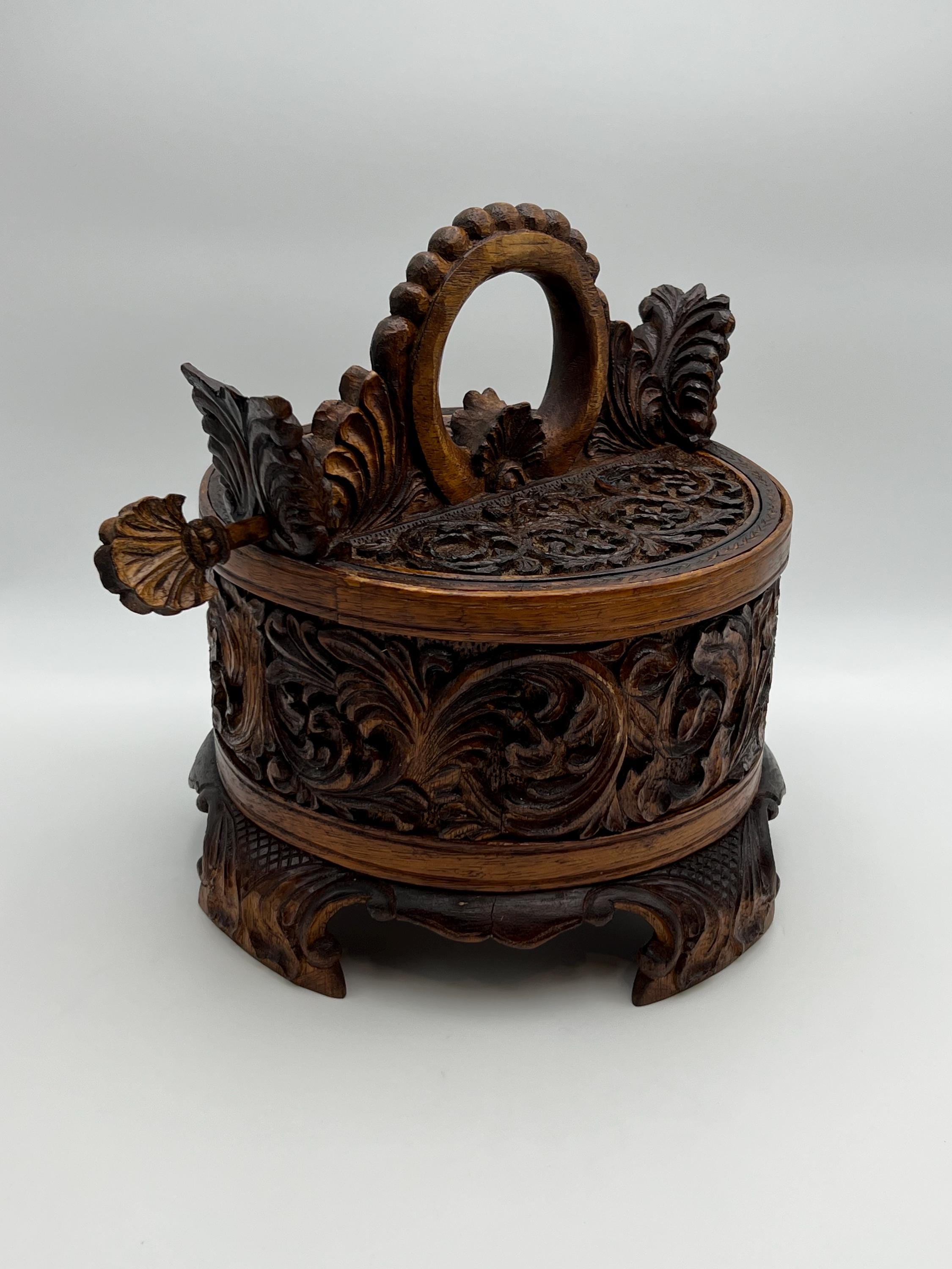 Presenting a superb example of Norwegian folk art, this hand-carved oak butter bucket (or porridge ambar) hails from the revered Gudbrandsdalen region. Dating from the turn of the 20th century / the first half of the 20th century, this piece embodies the pinnacle of Scandinavian woodcarving tradition, where functional form meets extraordinary artistry. Its exceptional state of preservation and masterful execution place it firmly in the realm of museum-quality collectibles.