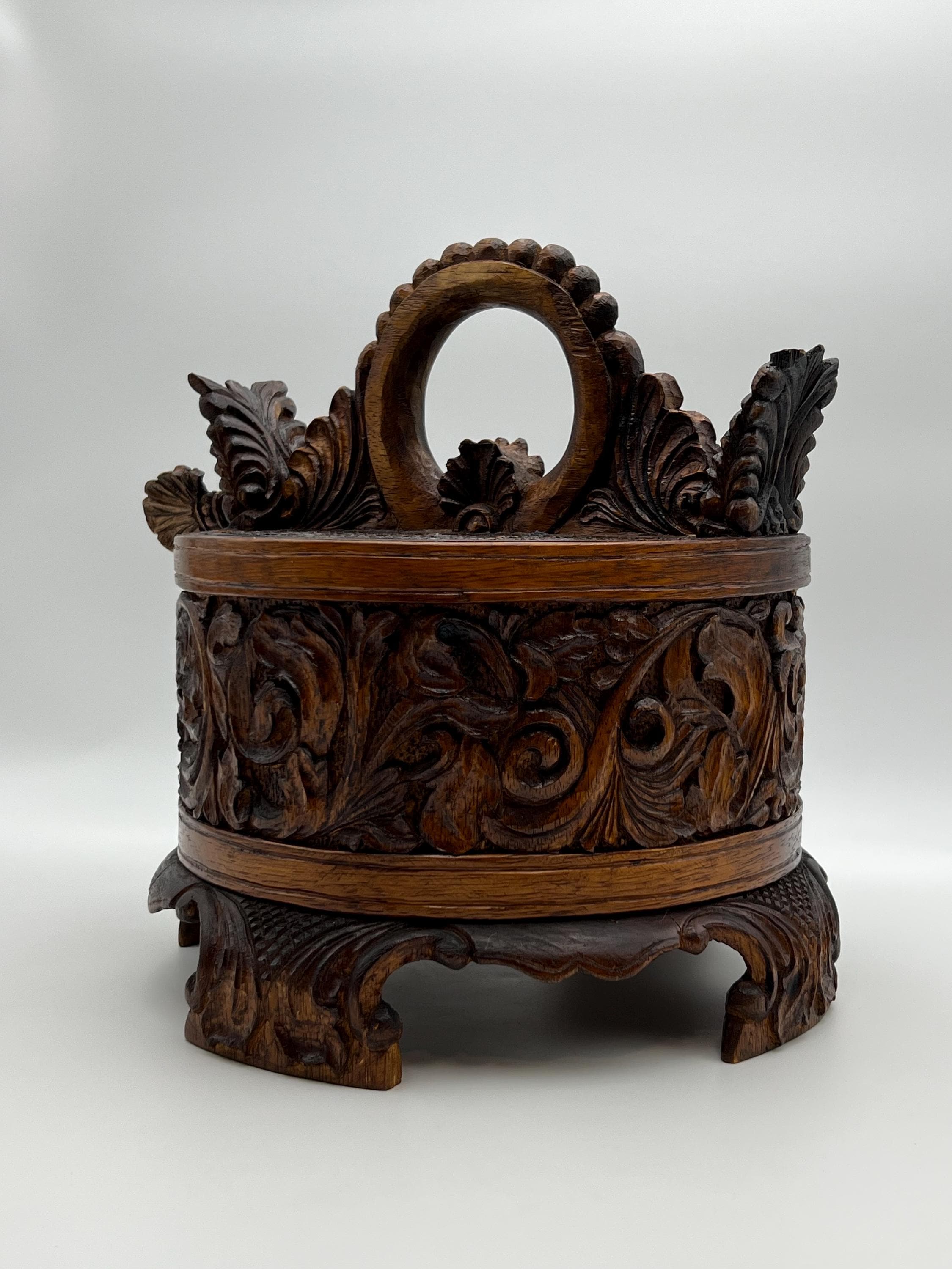Crafted from premium oak, the bucket is a tour de force of traditional relief carving. The body is enveloped by an elaborate, deeply etched motif of swirling acanthus vines—a signature of the Gudbrandsdalen style. Each precise, fluid cut demonstrates the artisan's unparalleled skill and dedication, transforming a utilitarian object into a sculptural masterpiece.