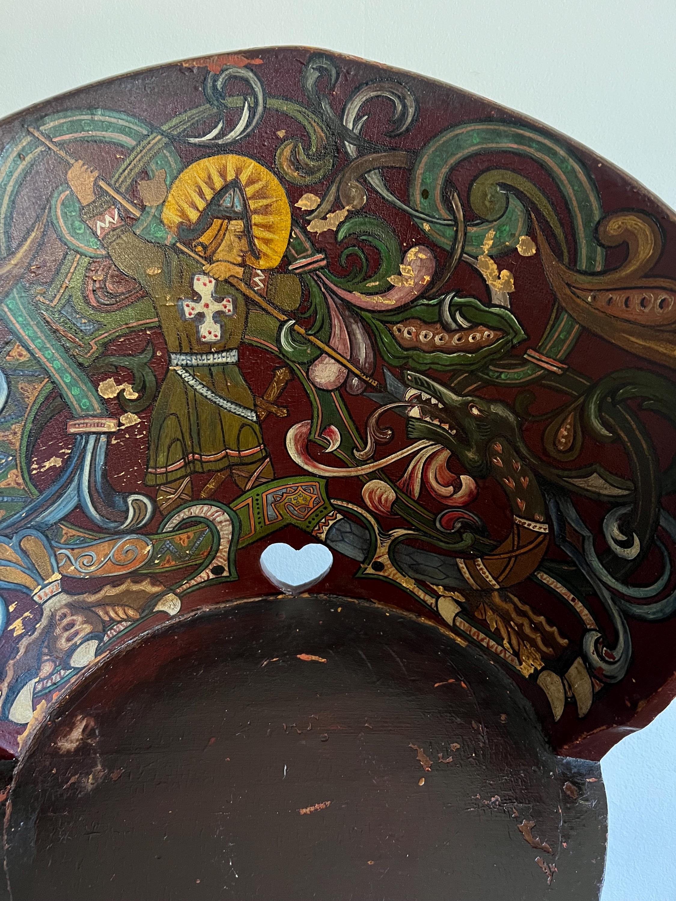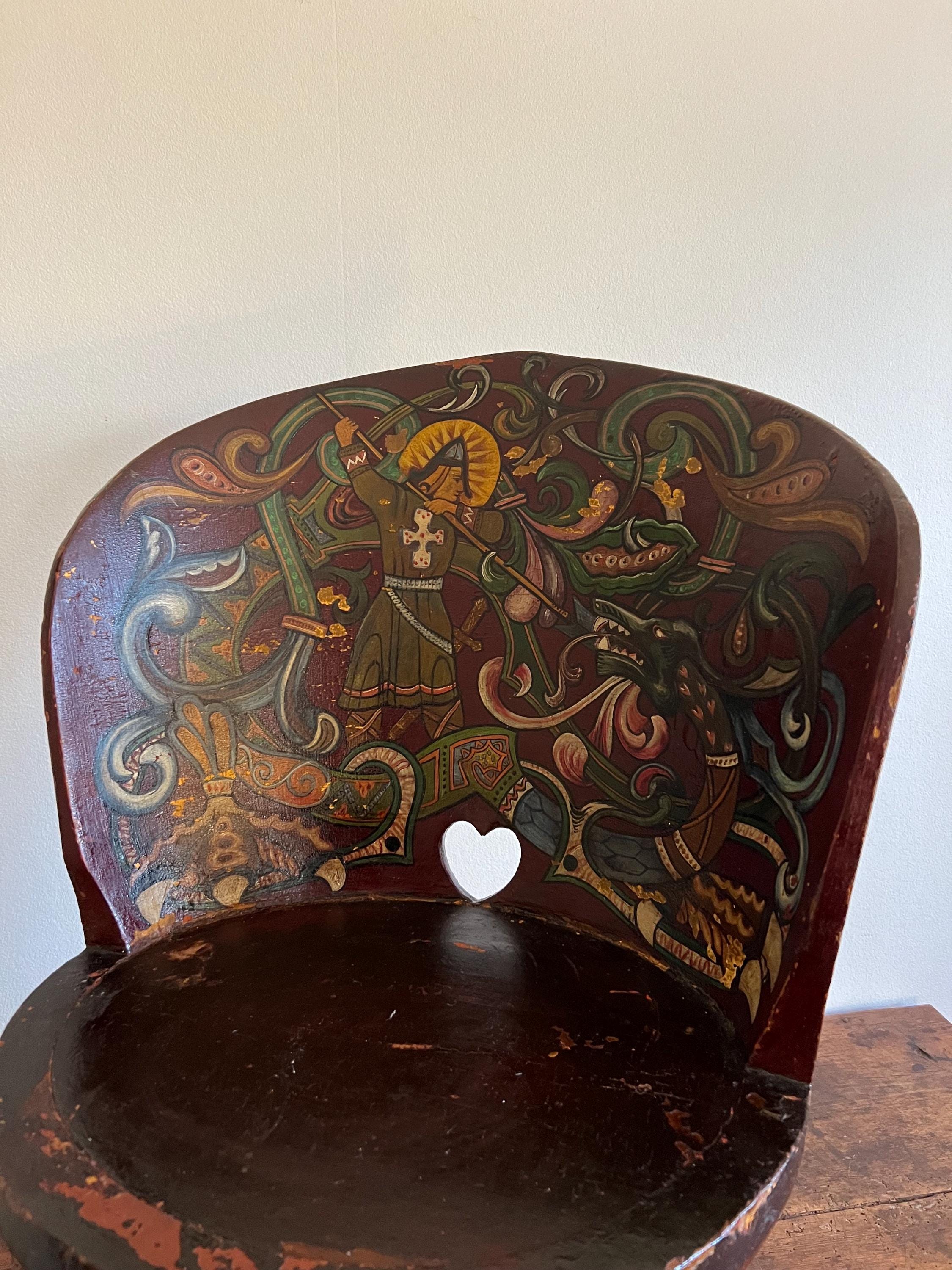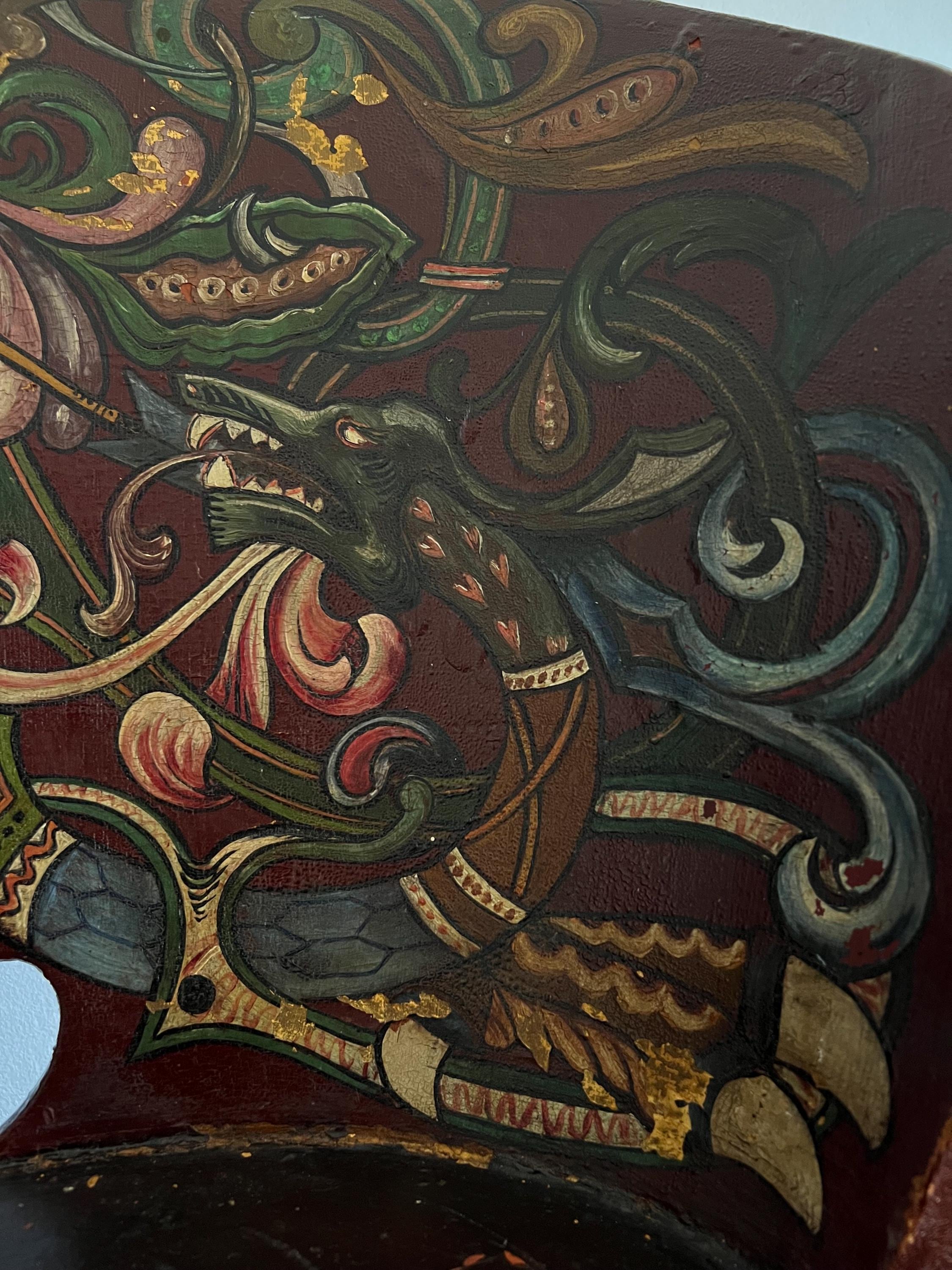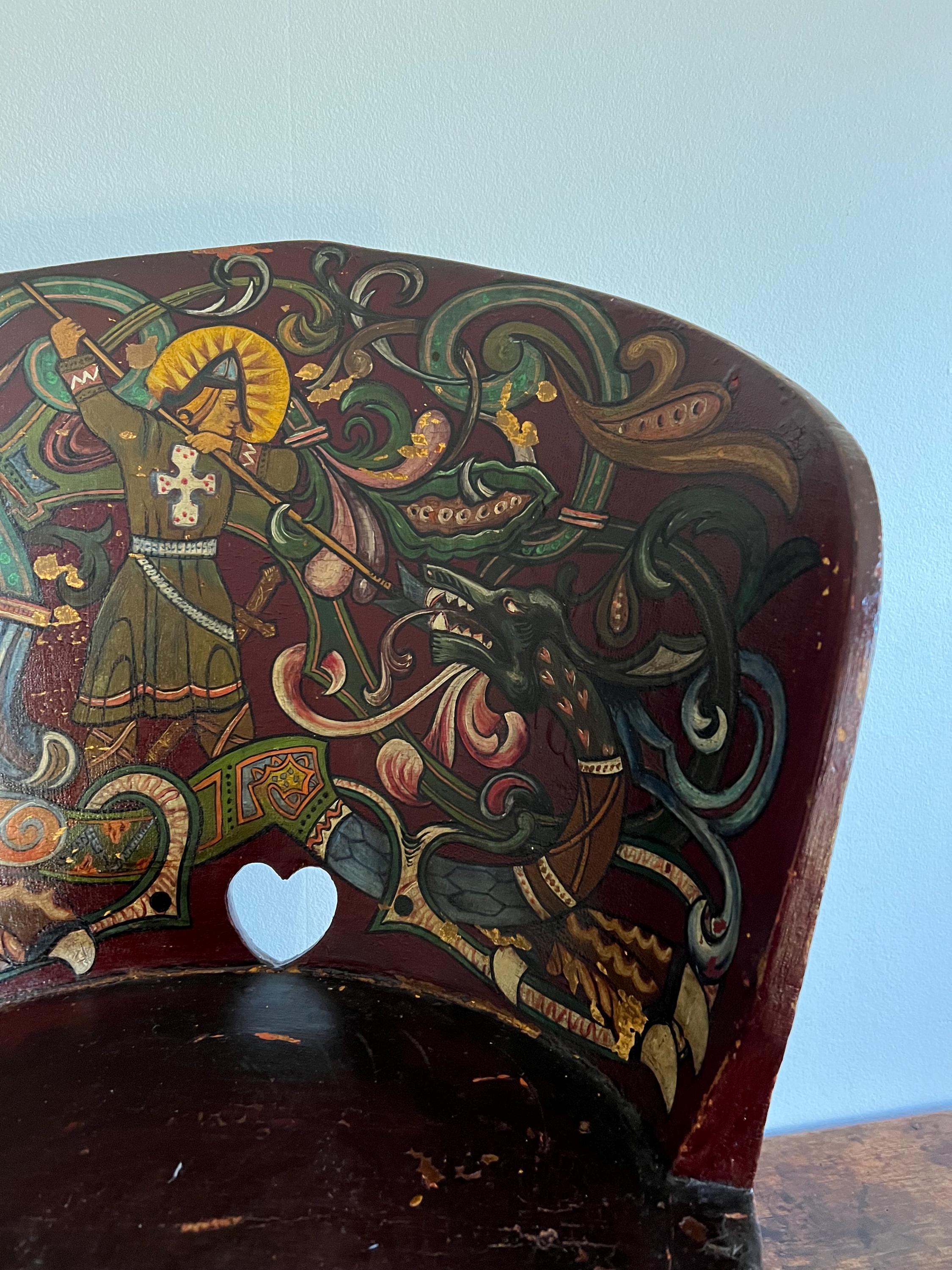 Distinguished by its professionally painted National Romantic decoration, the piece features a dynamic folk art motif of Saint George or Viking Warrior and the Dragon, rendered with scrollwork, floral elements, and vibrant accents over a deep farmhouse red ground. The painting, dated 1911 on the reverse of the chair, retains a superb antique patina with subtle, age-appropriate fading, enhancing its authentic character.