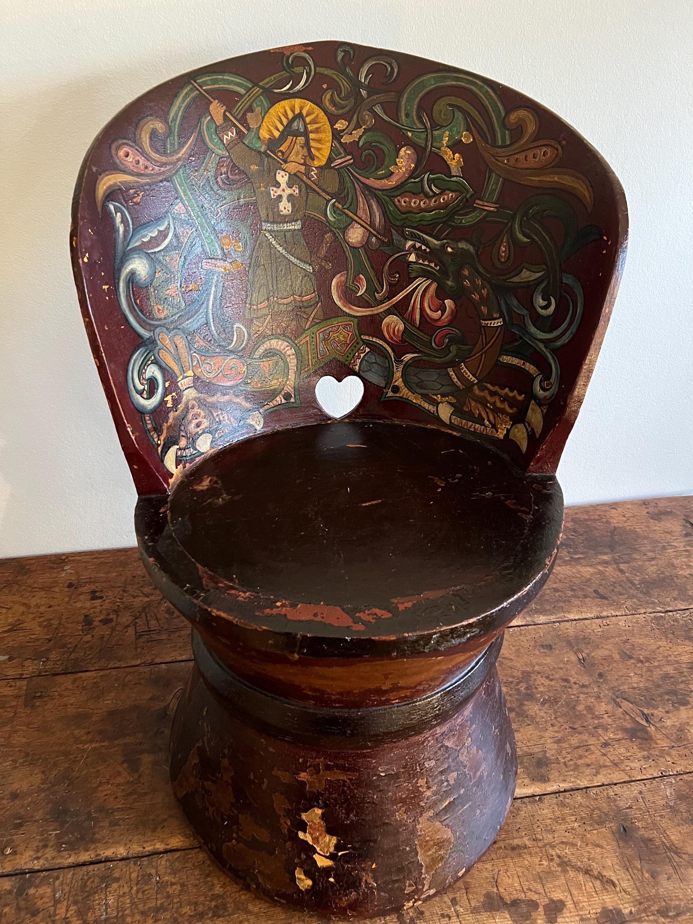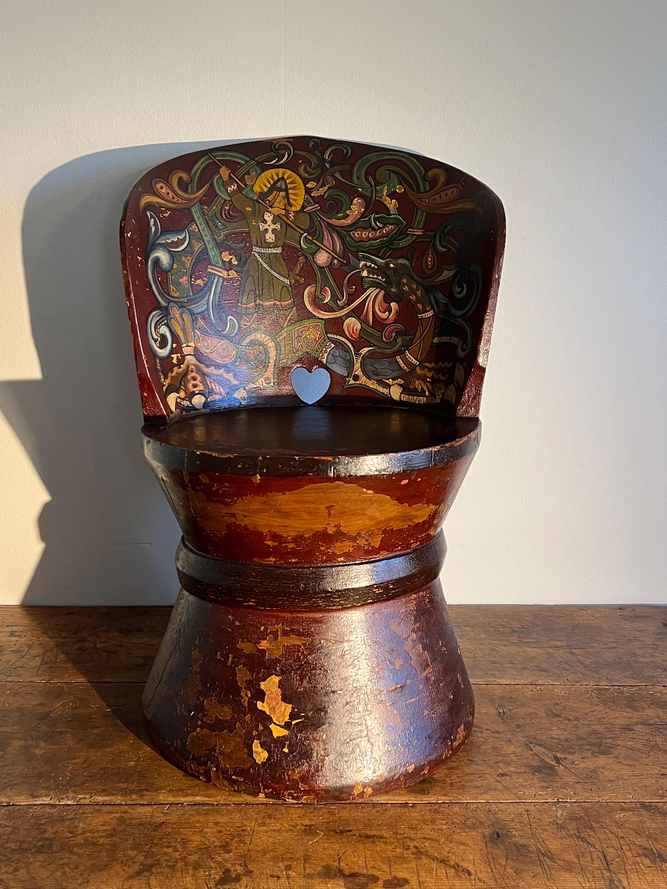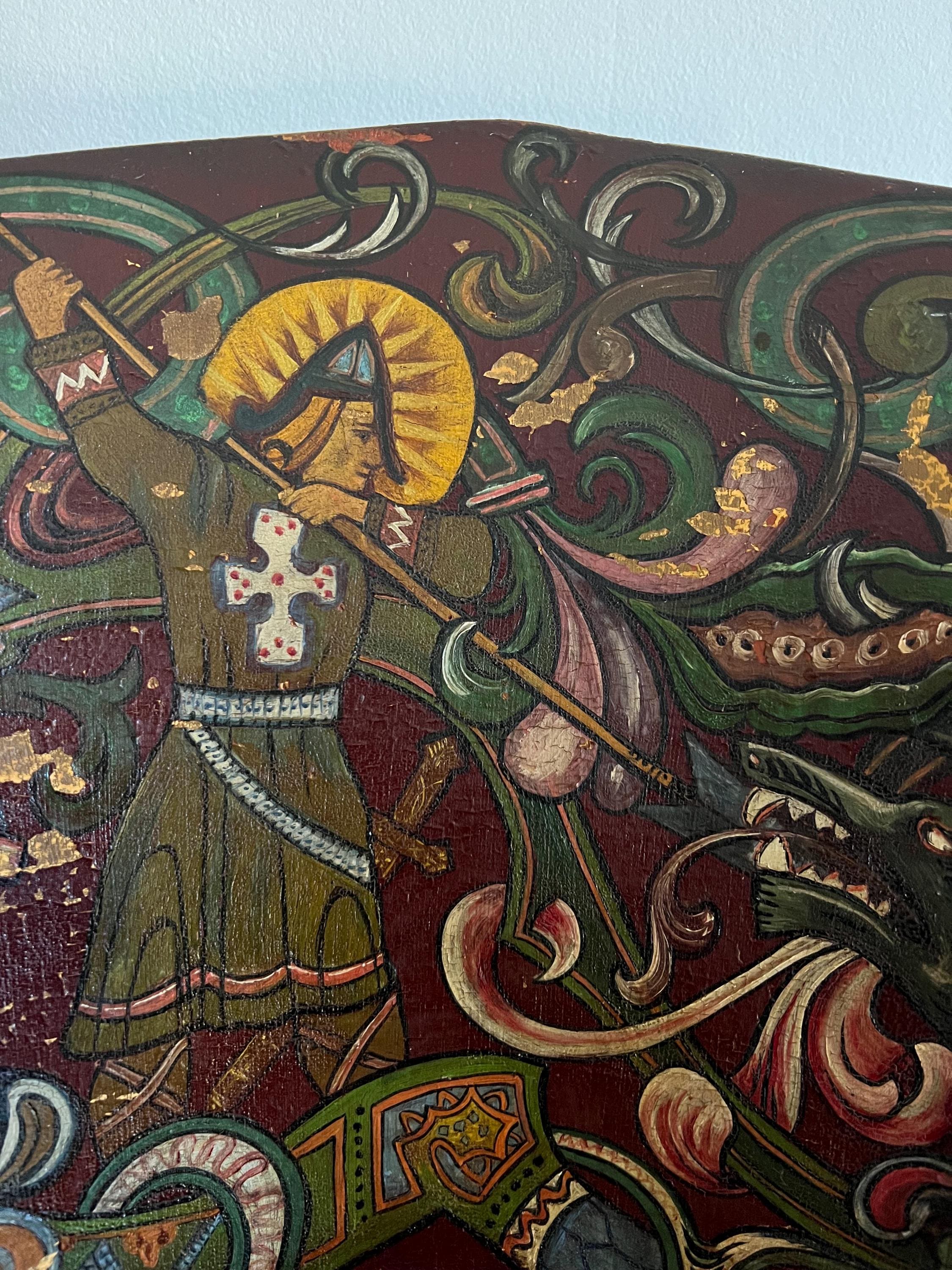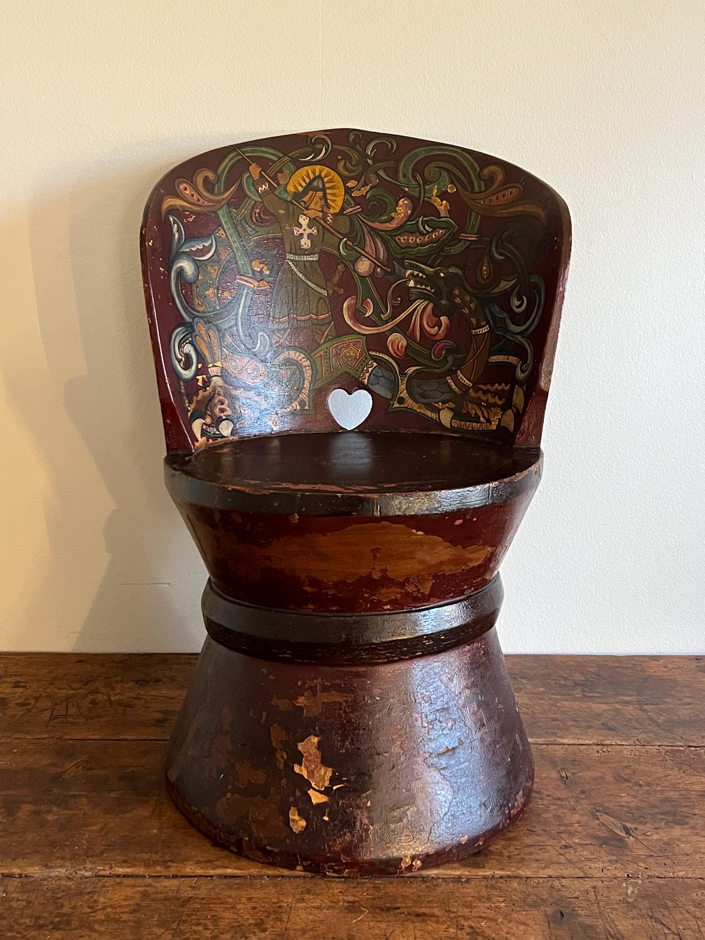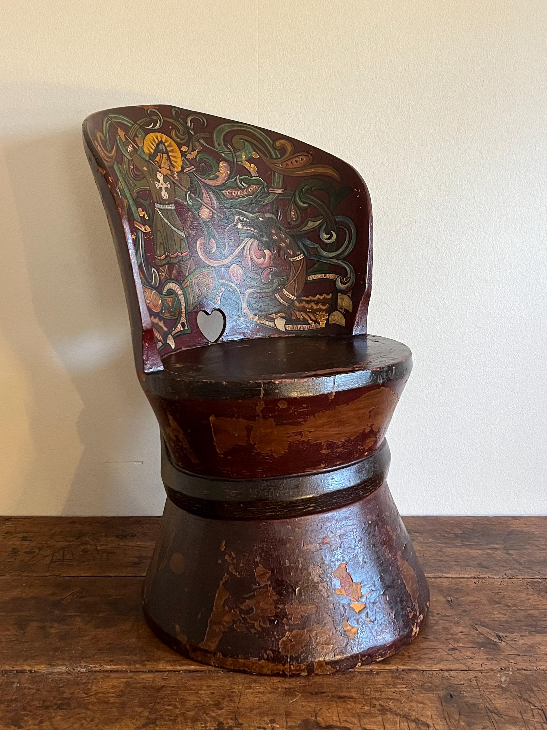 Distinguished by its professionally painted National Romantic decoration, the piece features a dynamic folk art motif of Saint George or Viking Warrior and the Dragon, rendered with scrollwork, floral elements, and vibrant accents over a deep farmhouse red ground. The painting, dated 1911 on the reverse of the chair, retains a superb antique patina with subtle, age-appropriate fading, enhancing its authentic character.