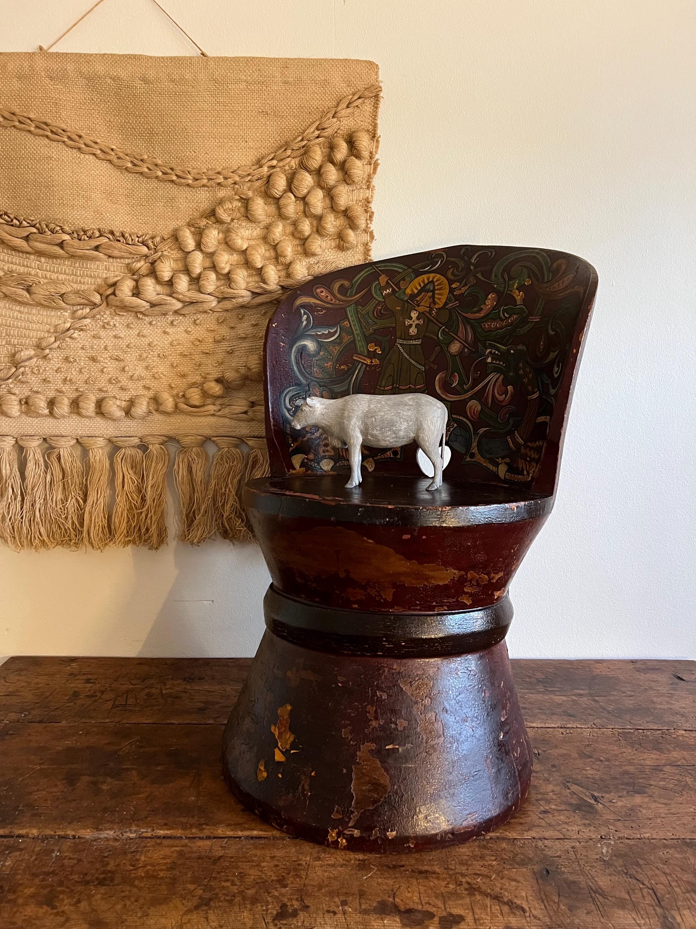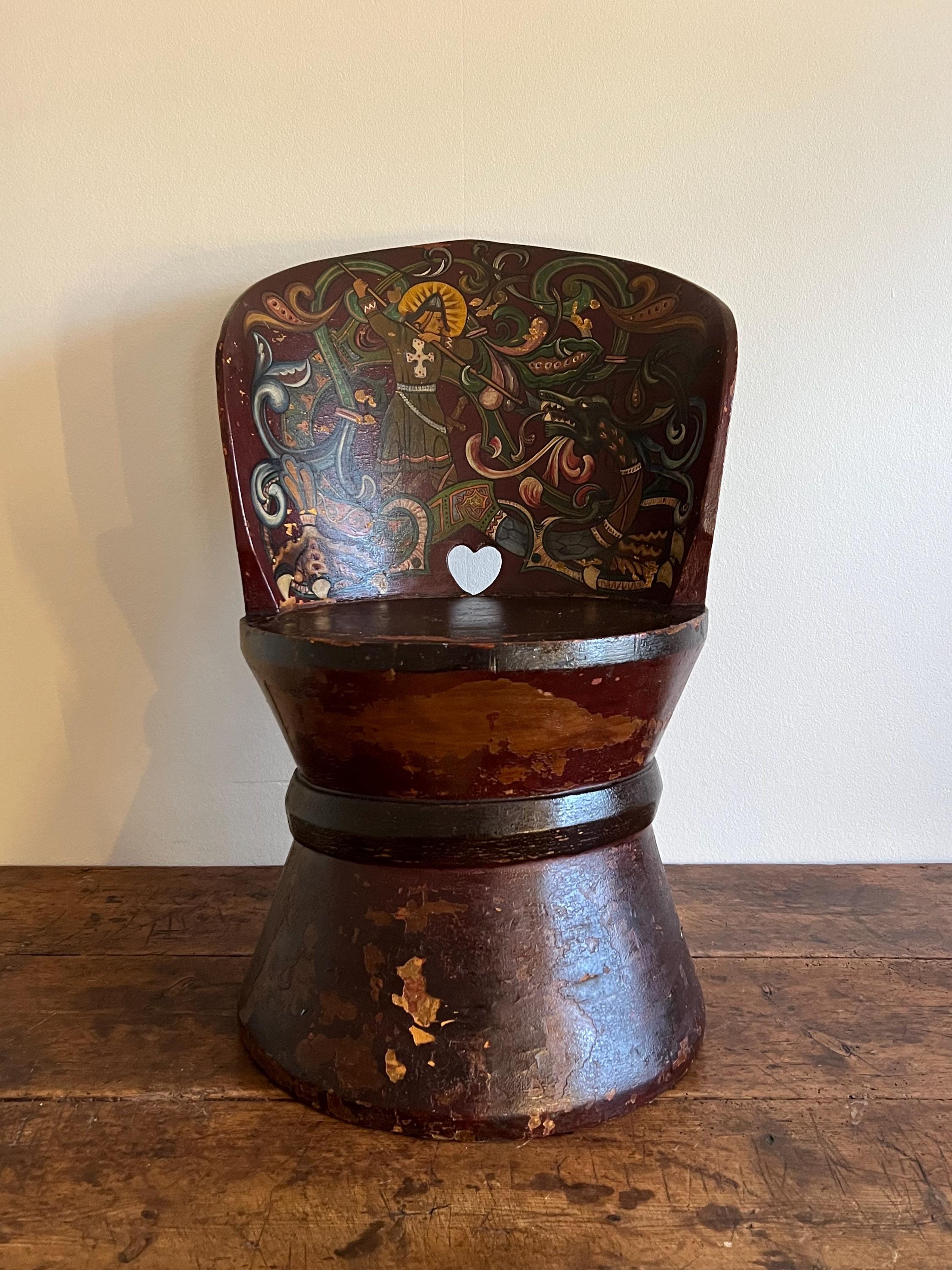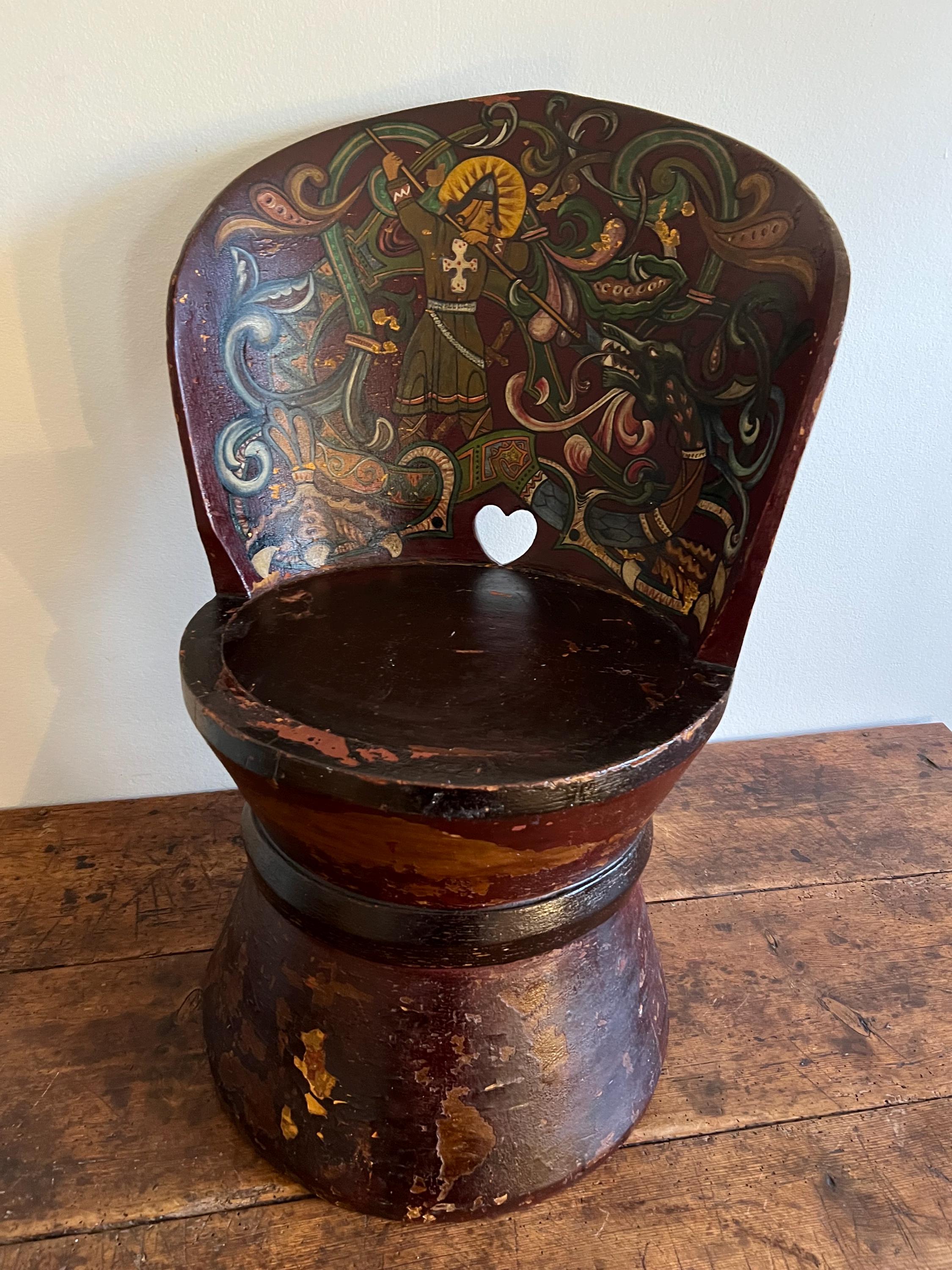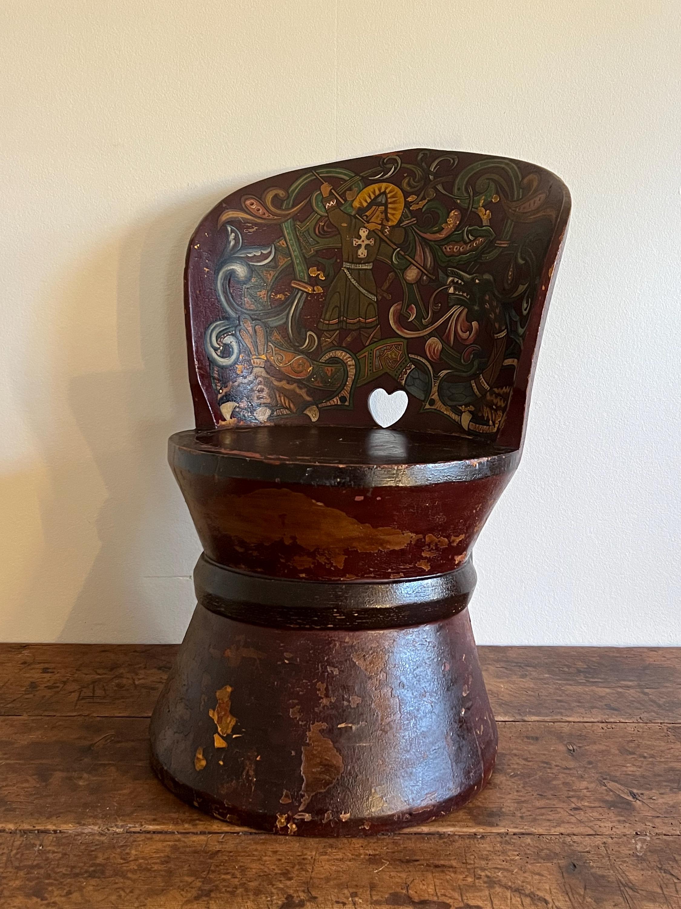 Distinguished by its professionally painted National Romantic decoration, the piece features a dynamic folk art motif of Saint George or Viking Warrior and the Dragon, rendered with scrollwork, floral elements, and vibrant accents over a deep farmhouse red ground. The painting, dated 1911 on the reverse of the chair, retains a superb antique patina with subtle, age-appropriate fading, enhancing its authentic character.