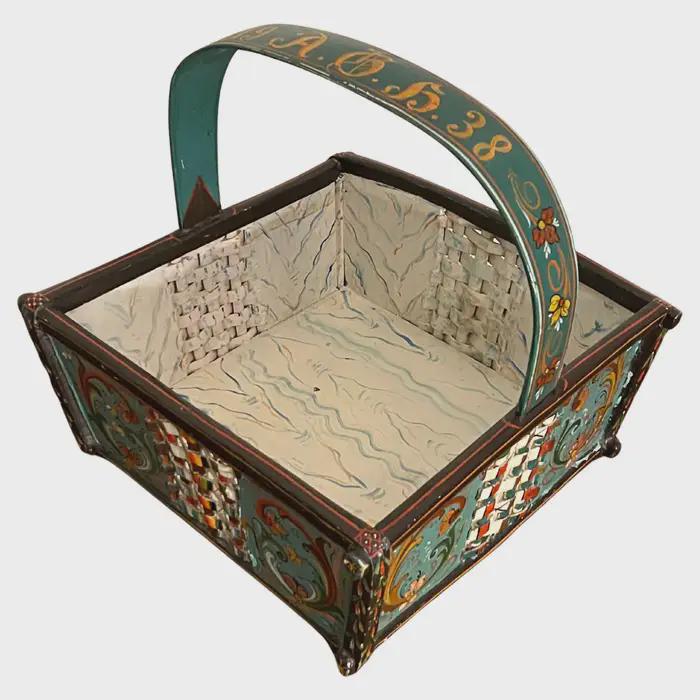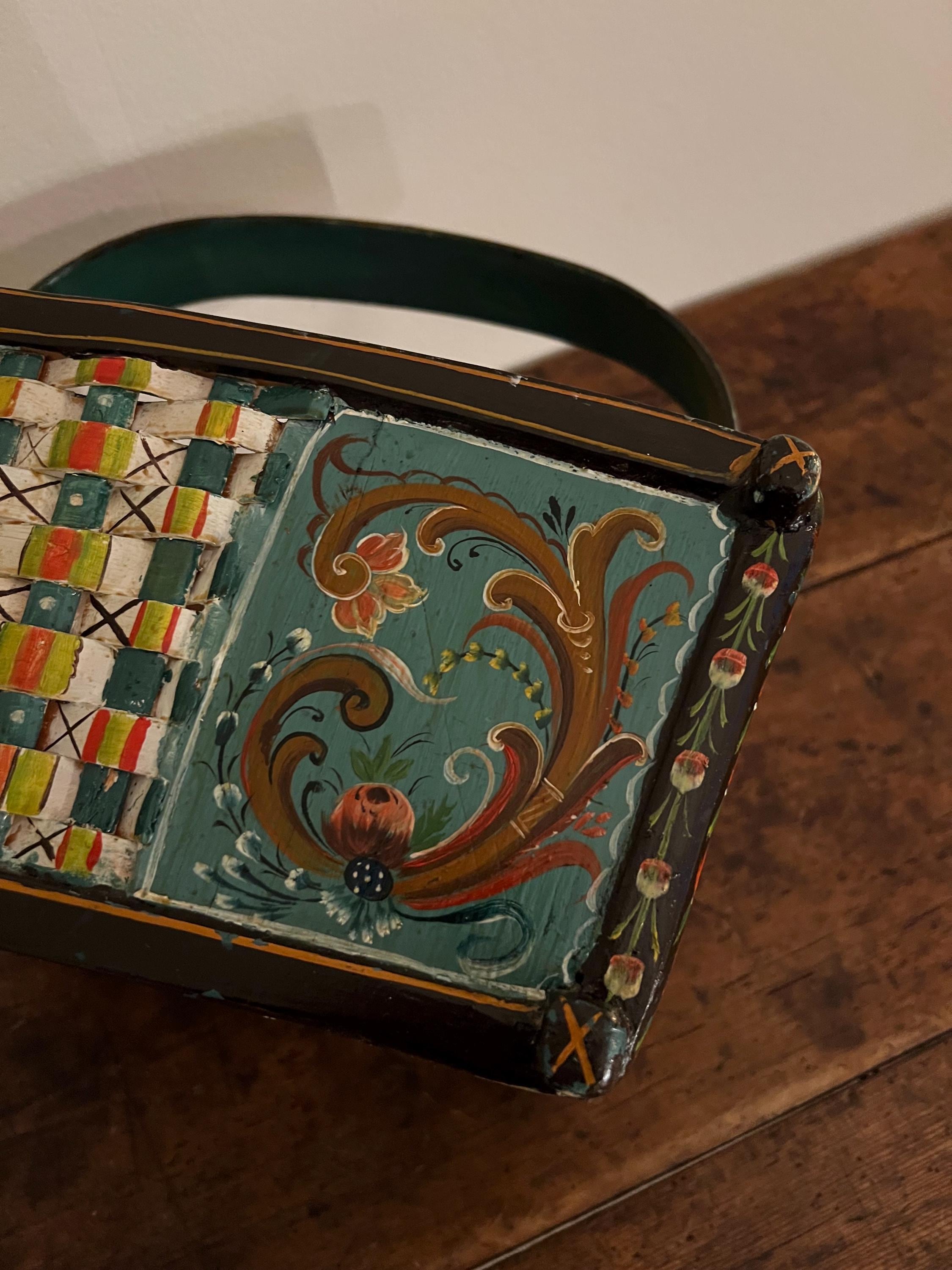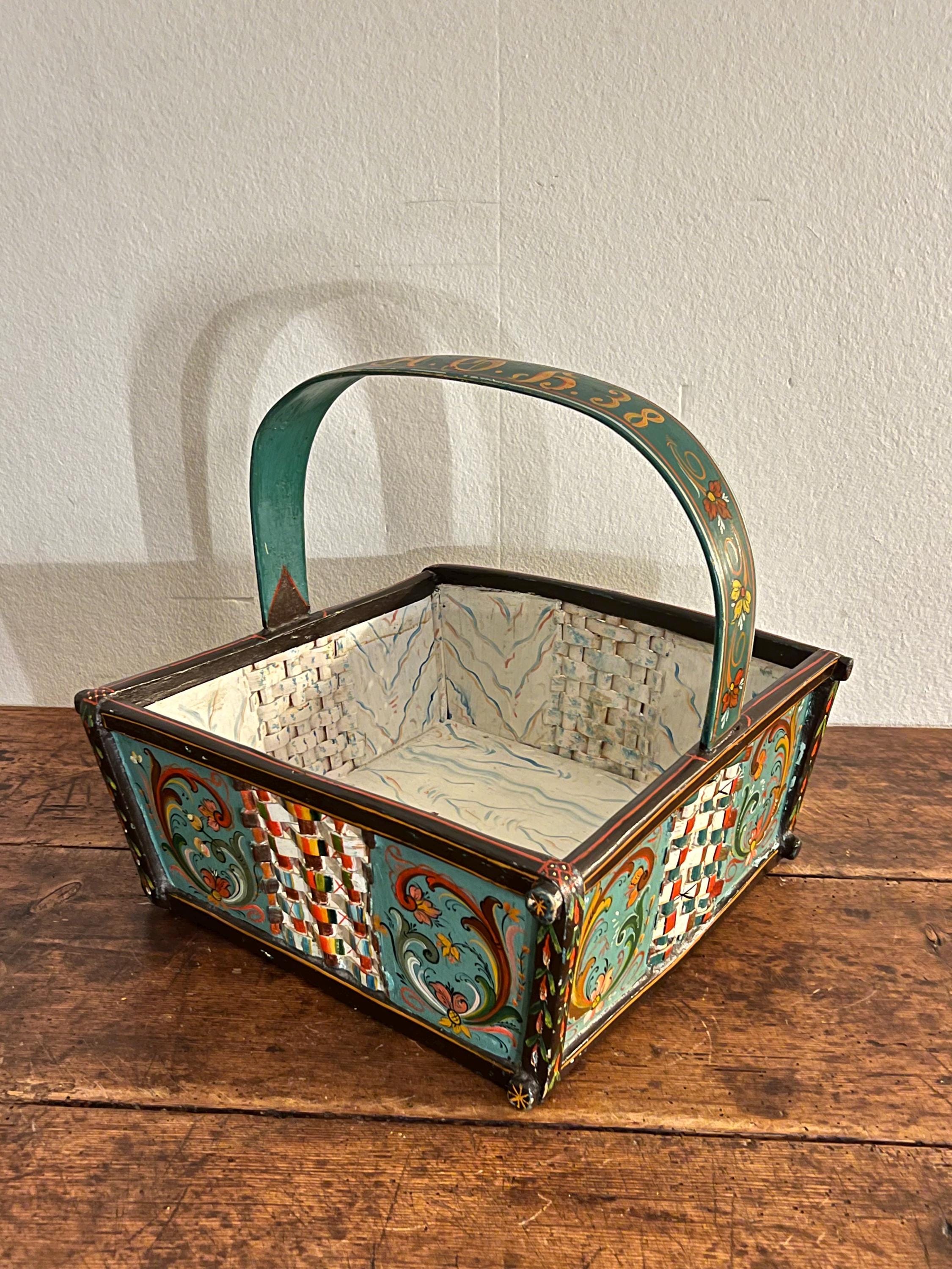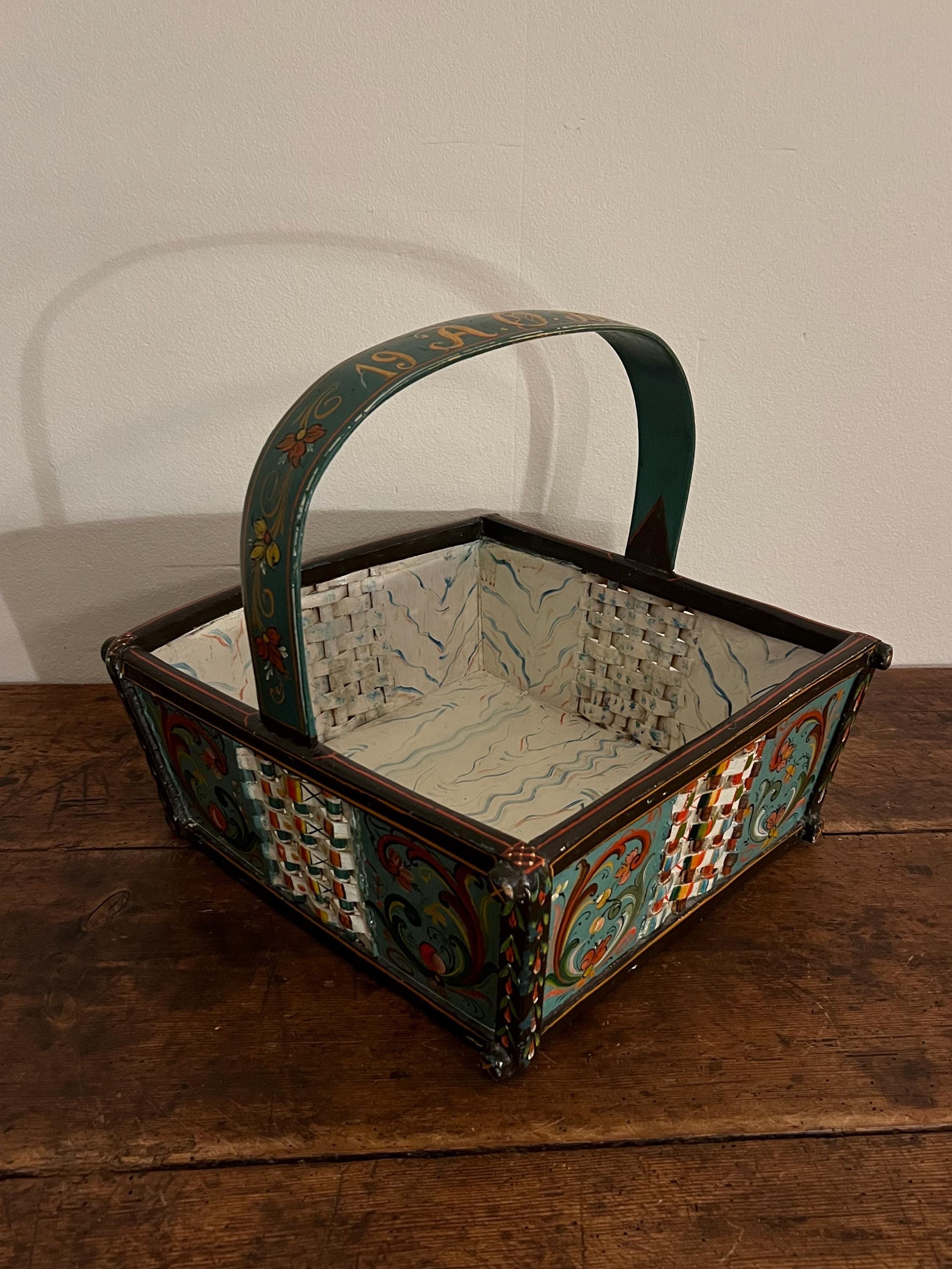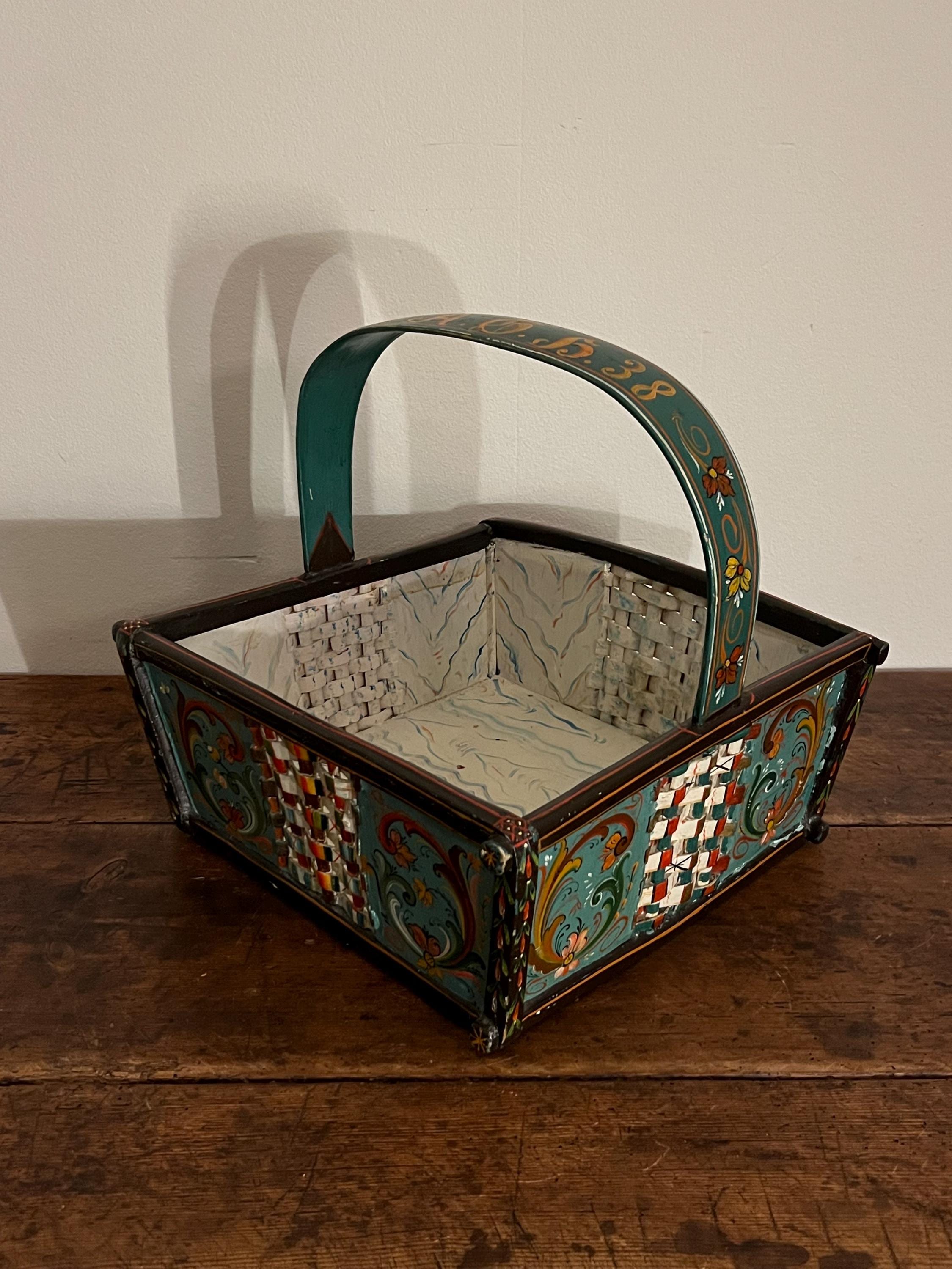 This exceptional handcrafted wooden basket represents a masterwork of traditional Norwegian craftsmanship. Hand-crafted in 1938 or earlier, and painted in 1938 by a skilled rosemaler from Telemark, it stands as both a functional object and a preserved artifact of Scandinavian folk art.