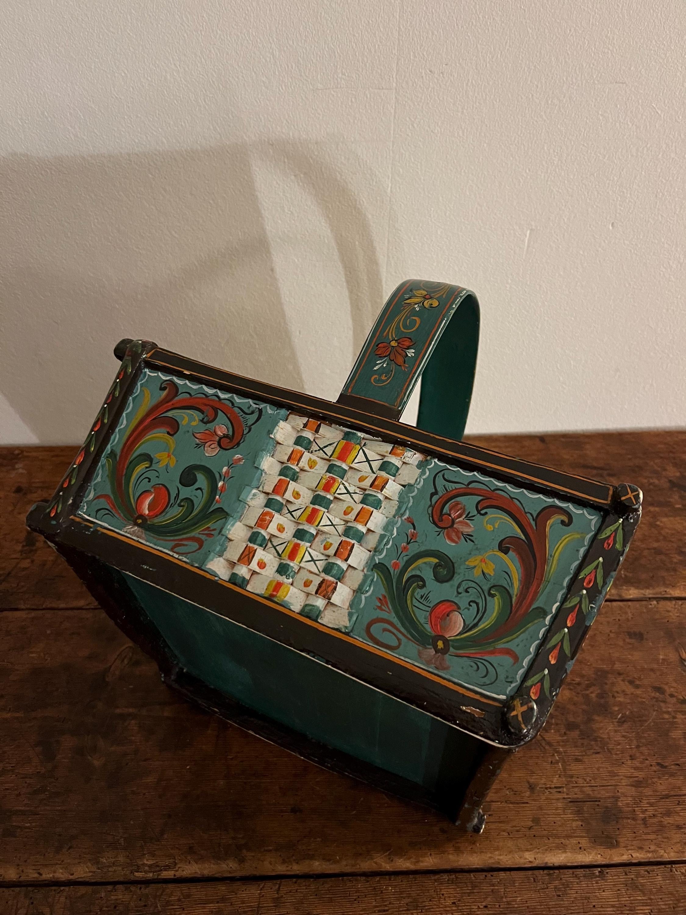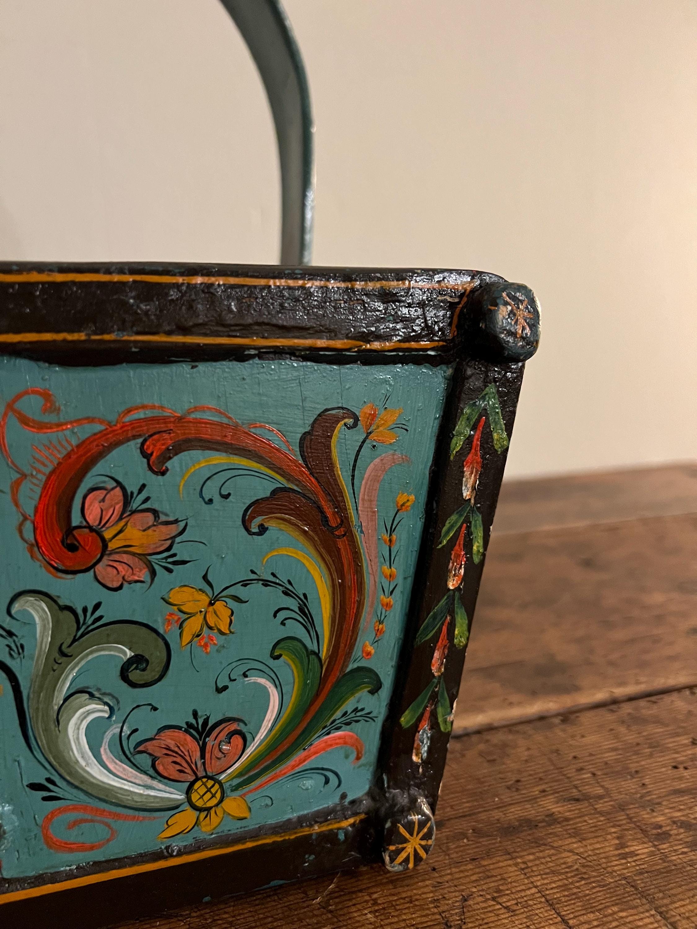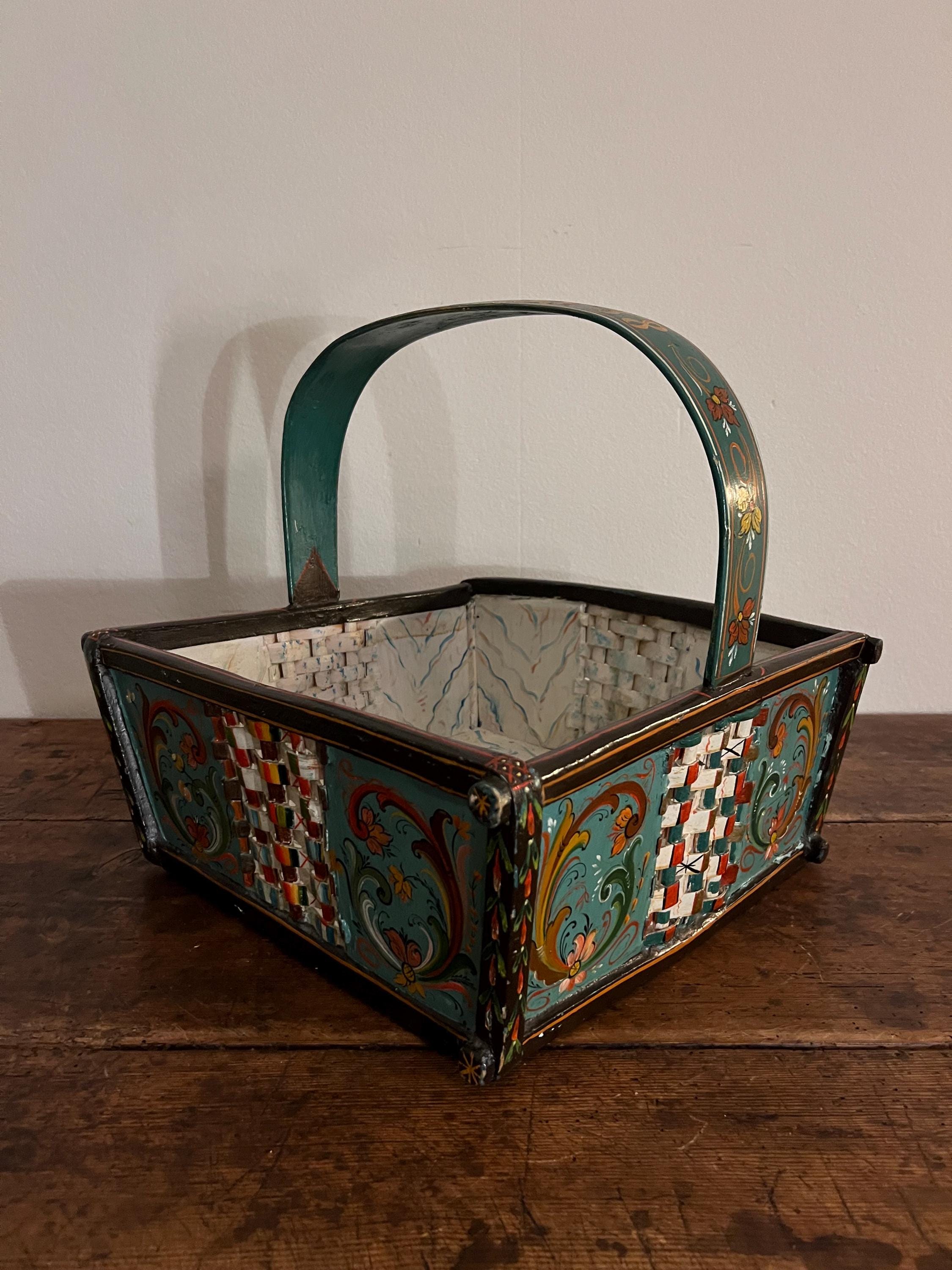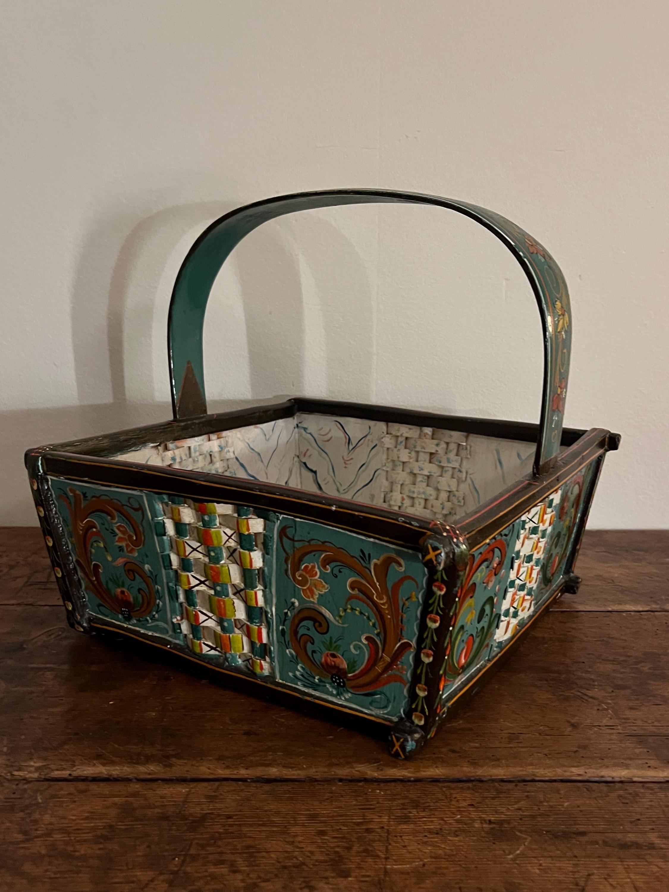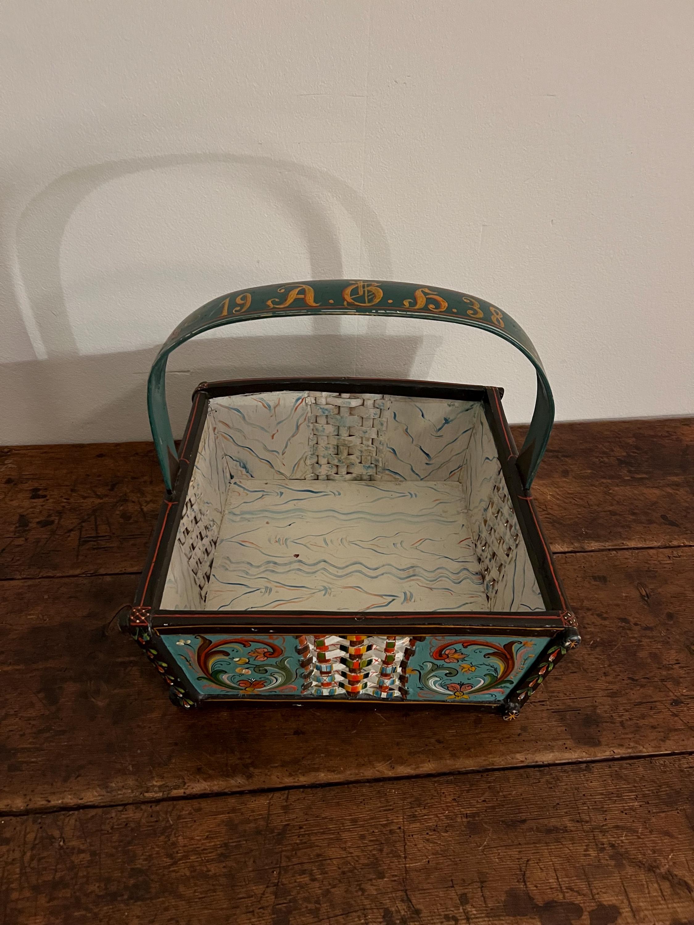 This exceptional handcrafted wooden basket represents a masterwork of traditional Norwegian craftsmanship. Hand-crafted in 1938 or earlier, and painted in 1938 by a skilled rosemaler from Telemark, it stands as both a functional object and a preserved artifact of Scandinavian folk art.