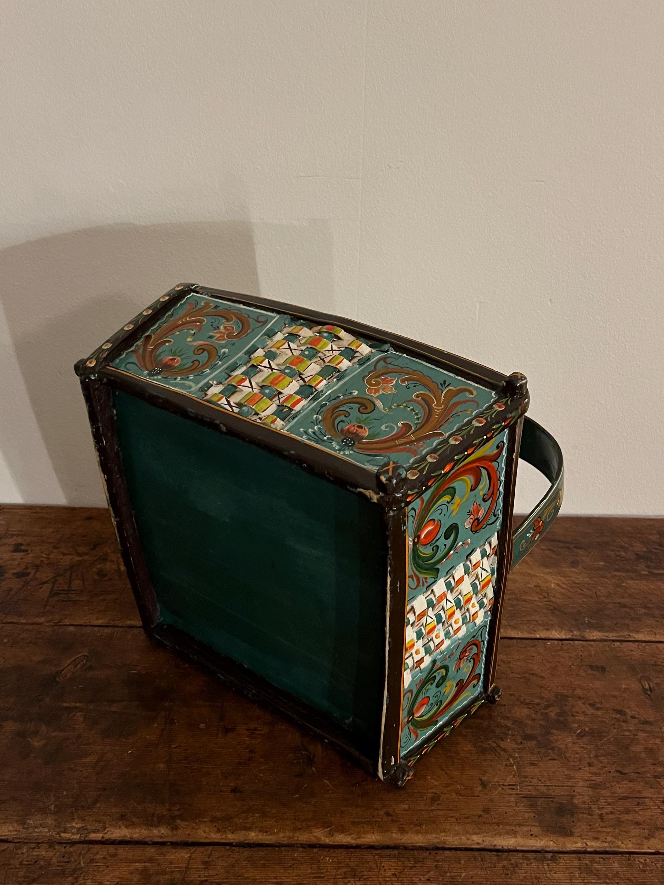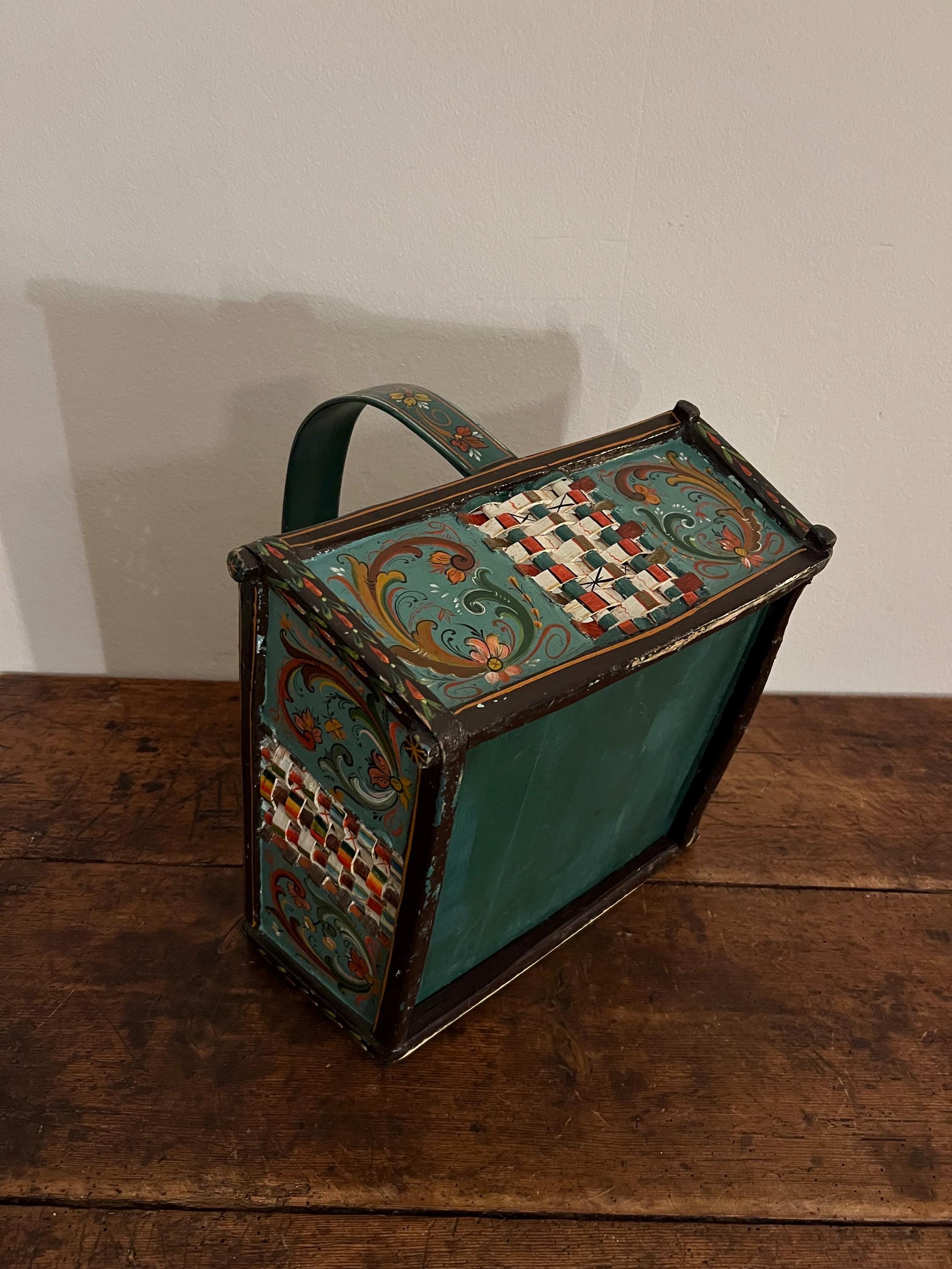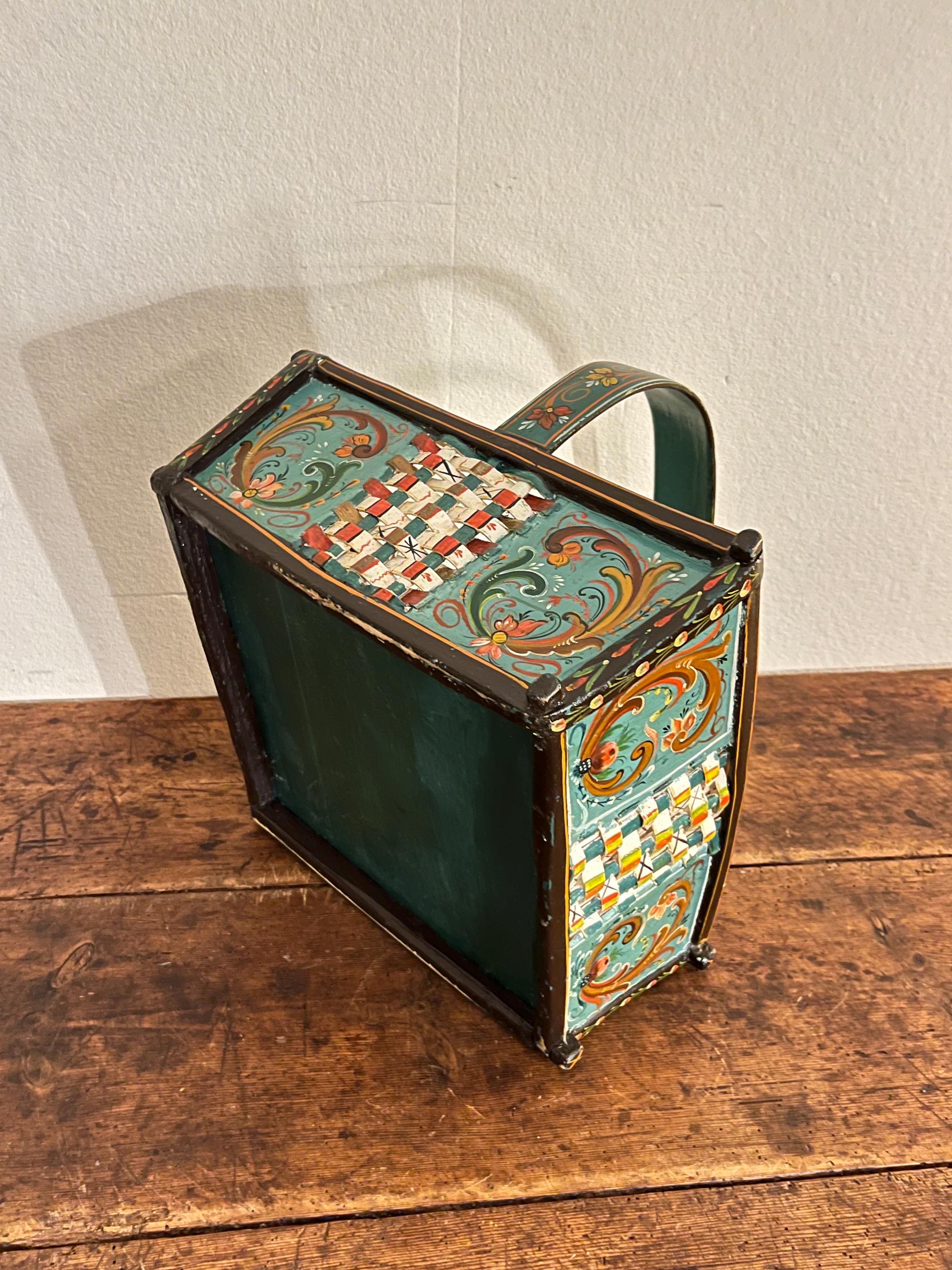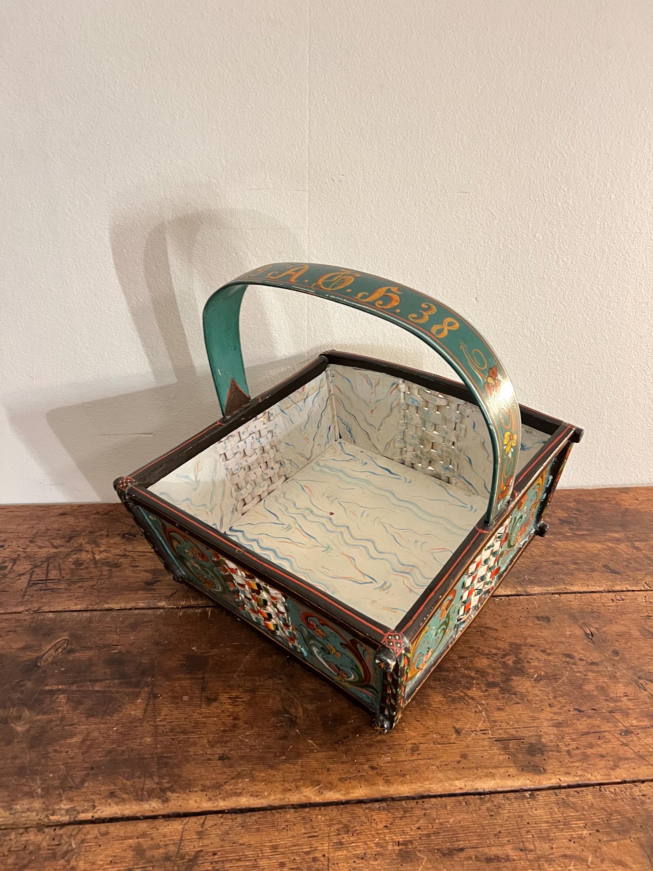 This exceptional handcrafted wooden basket represents a masterwork of traditional Norwegian craftsmanship. Hand-crafted in 1938 or earlier, and painted in 1938 by a skilled rosemaler from Telemark, it stands as both a functional object and a preserved artifact of Scandinavian folk art.