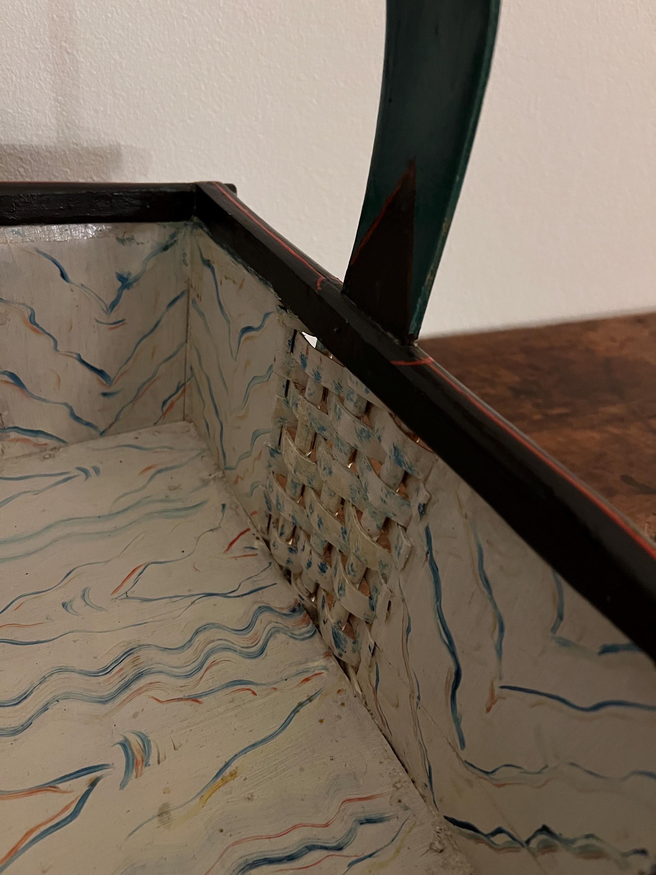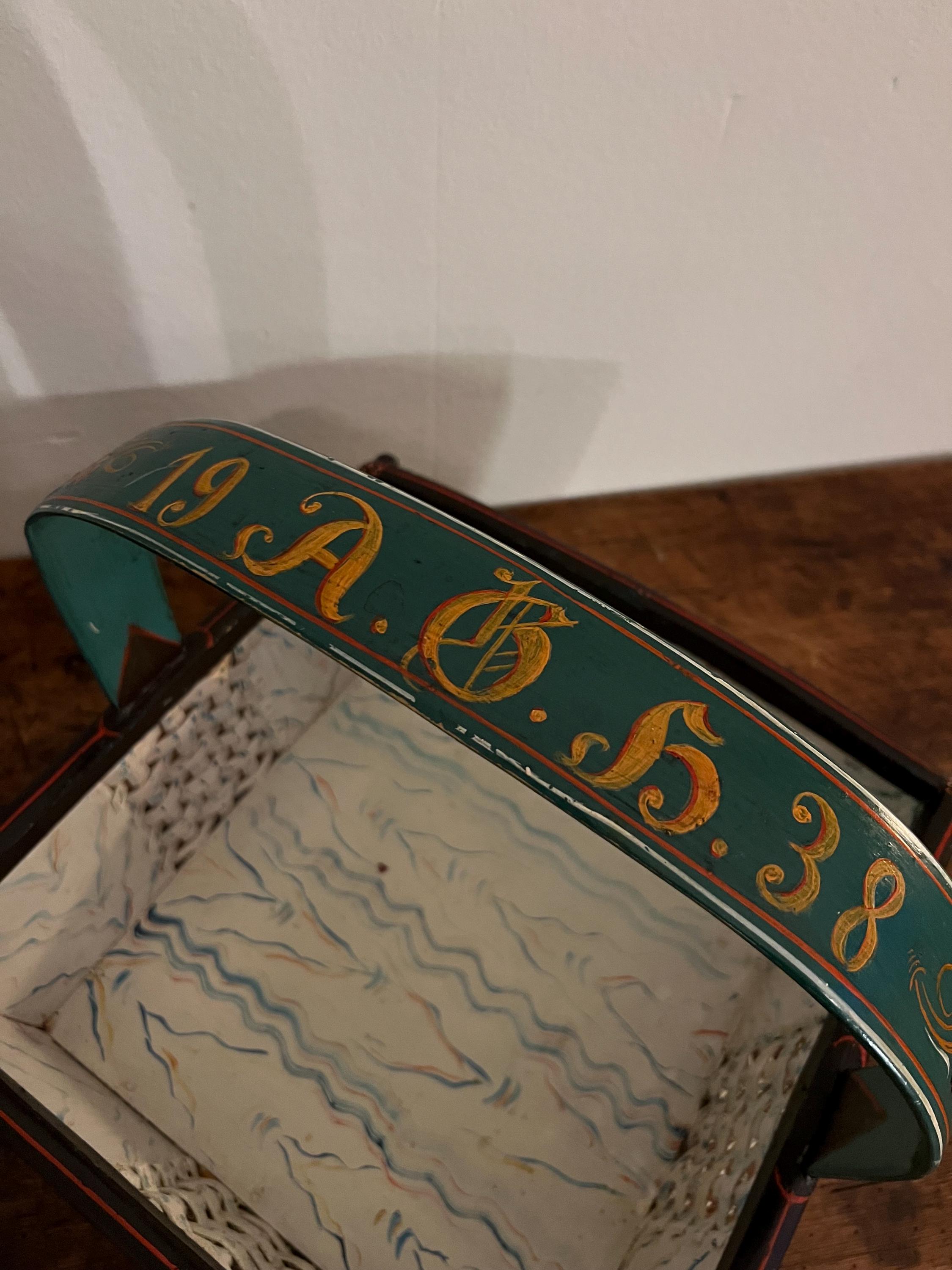 Constructed from solid wood and finished with a rich, protective coating, the basket remains in excellent original condition. Its vivid palette and crisp detail have been beautifully preserved, with no significant flaws, presenting a remarkable state of conservation for its age.