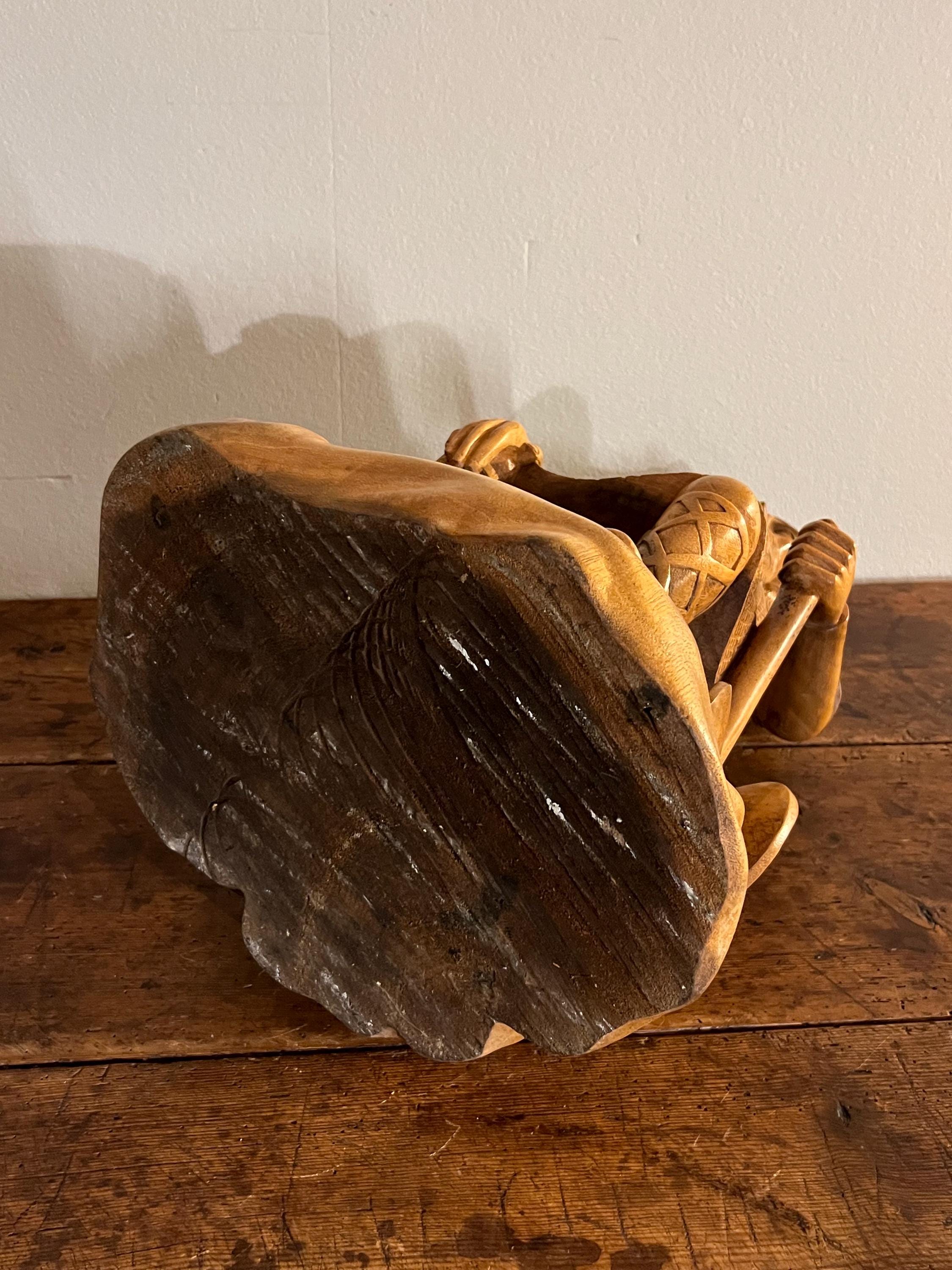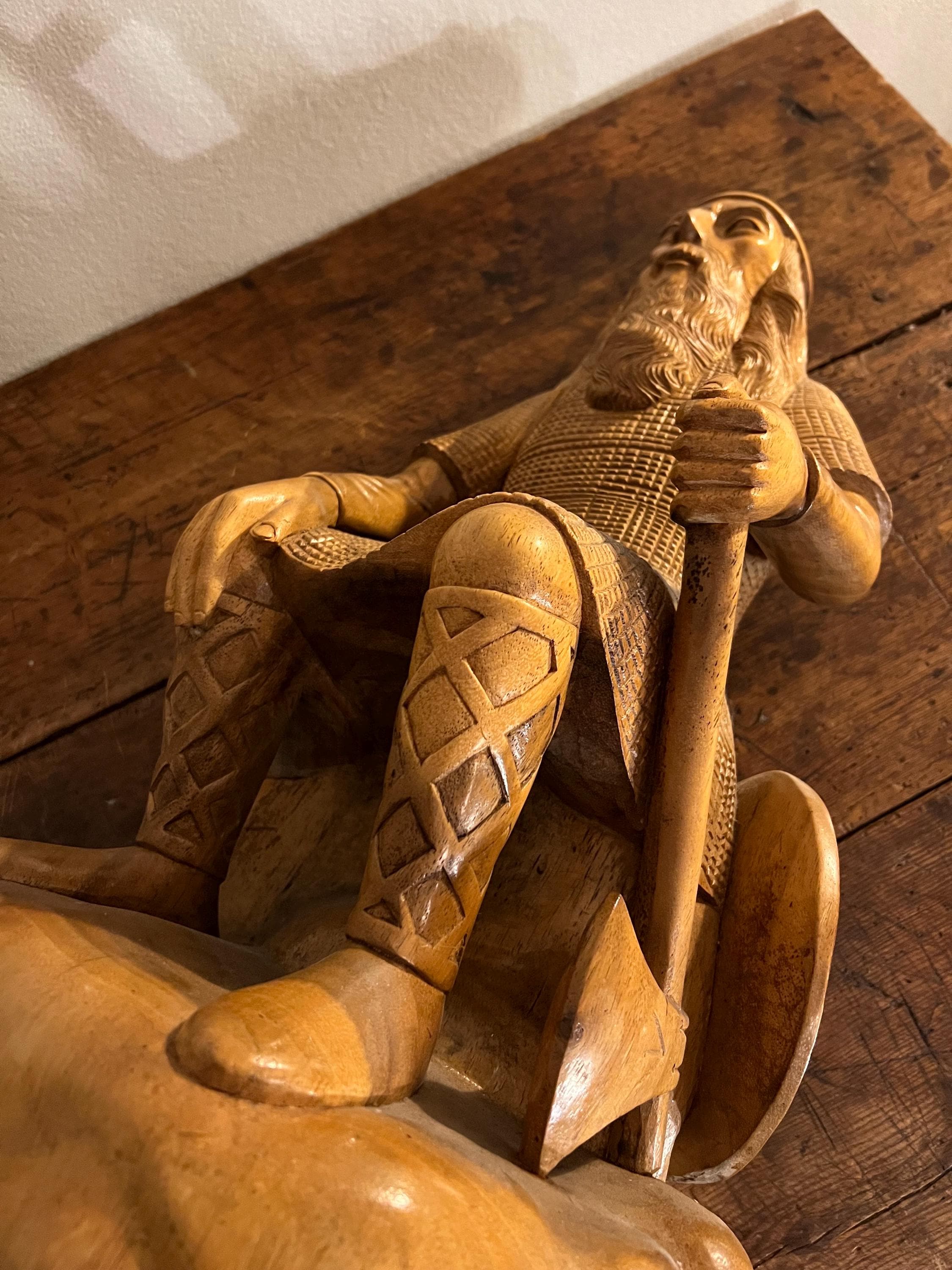 Masterfully carved from a single piece of wood, this expressive sculpture depicts a Viking warrior seated upon a rock, complete with detailed armor, a shield, and an axe. Created in the mid-20th century, it showcases exceptional craftsmanship and a rich, time-developed patina.