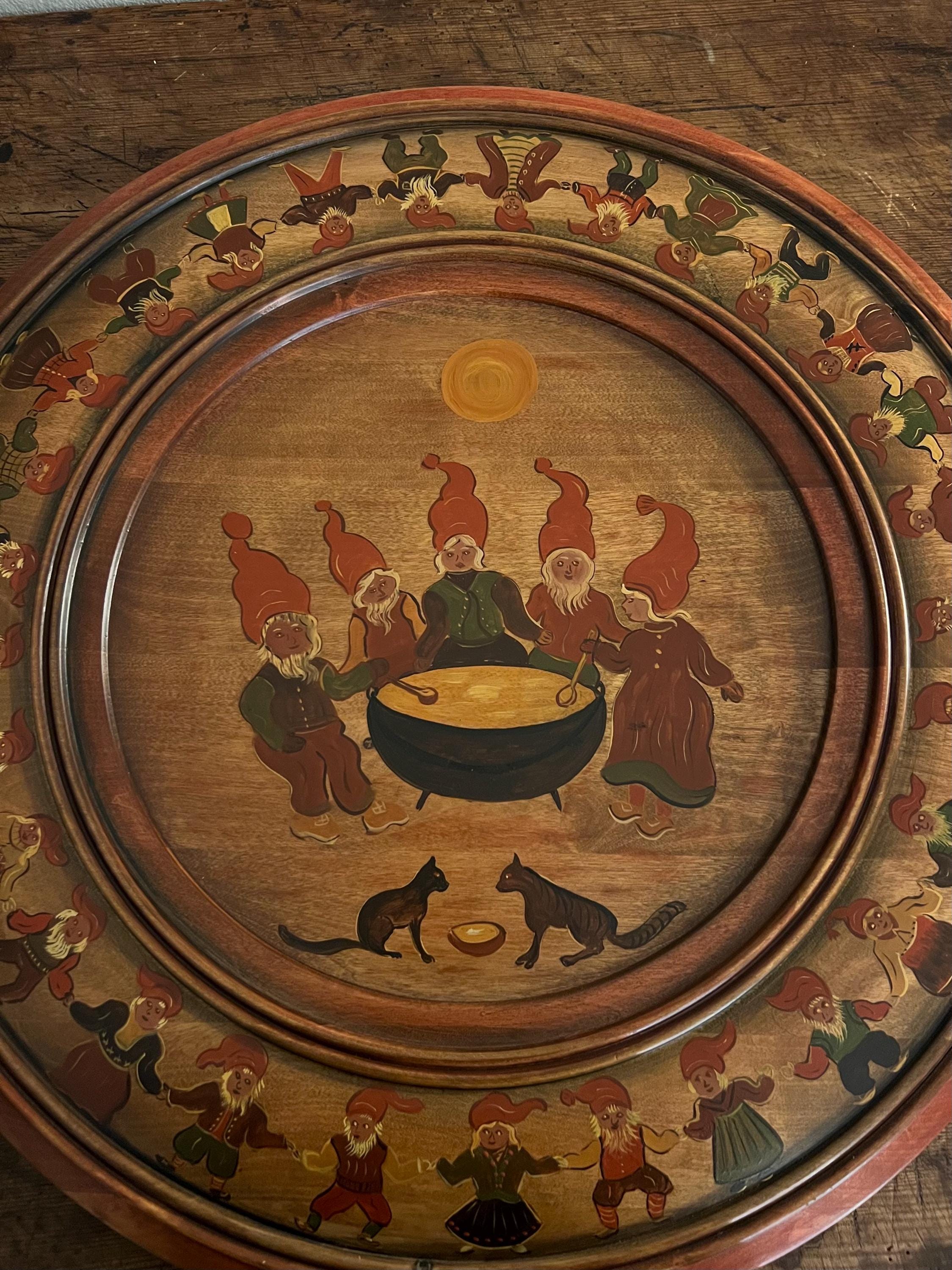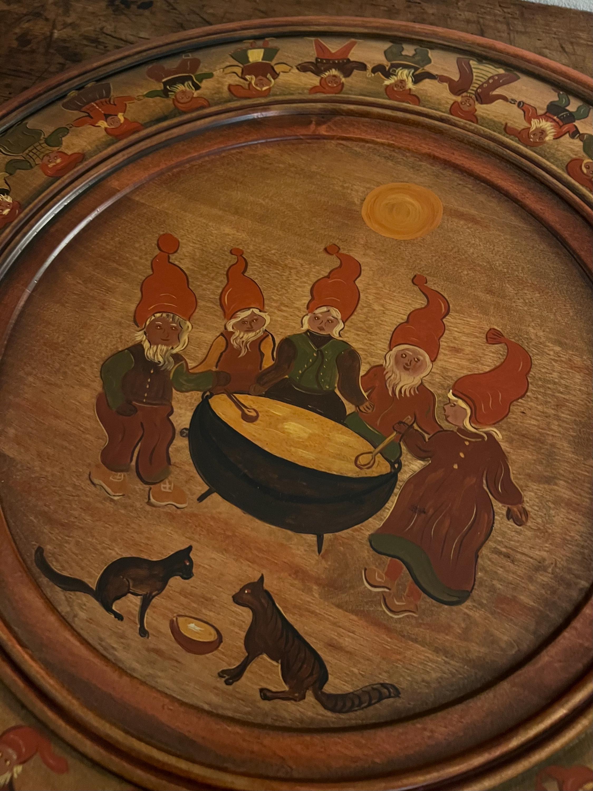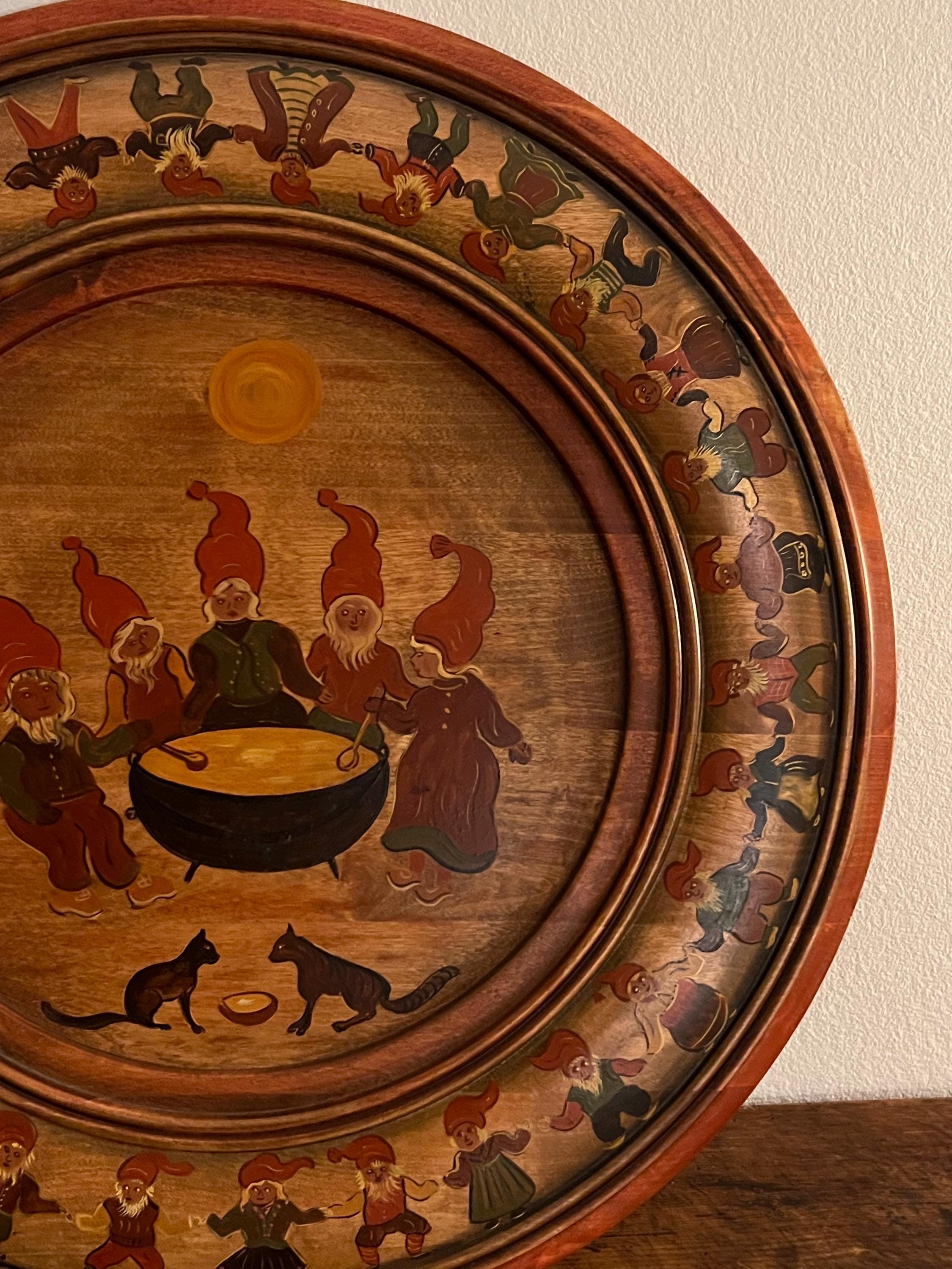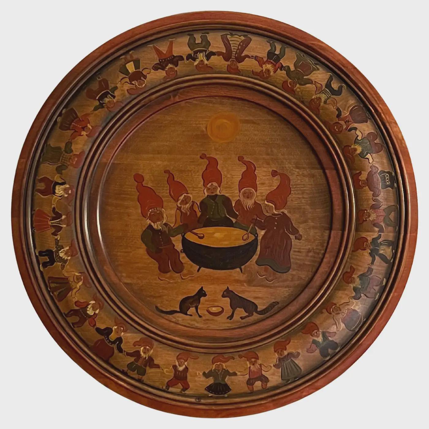 Handcrafted from solid beech wood, the plate is professionally painted with an intricate and playful scene depicting 34 nisser (gnome figures, including Nissefar and Nissemor) and 2 cats. The design, brimming with narrative detail and whimsy, exemplifies the heart of Nordic decorative tradition. The artist has signed the reverse with her initials, "M.Ø.", and the date "2001".