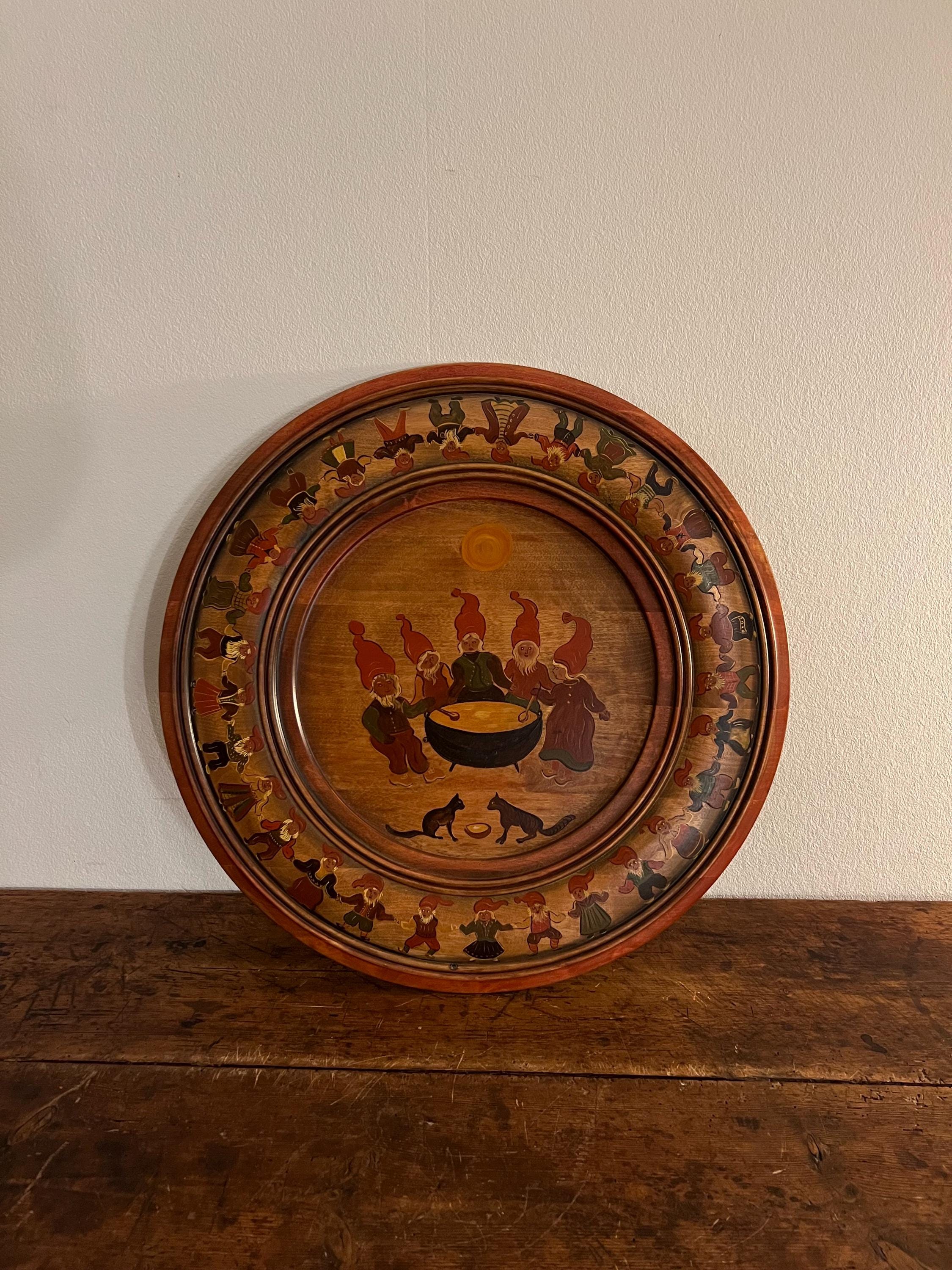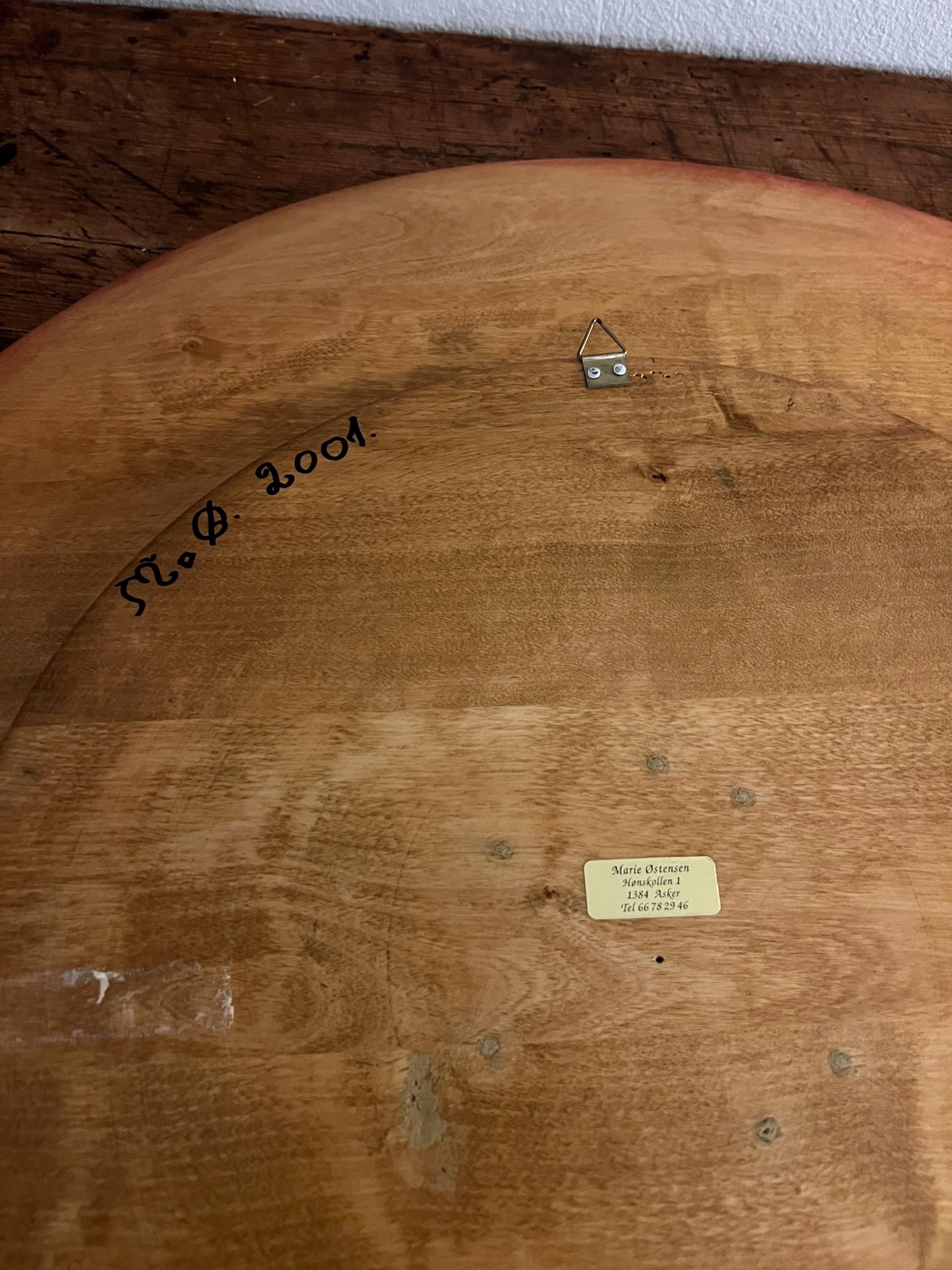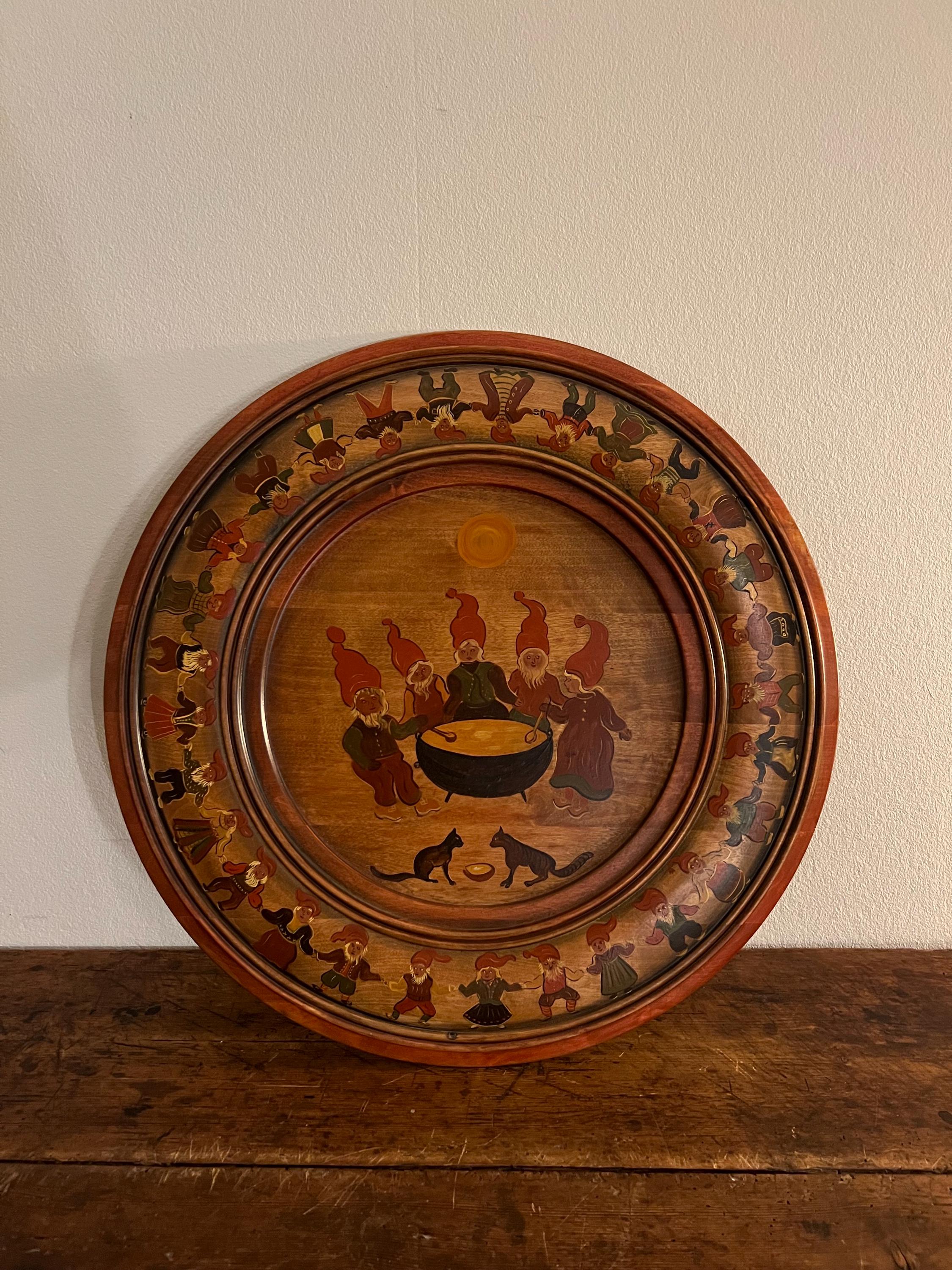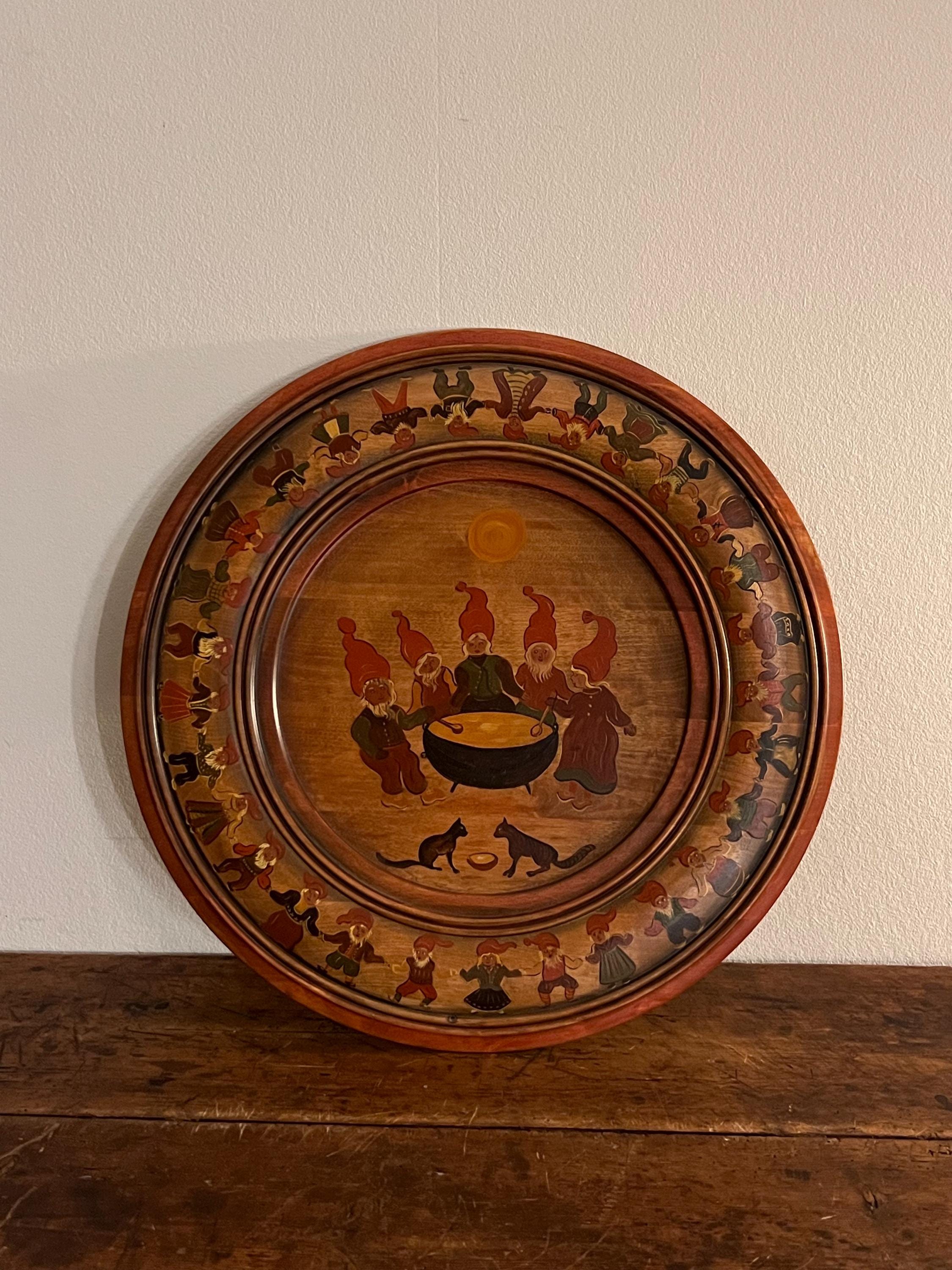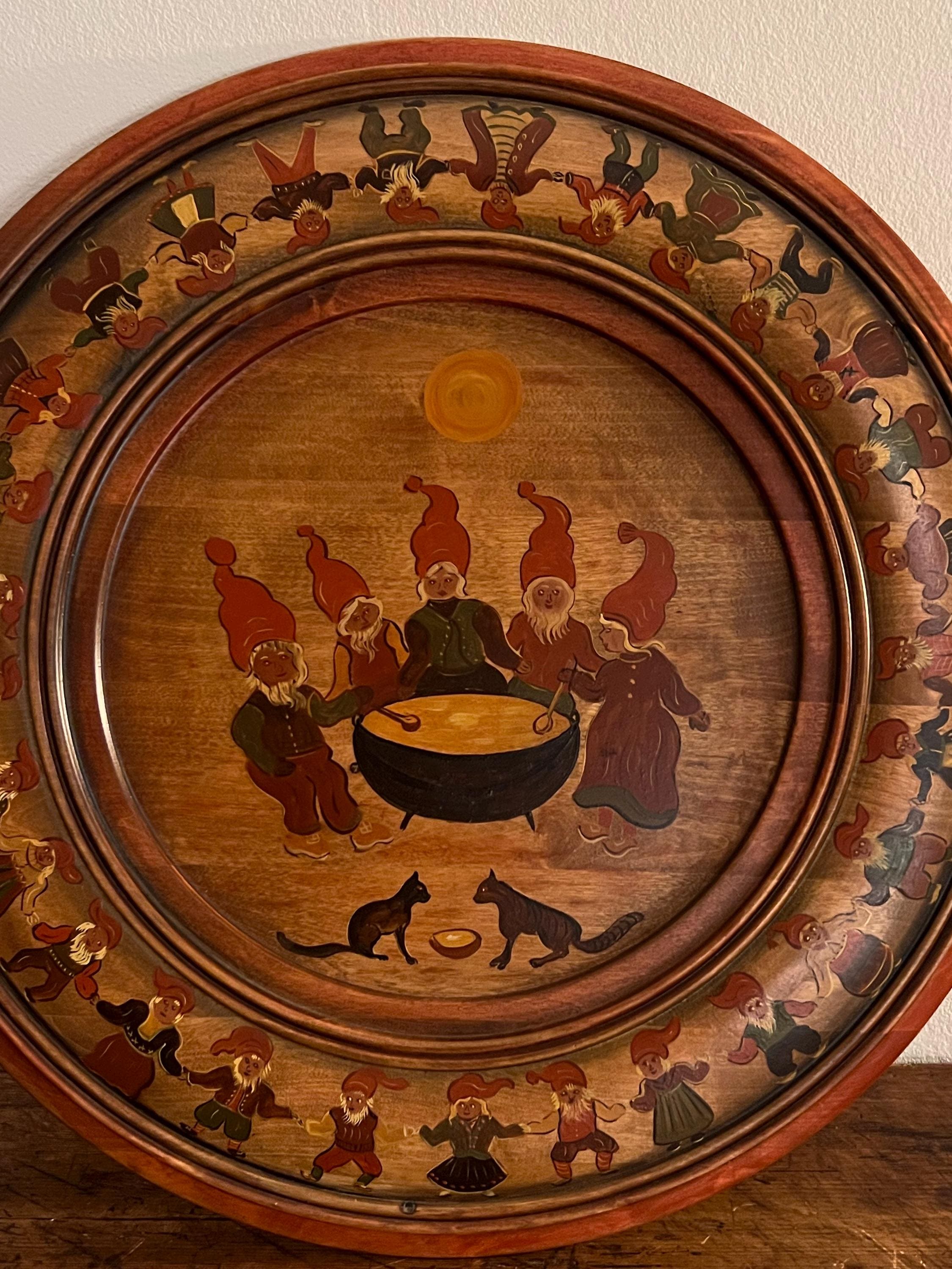 Handcrafted from solid beech wood, the plate is professionally painted with an intricate and playful scene depicting 34 nisser (gnome figures, including Nissefar and Nissemor) and 2 cats. The design, brimming with narrative detail and whimsy, exemplifies the heart of Nordic decorative tradition. The artist has signed the reverse with her initials, "M.Ø.", and the date "2001".