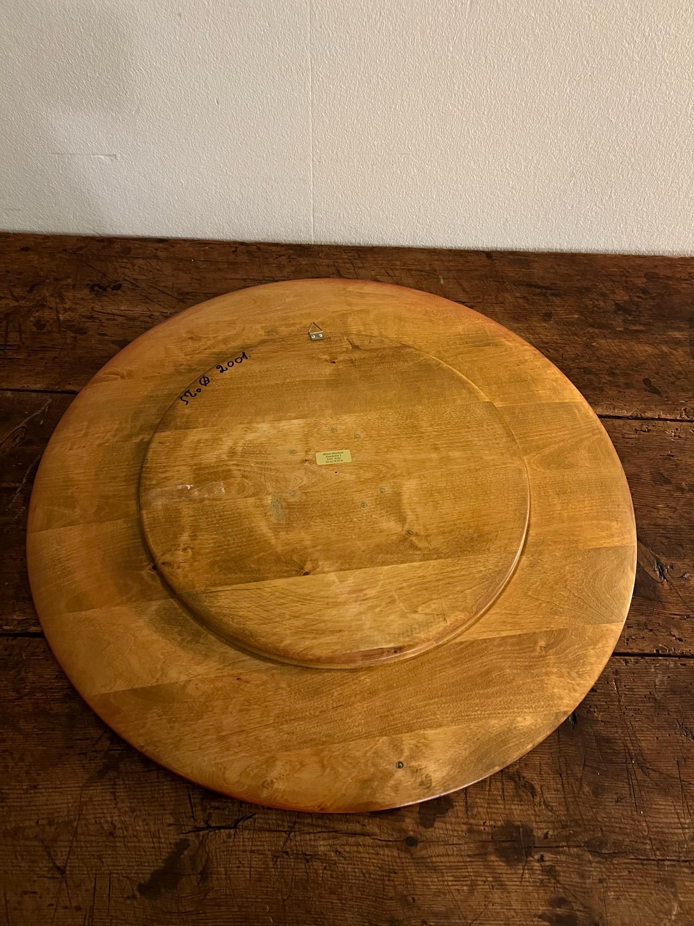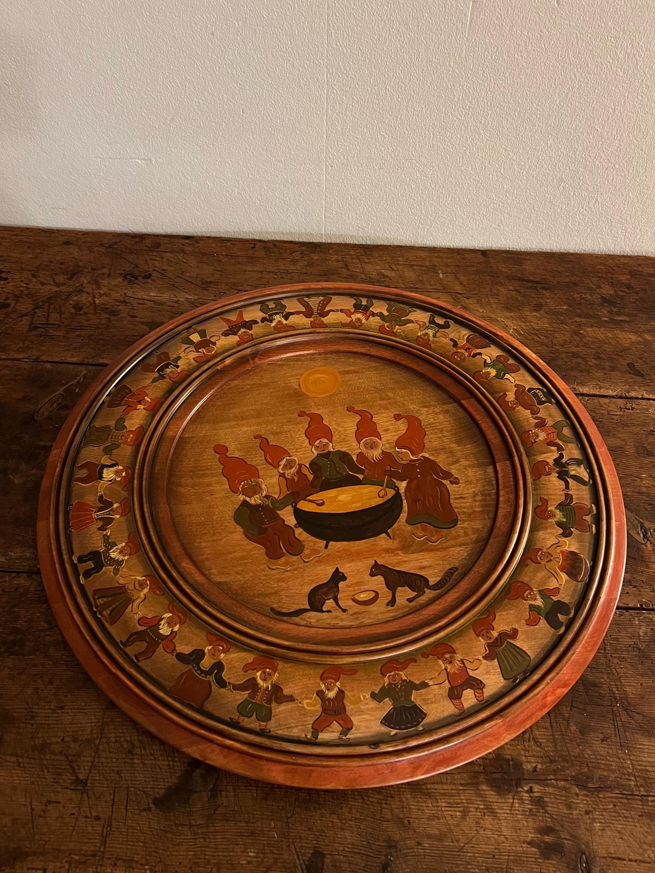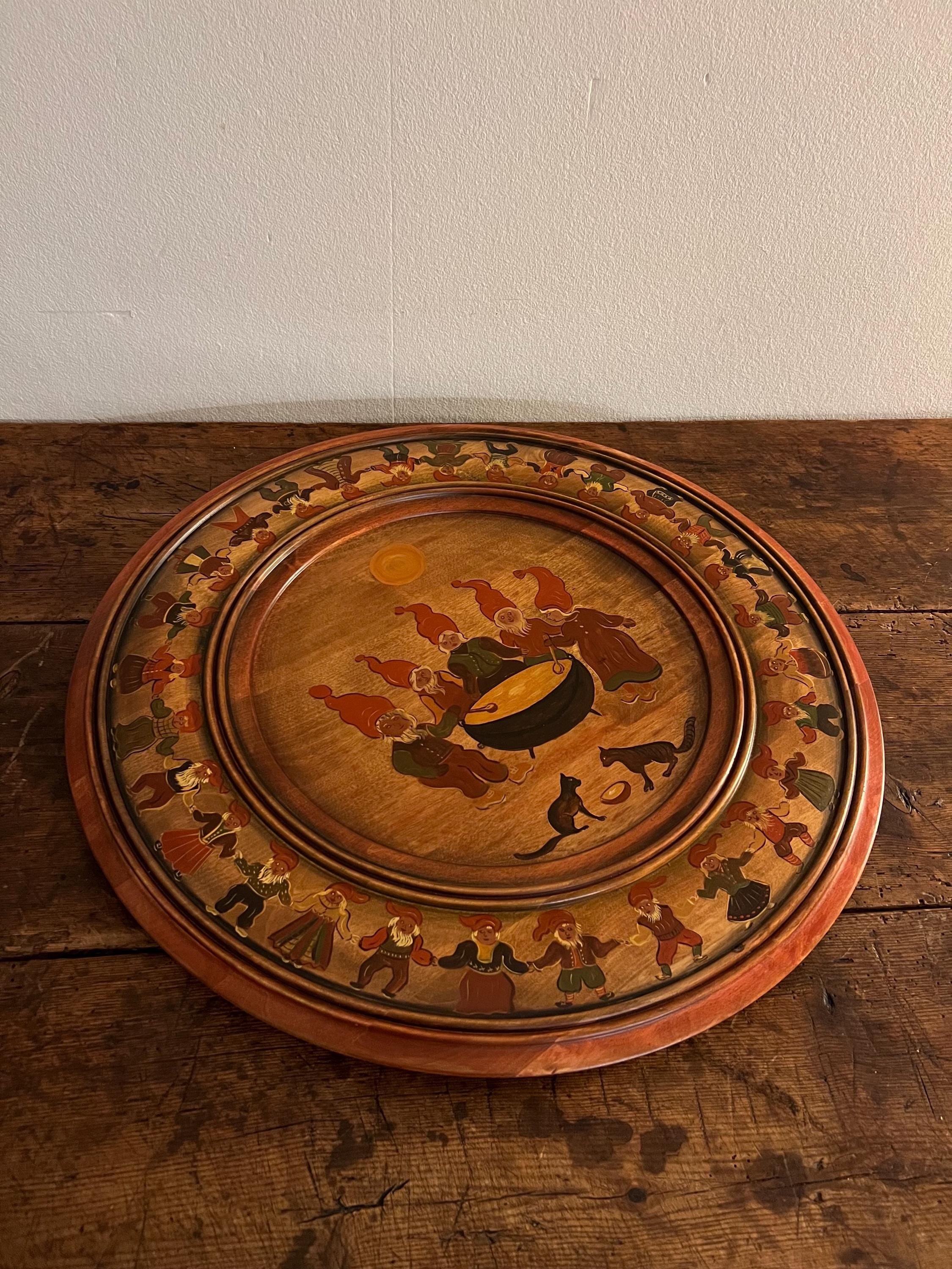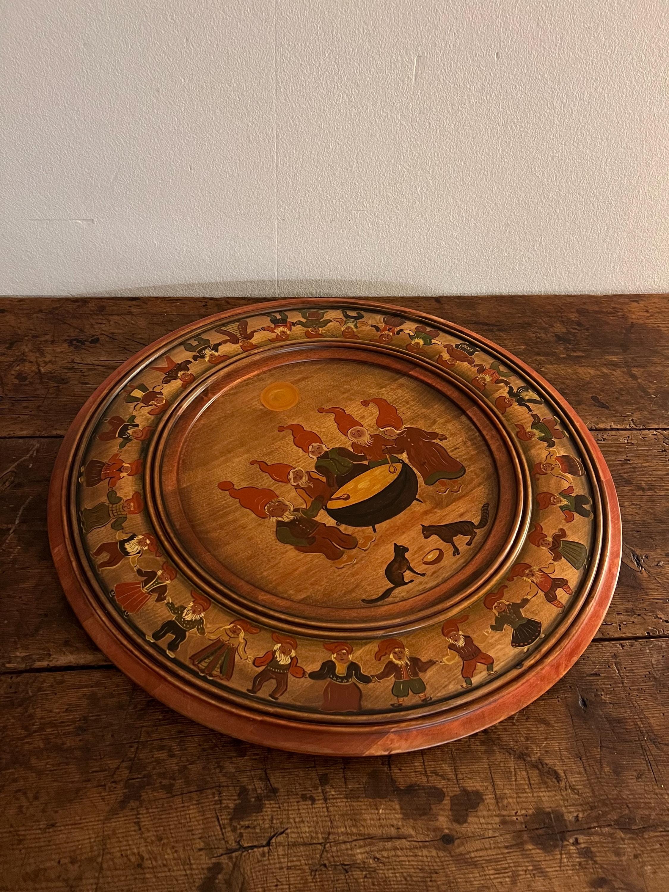 Handcrafted from solid beech wood, the plate is professionally painted with an intricate and playful scene depicting 34 nisser (gnome figures, including Nissefar and Nissemor) and 2 cats. The design, brimming with narrative detail and whimsy, exemplifies the heart of Nordic decorative tradition. The artist has signed the reverse with her initials, "M.Ø.", and the date "2001".