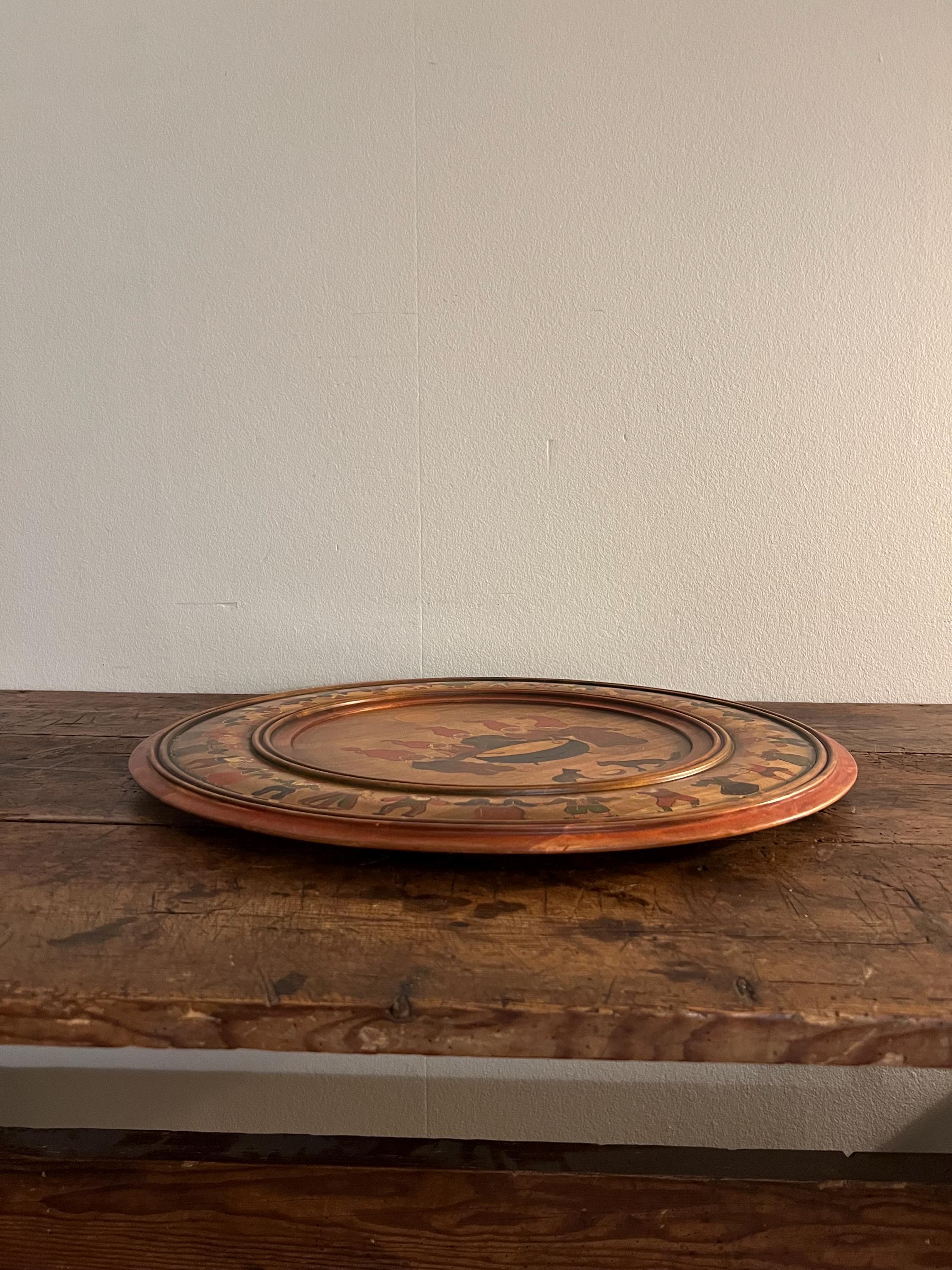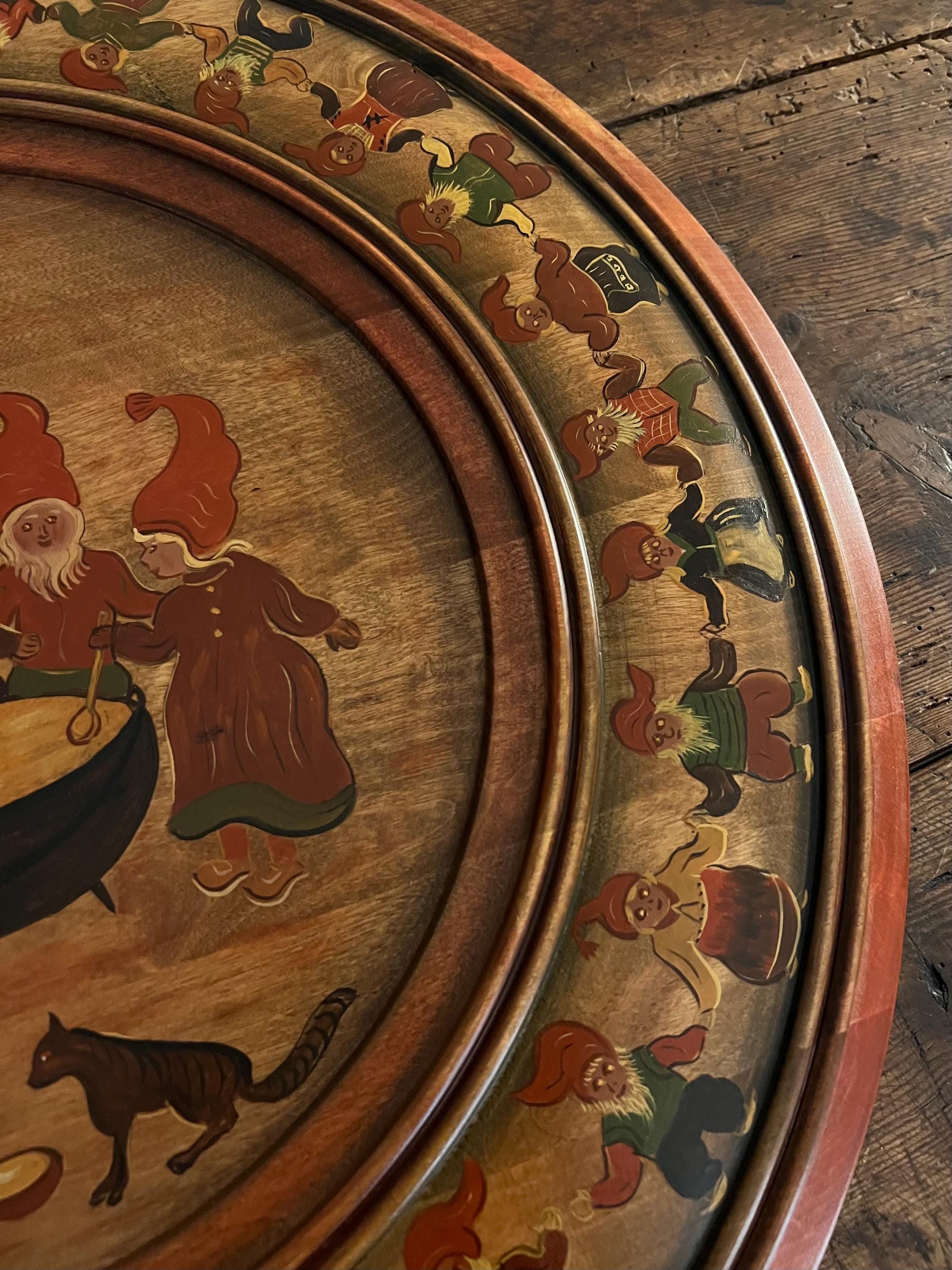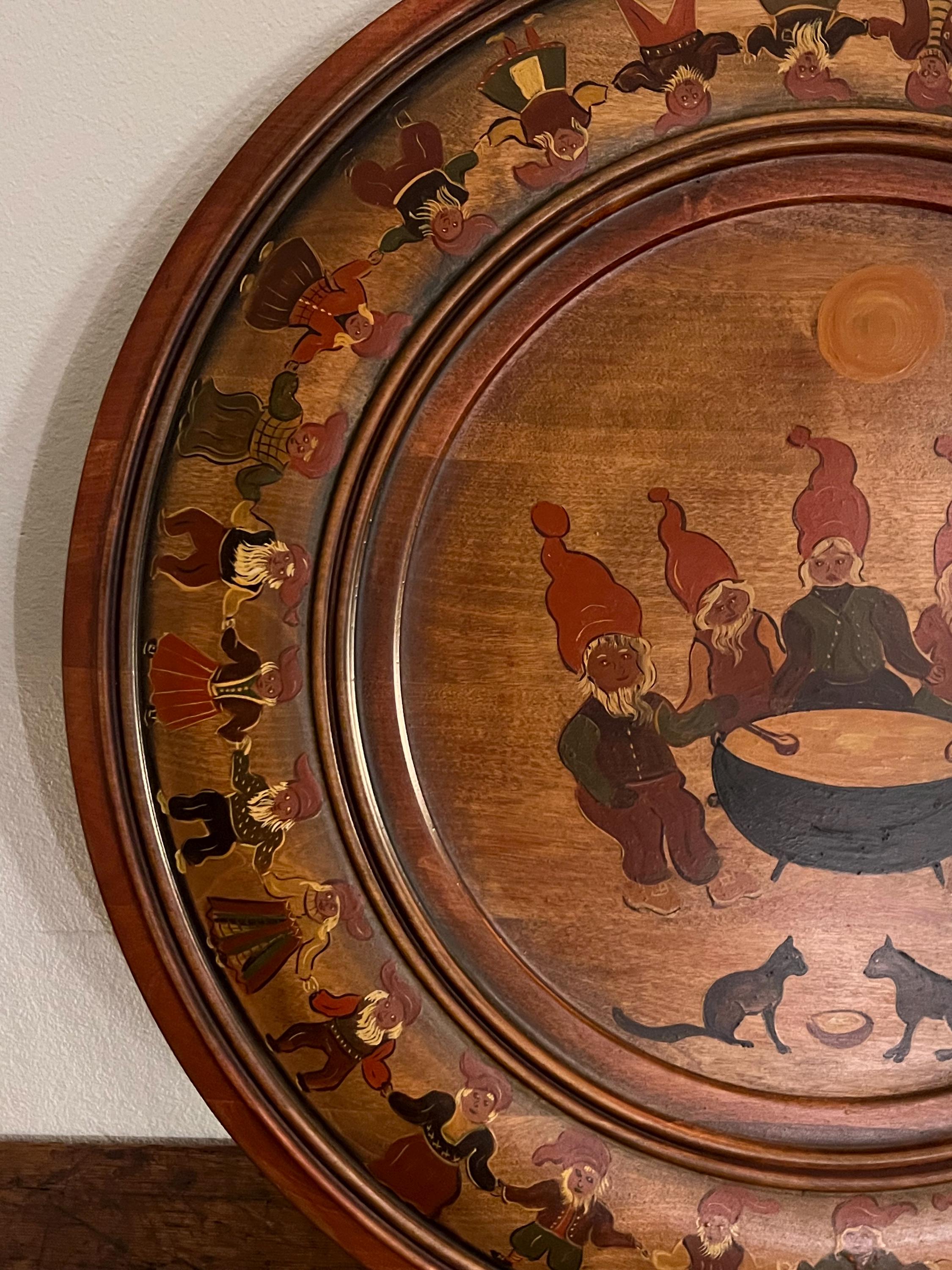 A superb example of Norwegian folk art, this large-scale farmhouse hanging plate features the traditional hand-painted Christmas Nisser from Norway. Created in 2001 by artist Marie Østensen, it is a charming and collectible piece of Scandinavian cultural heritage.