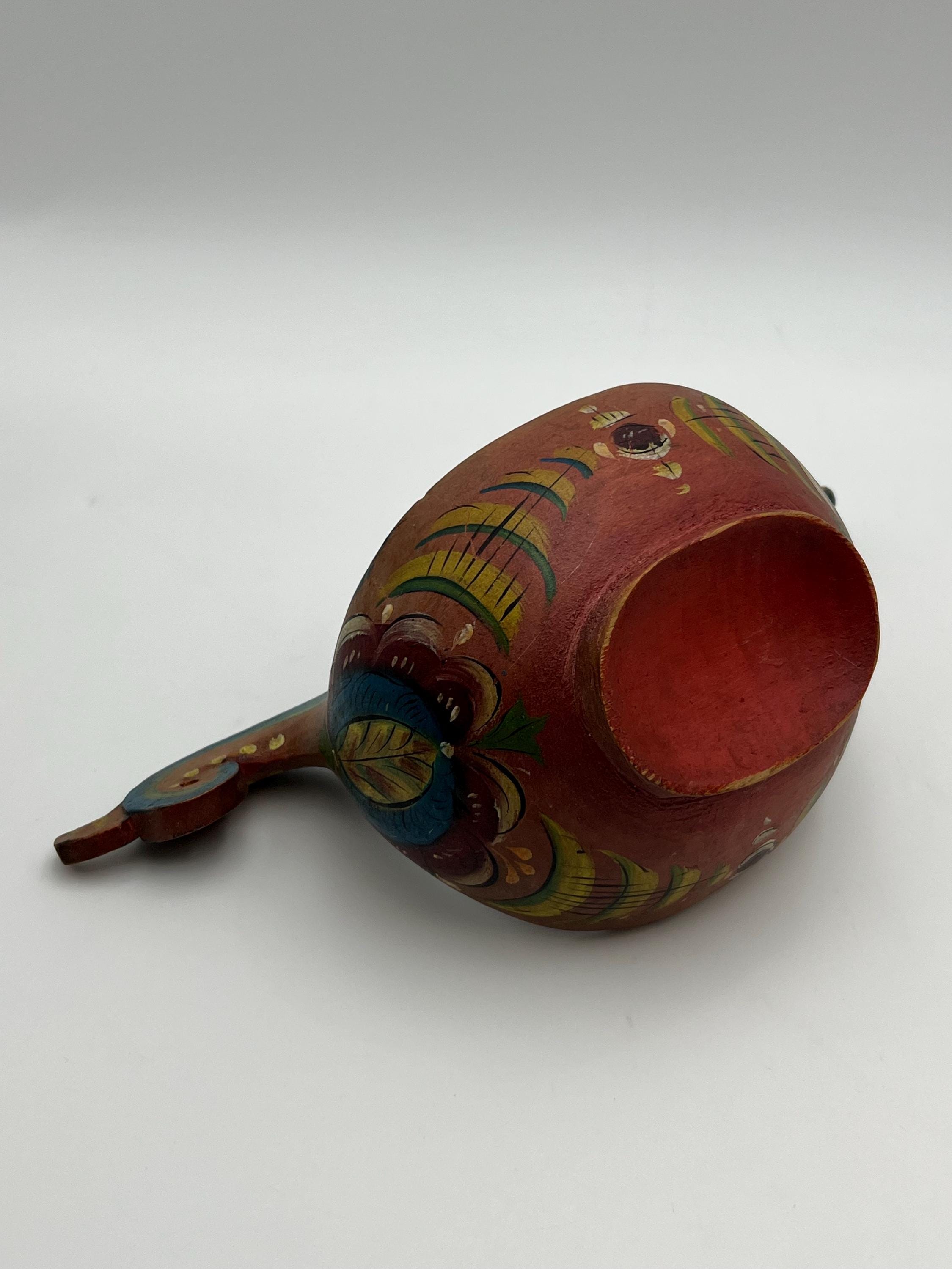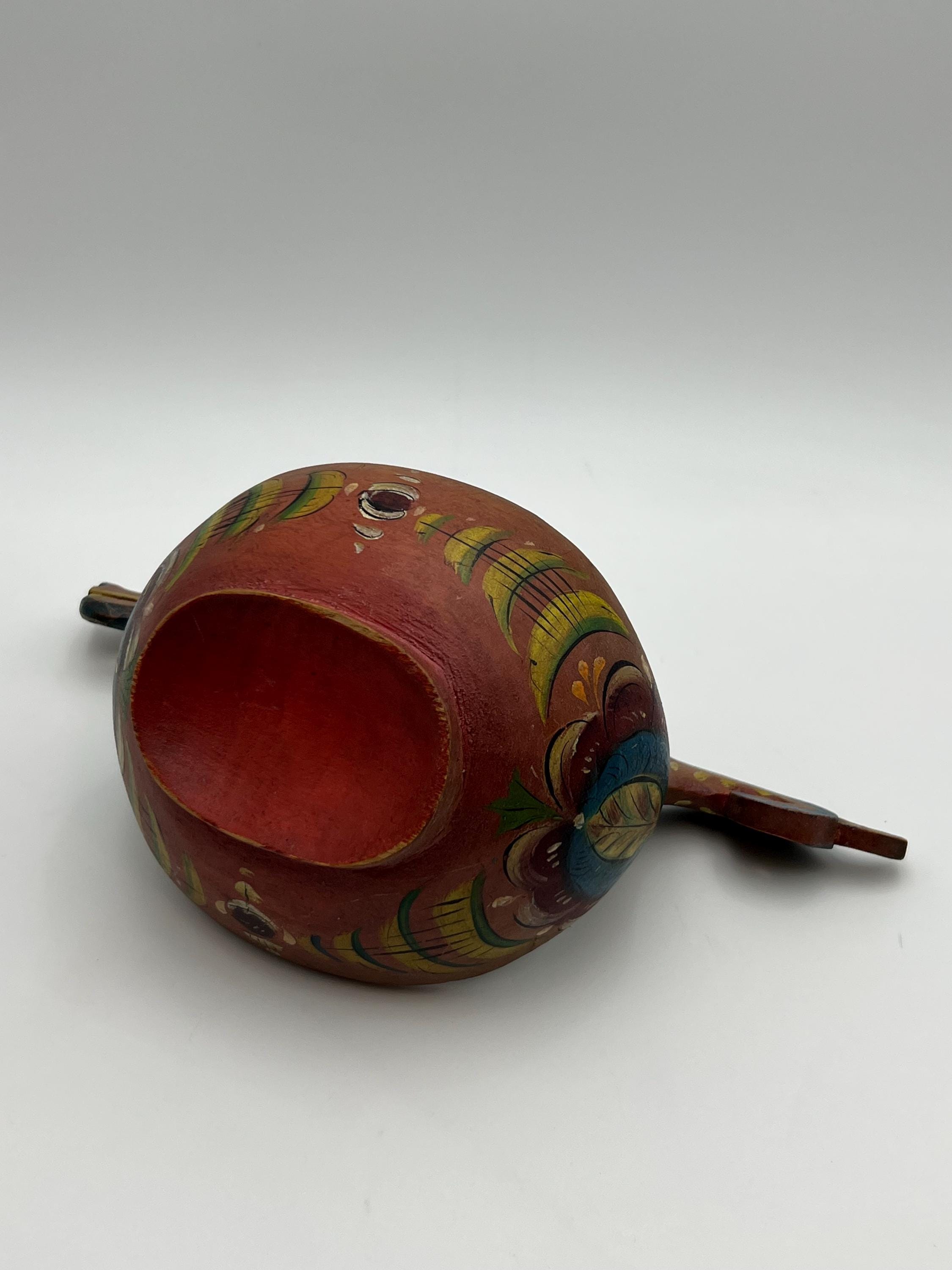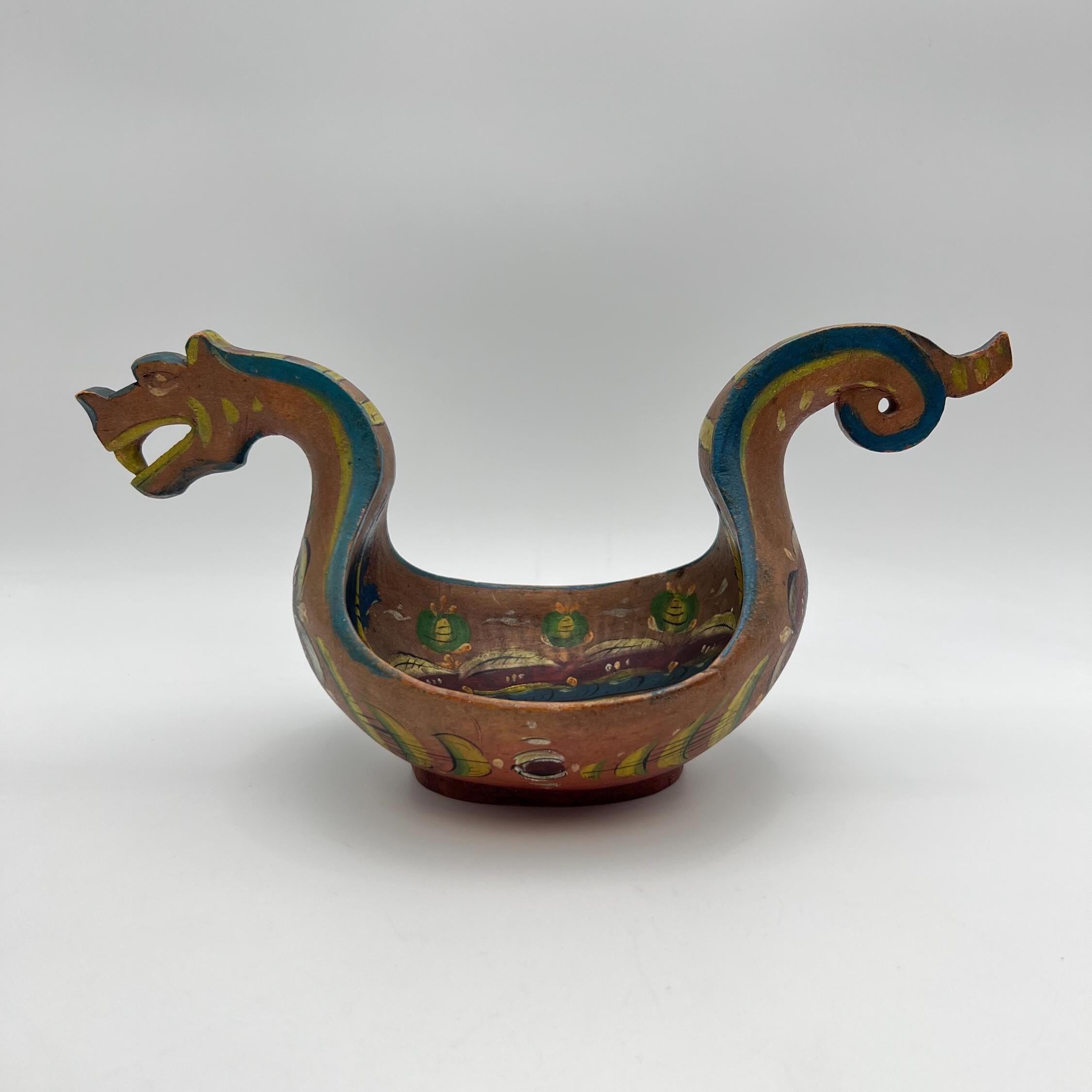An exceptionally rare museum-quality Scandinavian ale bowl (Kjenge/Ølfugl) from circa 1880s. Hand-carved in birch or beech wood, this piece features a distinctive dragon-head handle—a highly coveted motif in Scandinavian folk art. The surface retains its original hand-painted rosemaling on a traditional farmhouse red ground, now exhibiting a warm, mellowed patina.