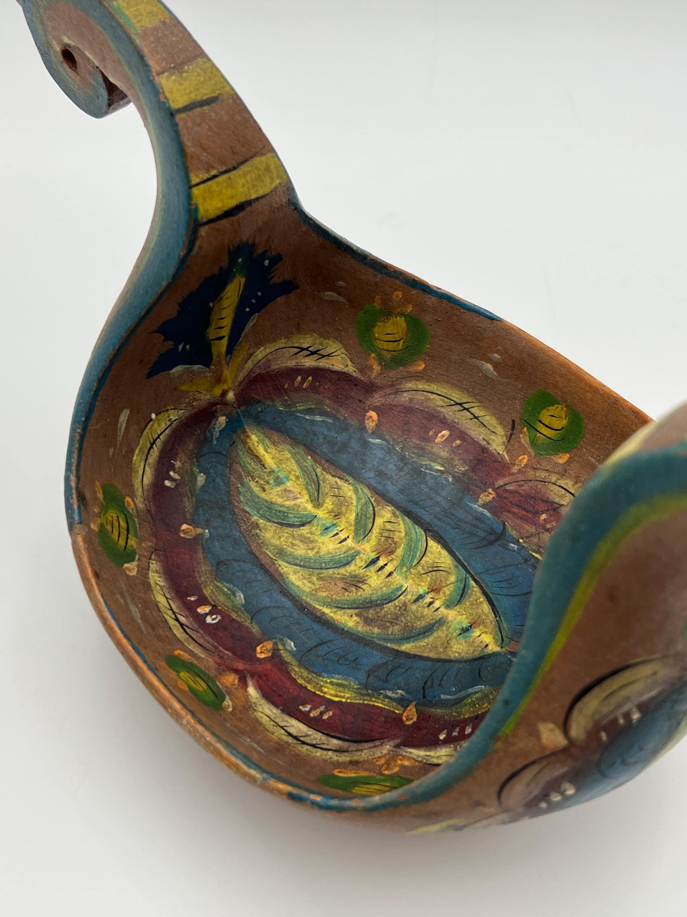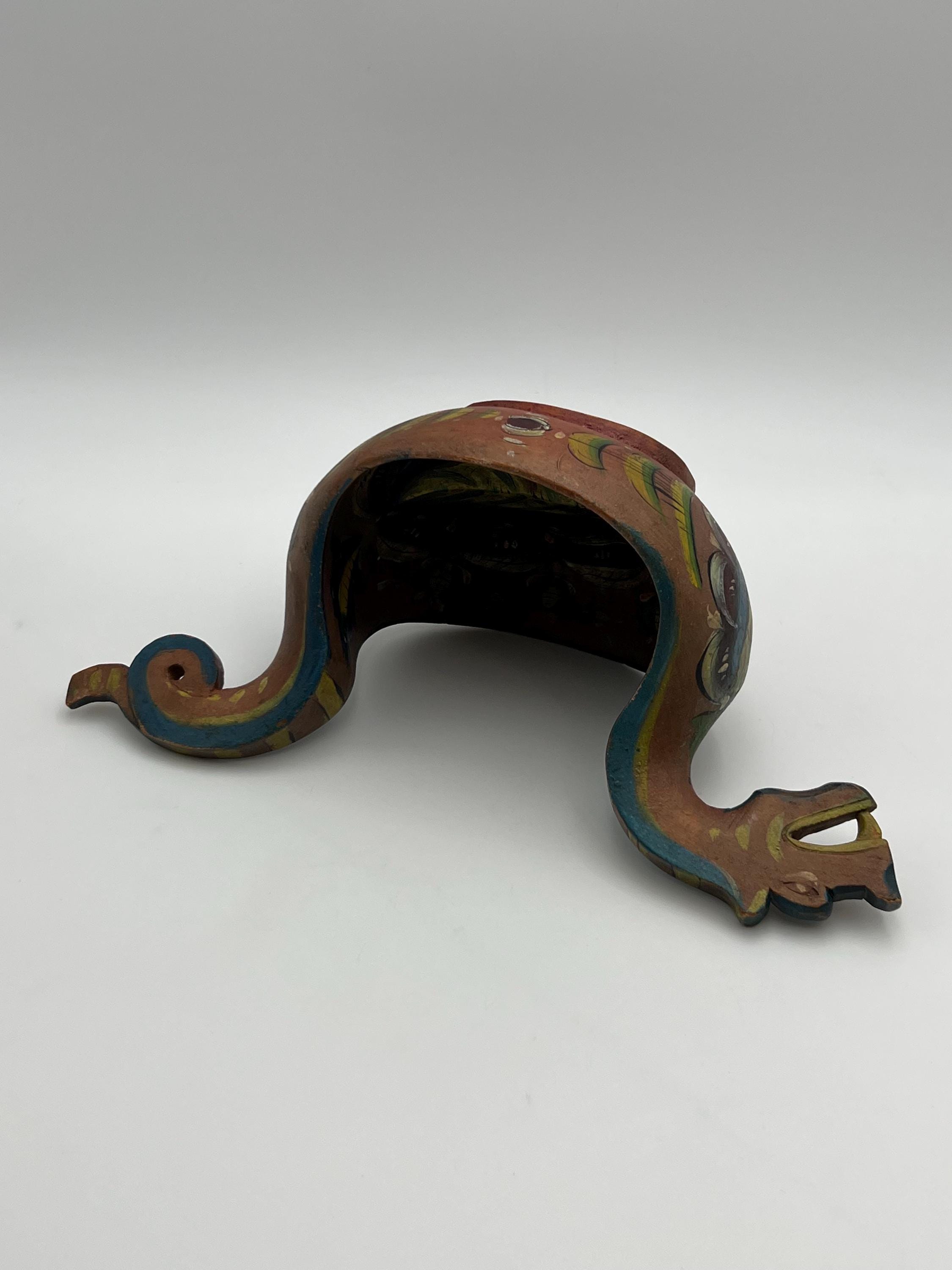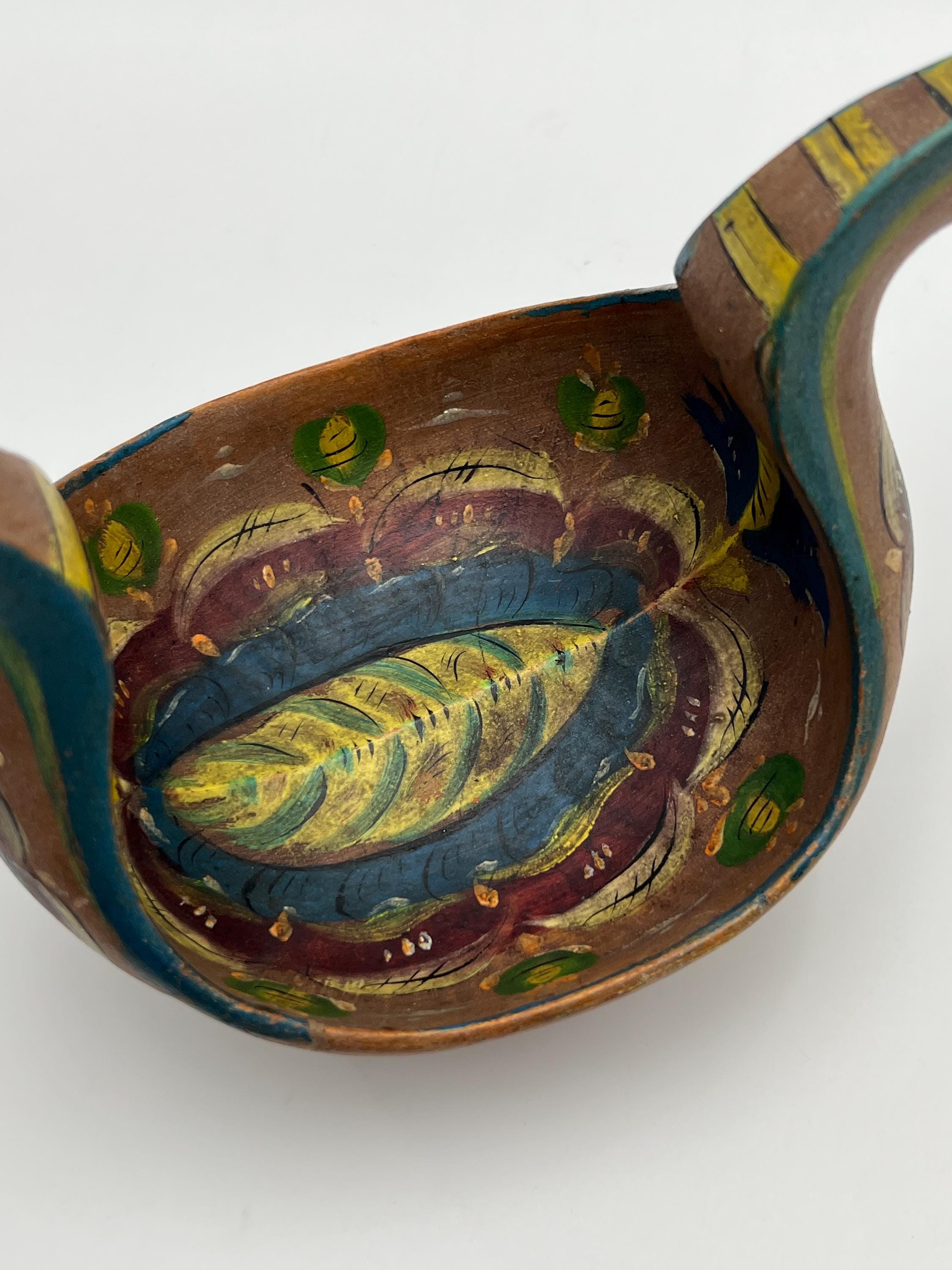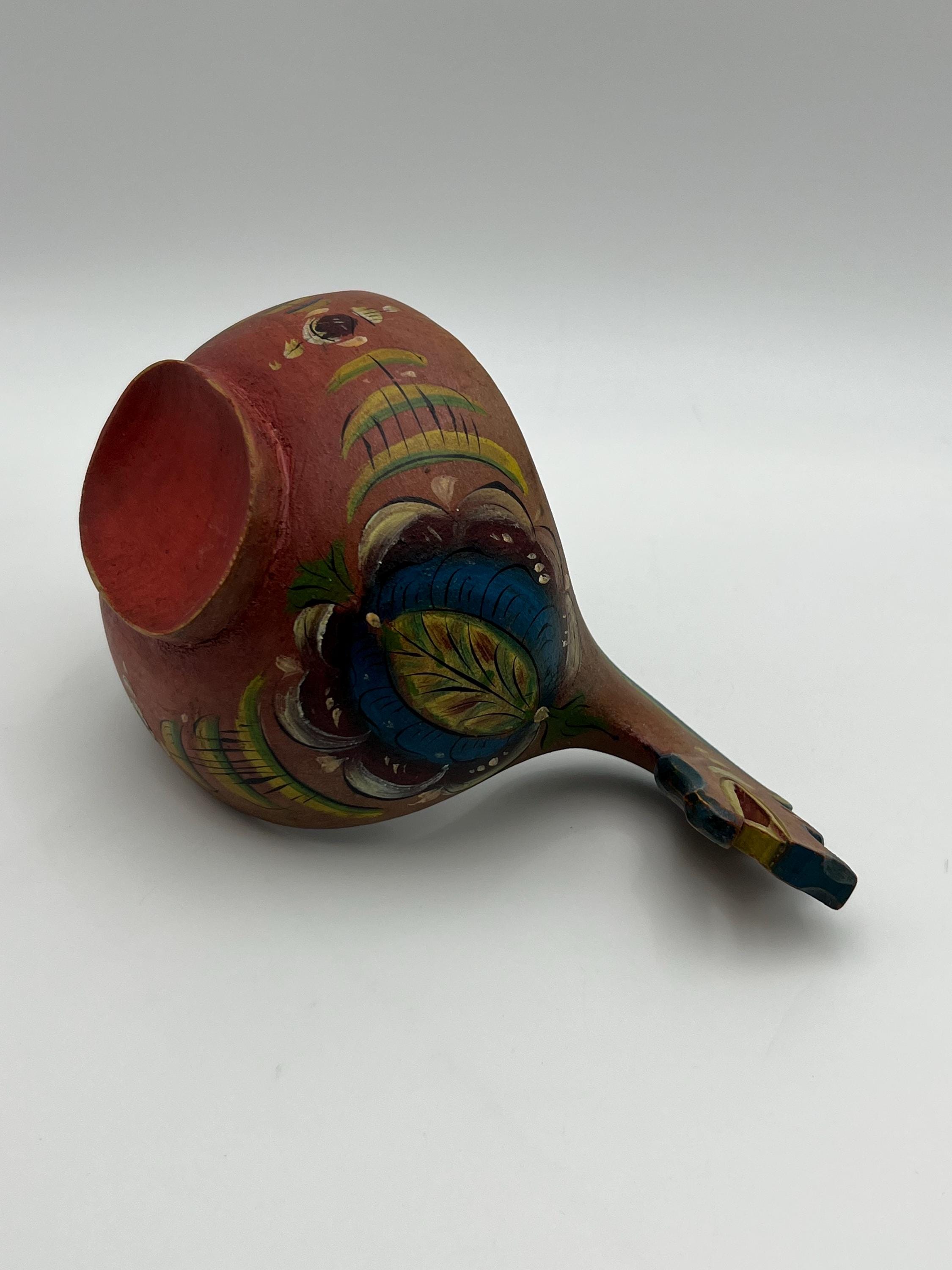 An exceptionally rare museum-quality Scandinavian ale bowl (Kjenge/Ølfugl) from circa 1880s. Hand-carved in birch or beech wood, this piece features a distinctive dragon-head handle—a highly coveted motif in Scandinavian folk art. The surface retains its original hand-painted rosemaling on a traditional farmhouse red ground, now exhibiting a warm, mellowed patina.