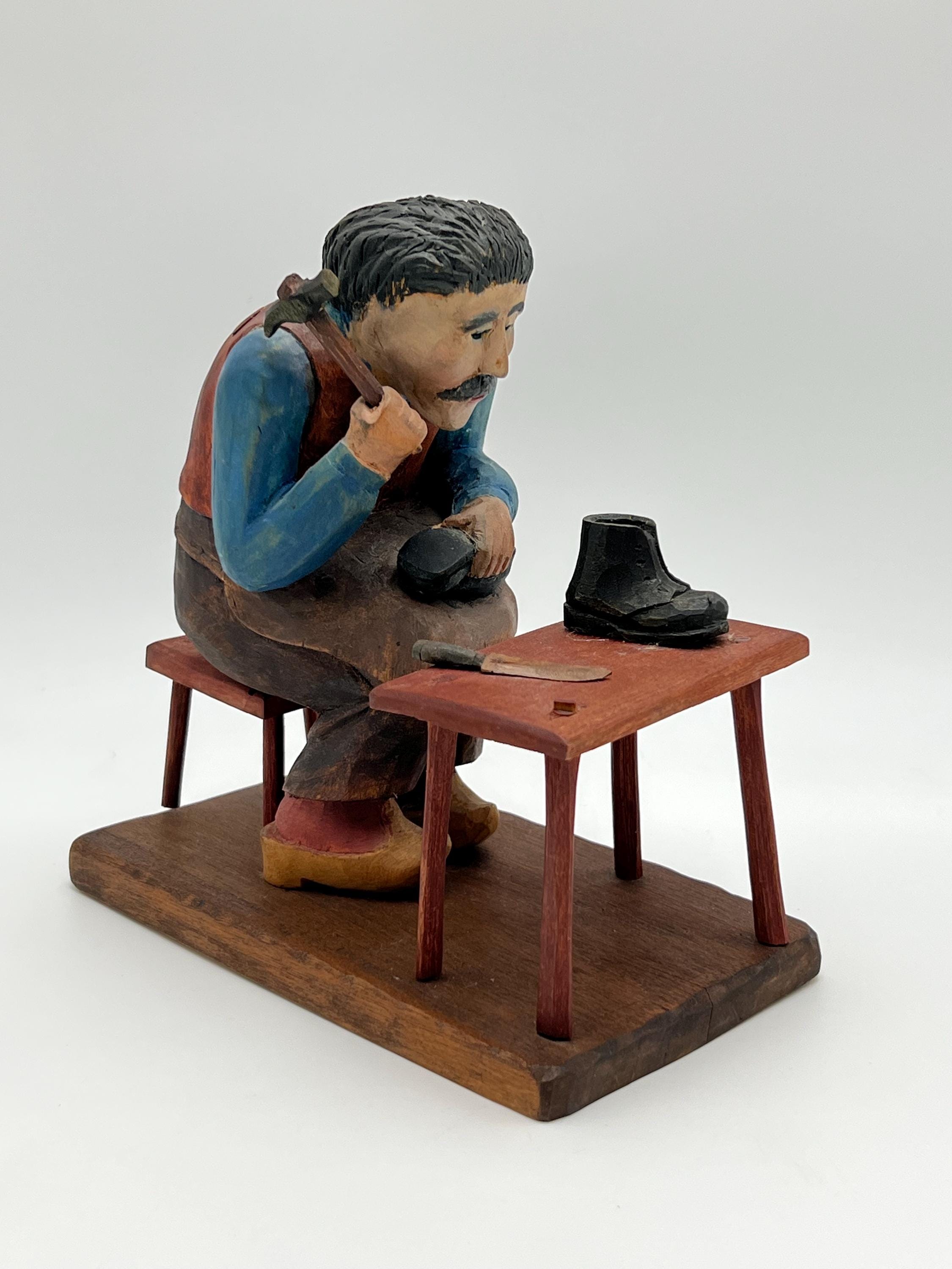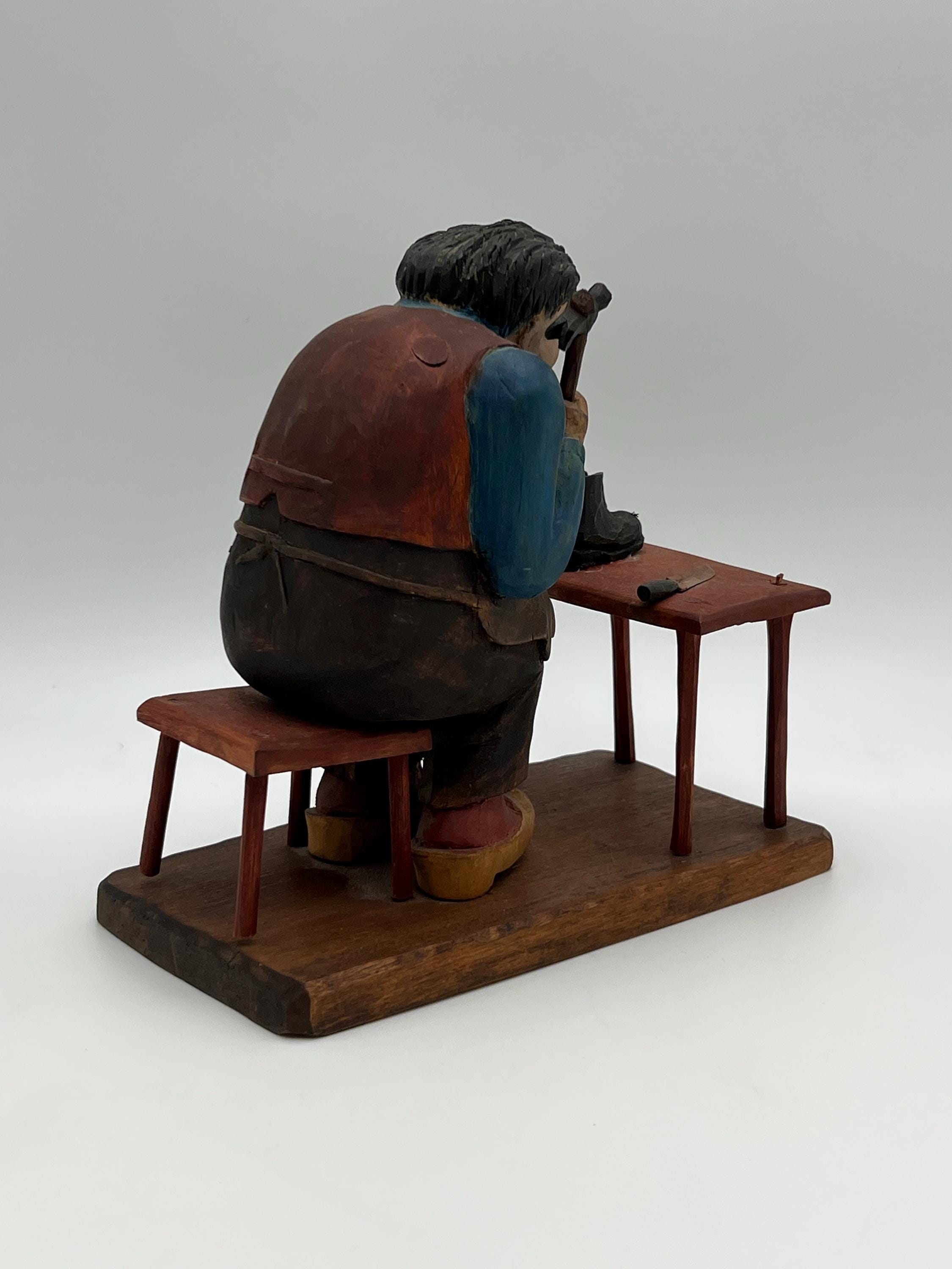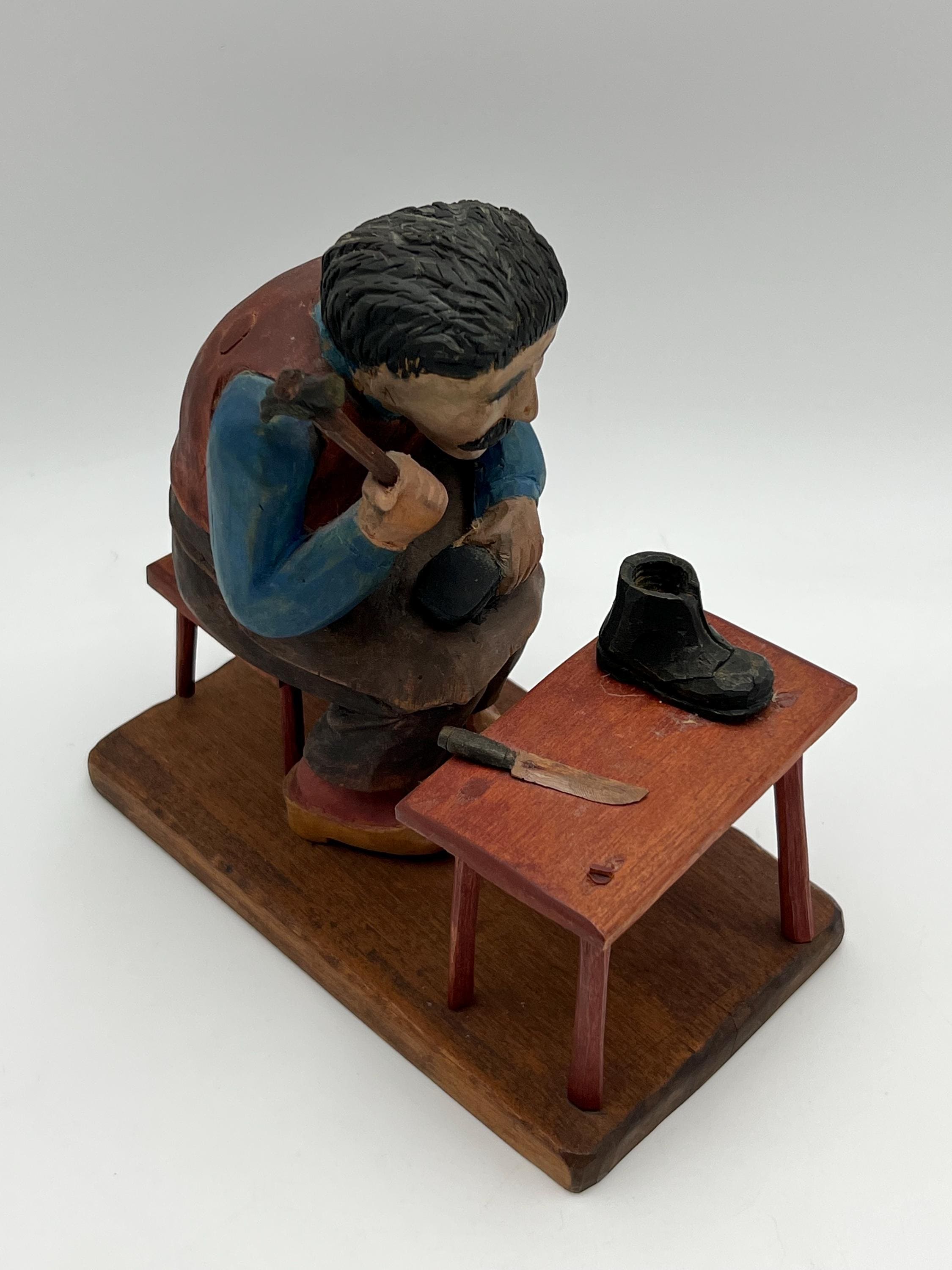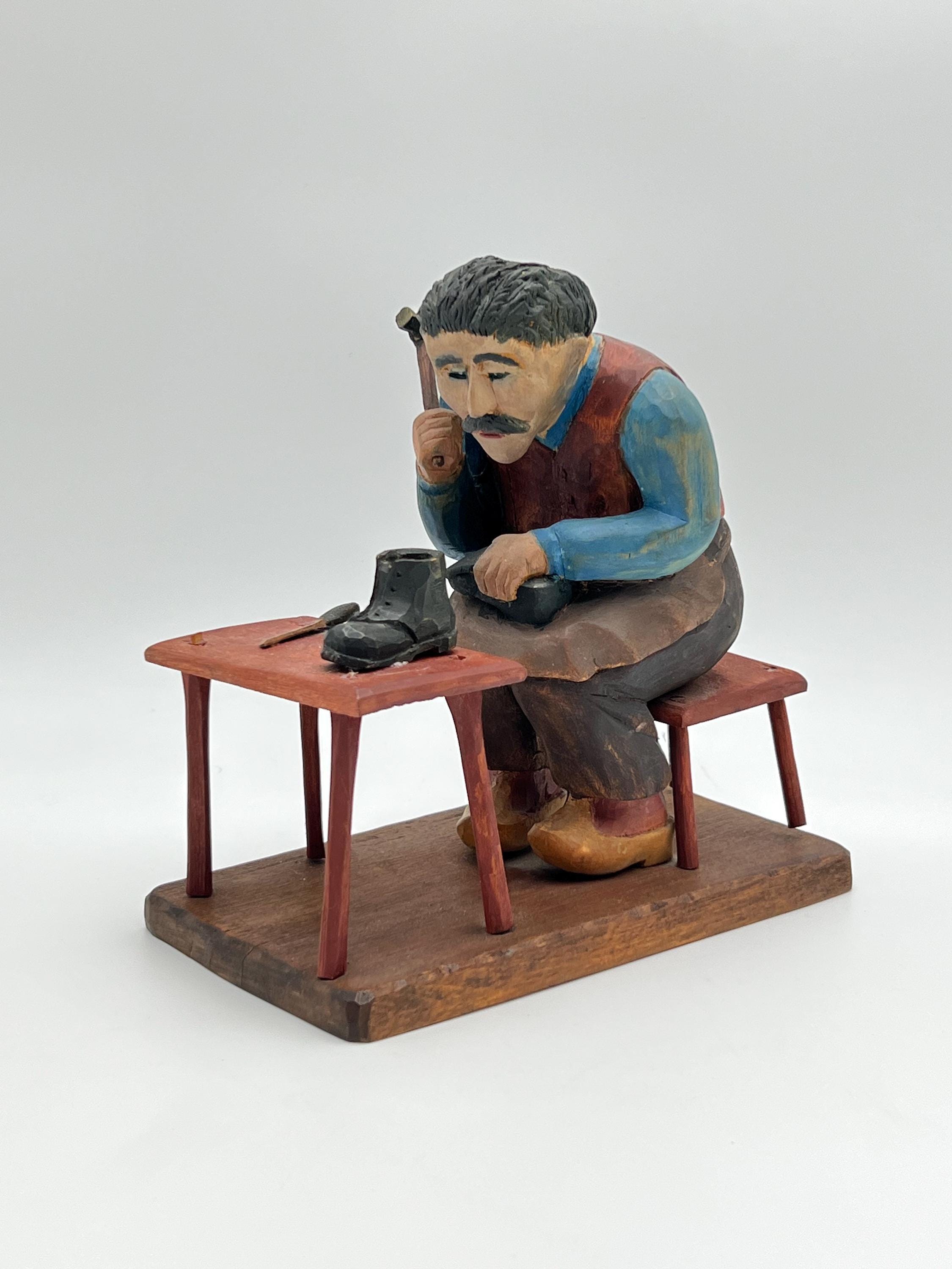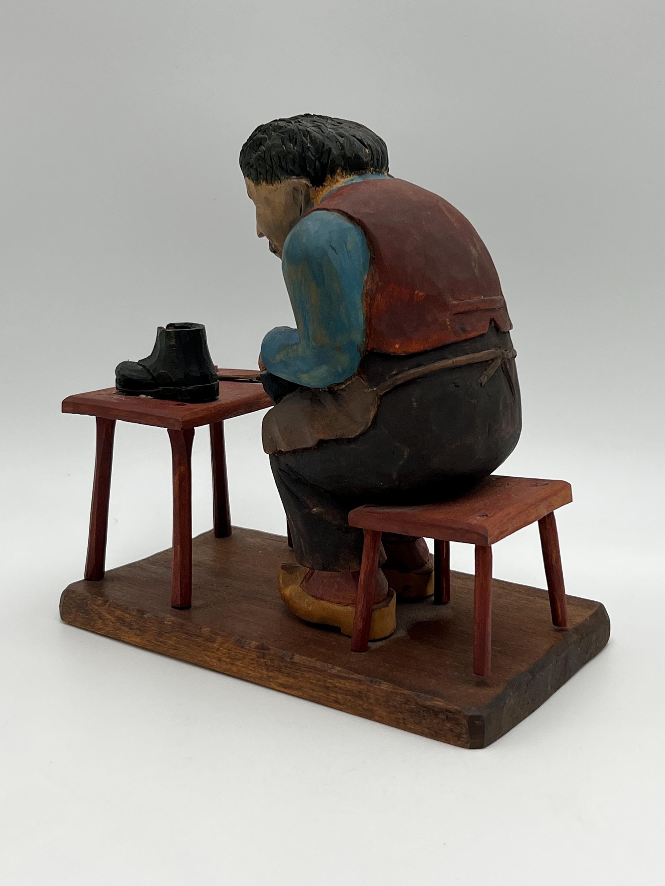 Mid-20th Century Hand-Carved and Painted Norwegian / Swedish Shoemaker Sculpture – Signed and Dated 1945 This expressive hand-carved and painted sculpture depicts a shoemaker seated on a stool, complete with a detailed worktable, shoes, and tools. Signed with deeply carved initials "K.M." and dated 1945.