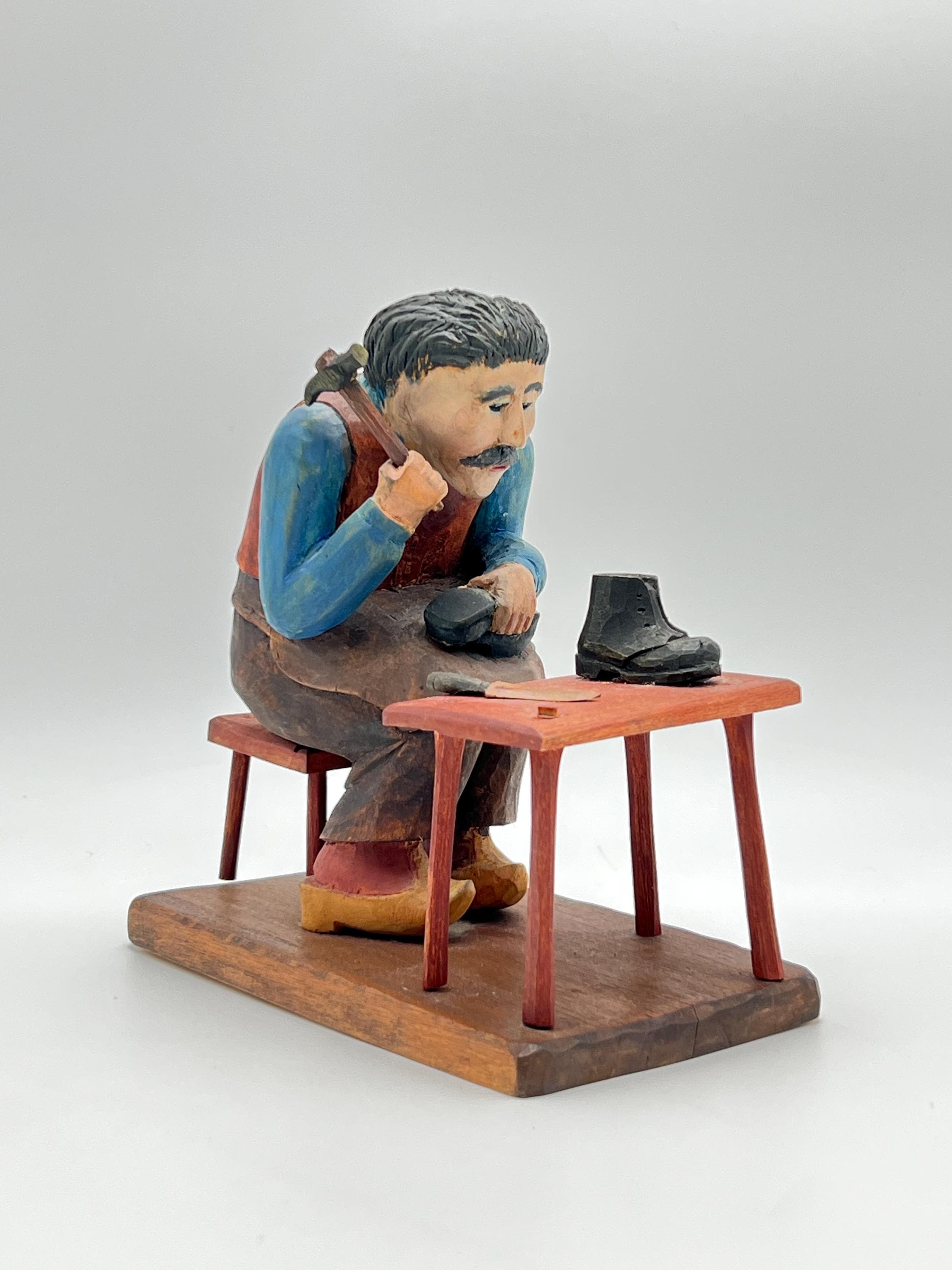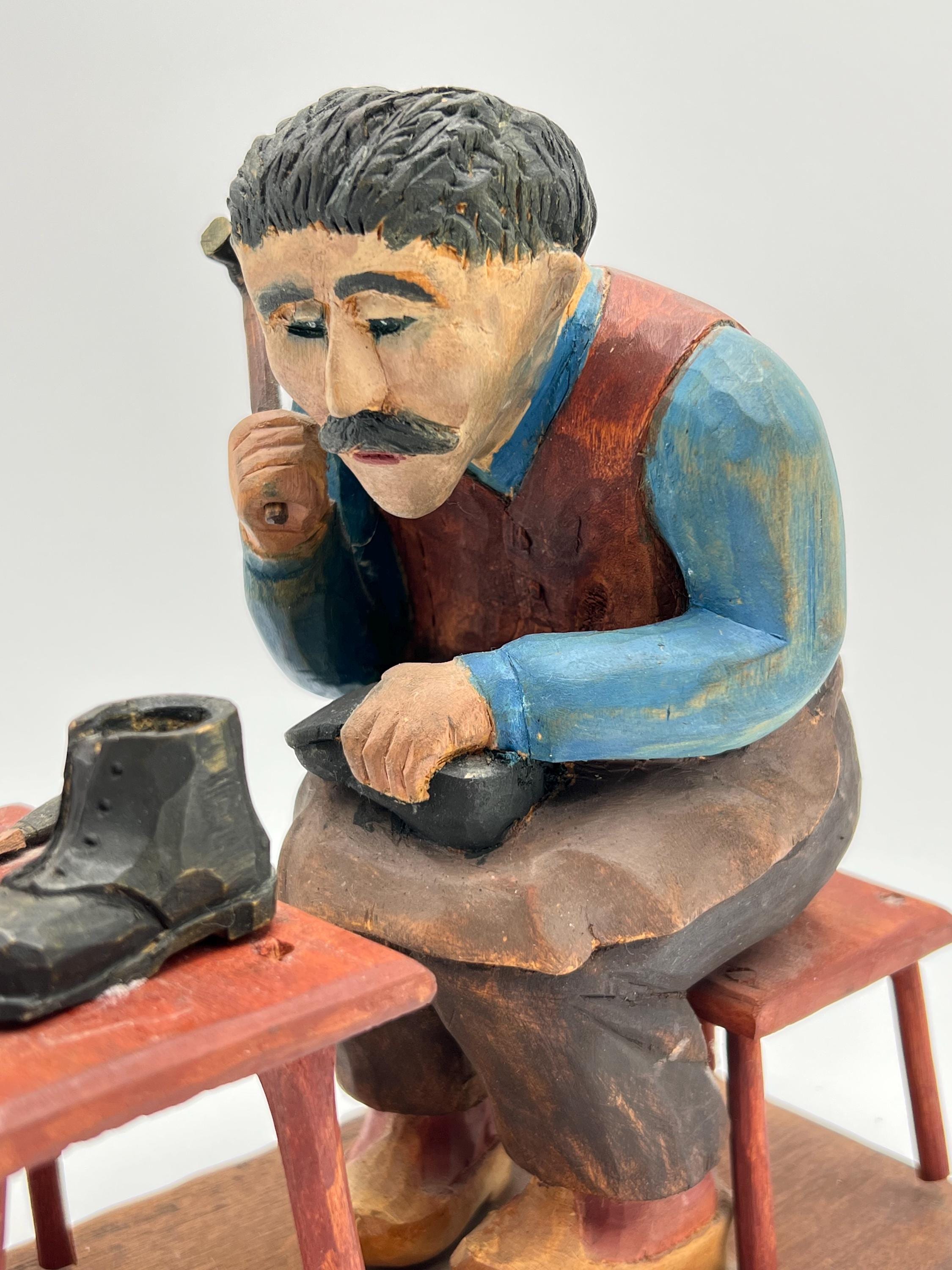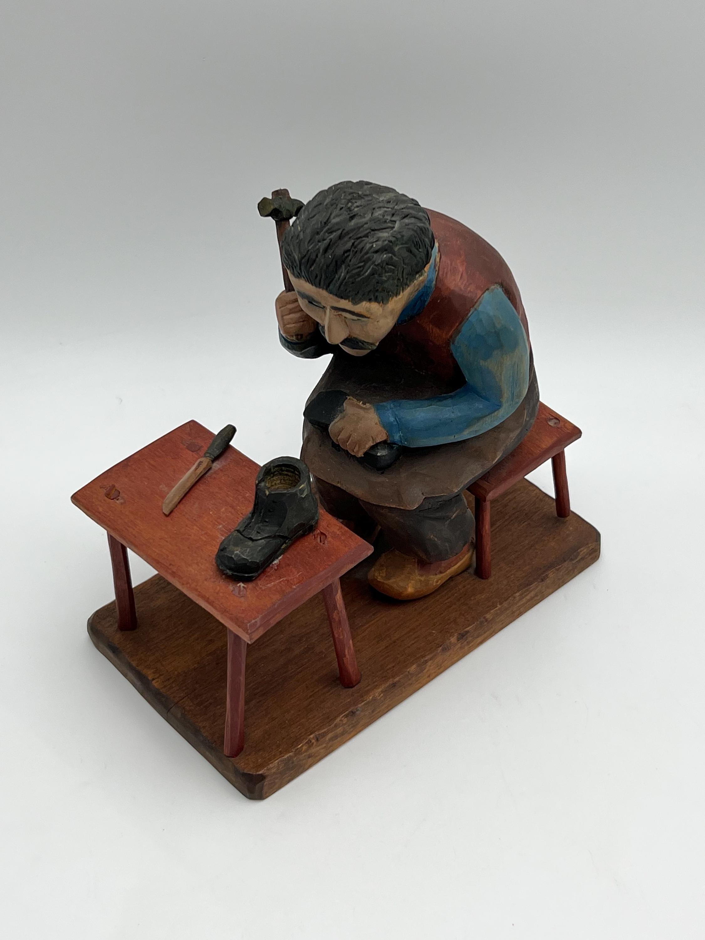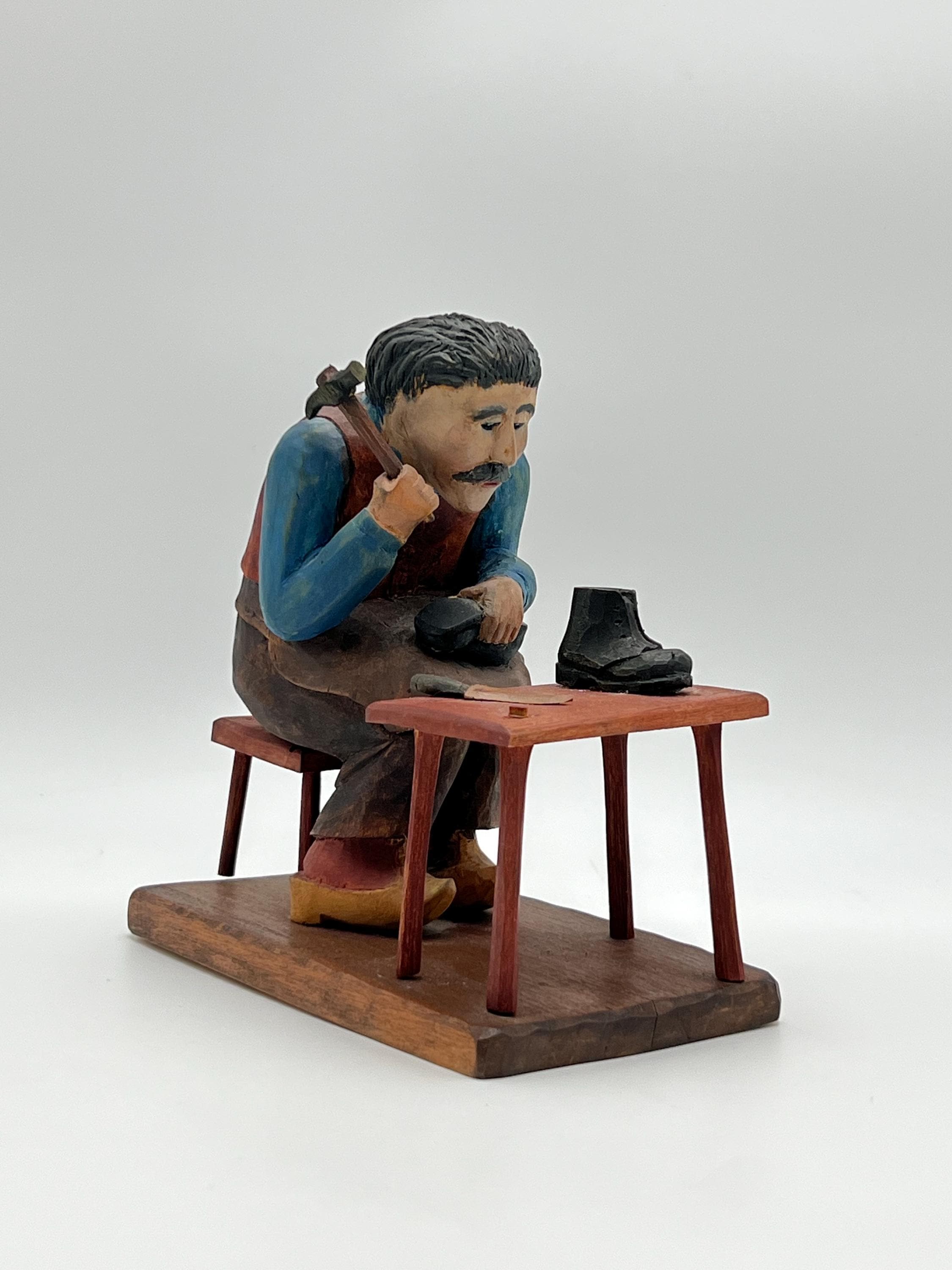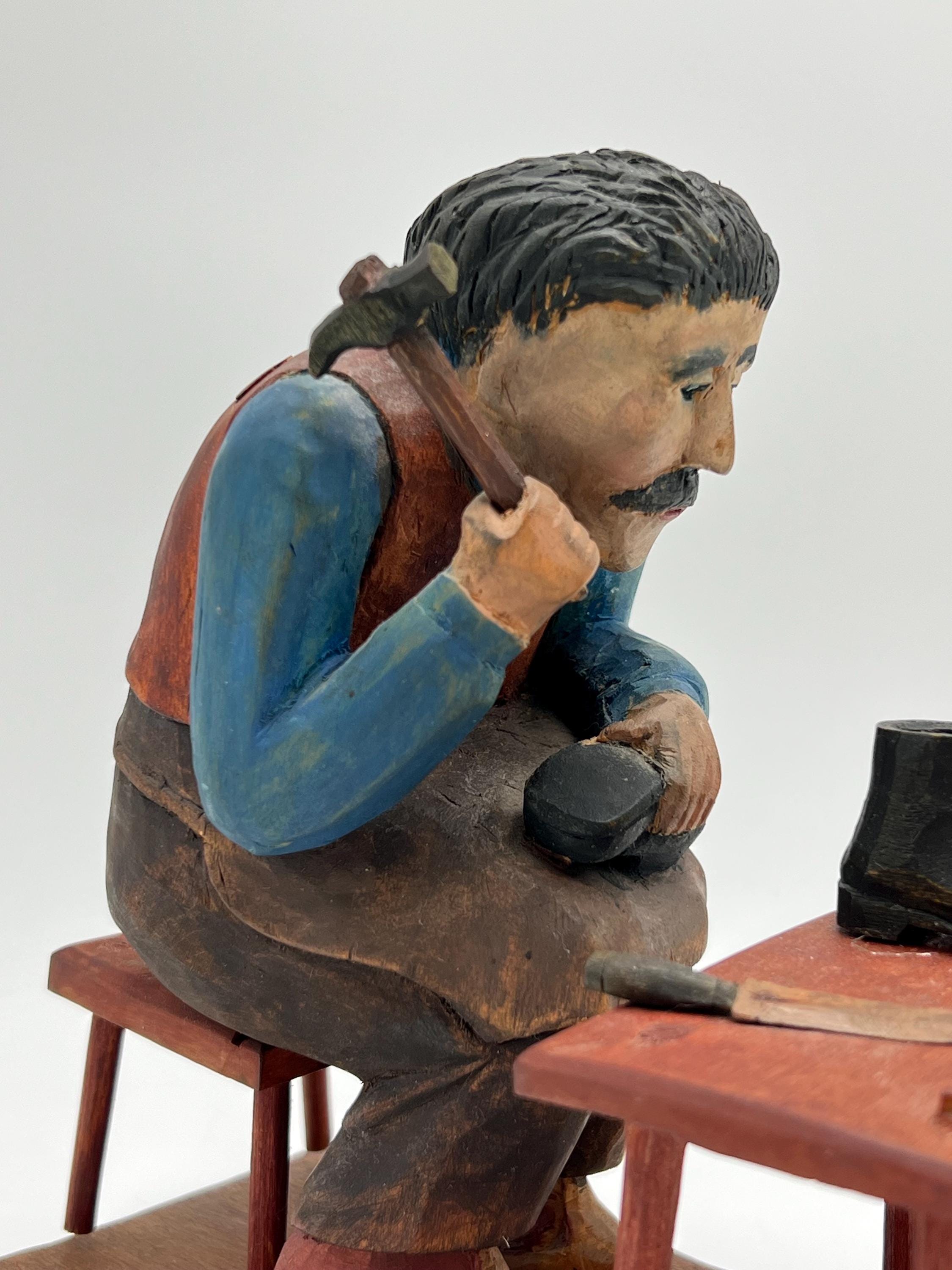 Mid-20th Century Hand-Carved and Painted Norwegian / Swedish Shoemaker Sculpture – Signed and Dated 1945 This expressive hand-carved and painted sculpture depicts a shoemaker seated on a stool, complete with a detailed worktable, shoes, and tools. Signed with deeply carved initials "K.M." and dated 1945.