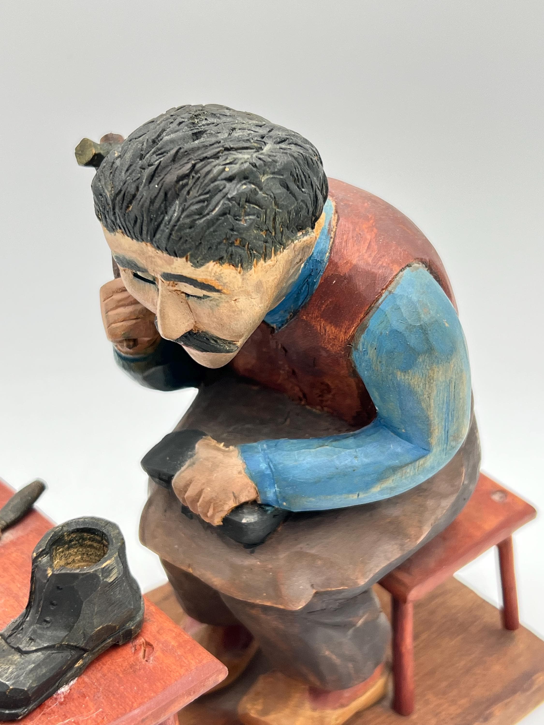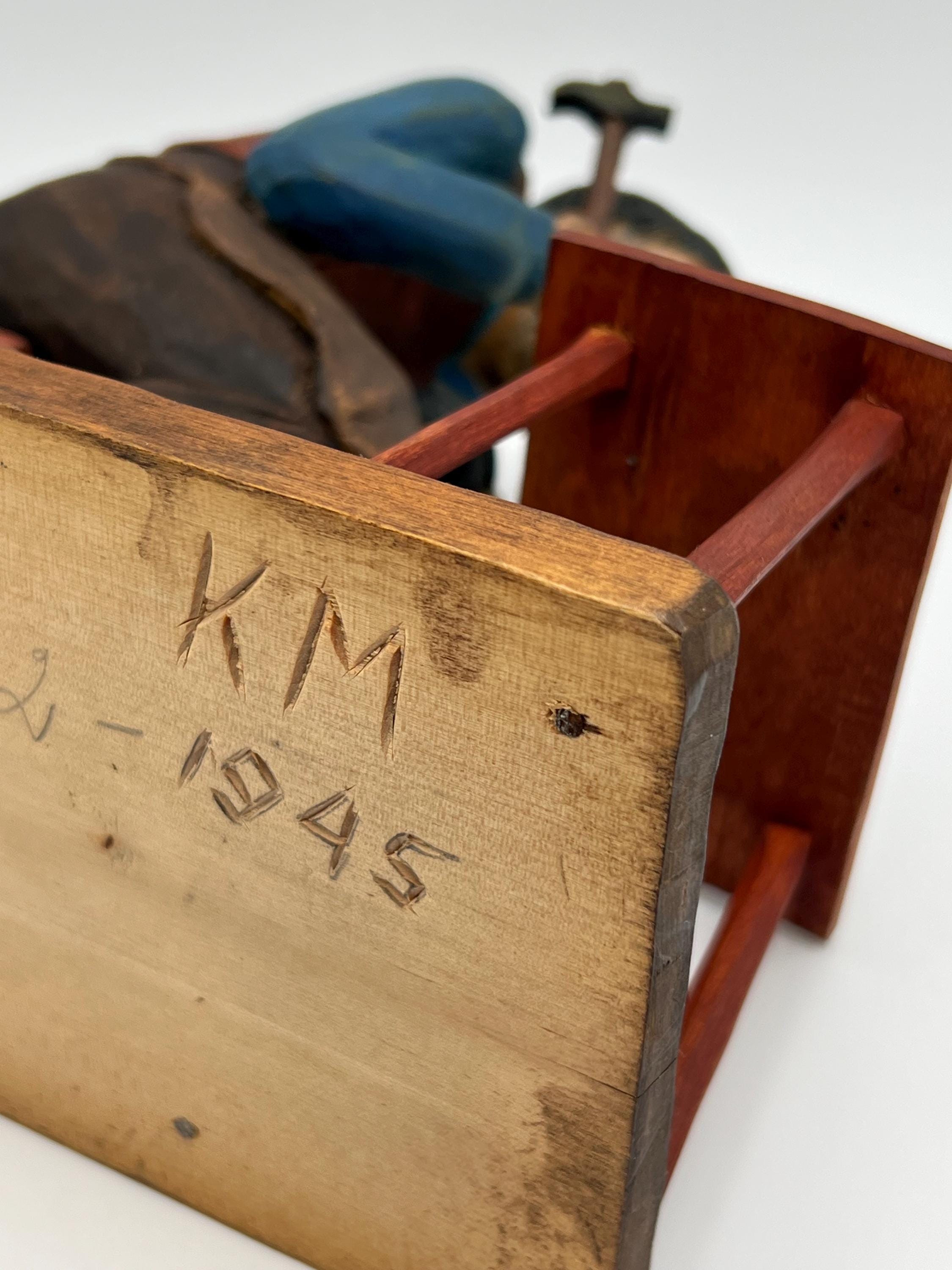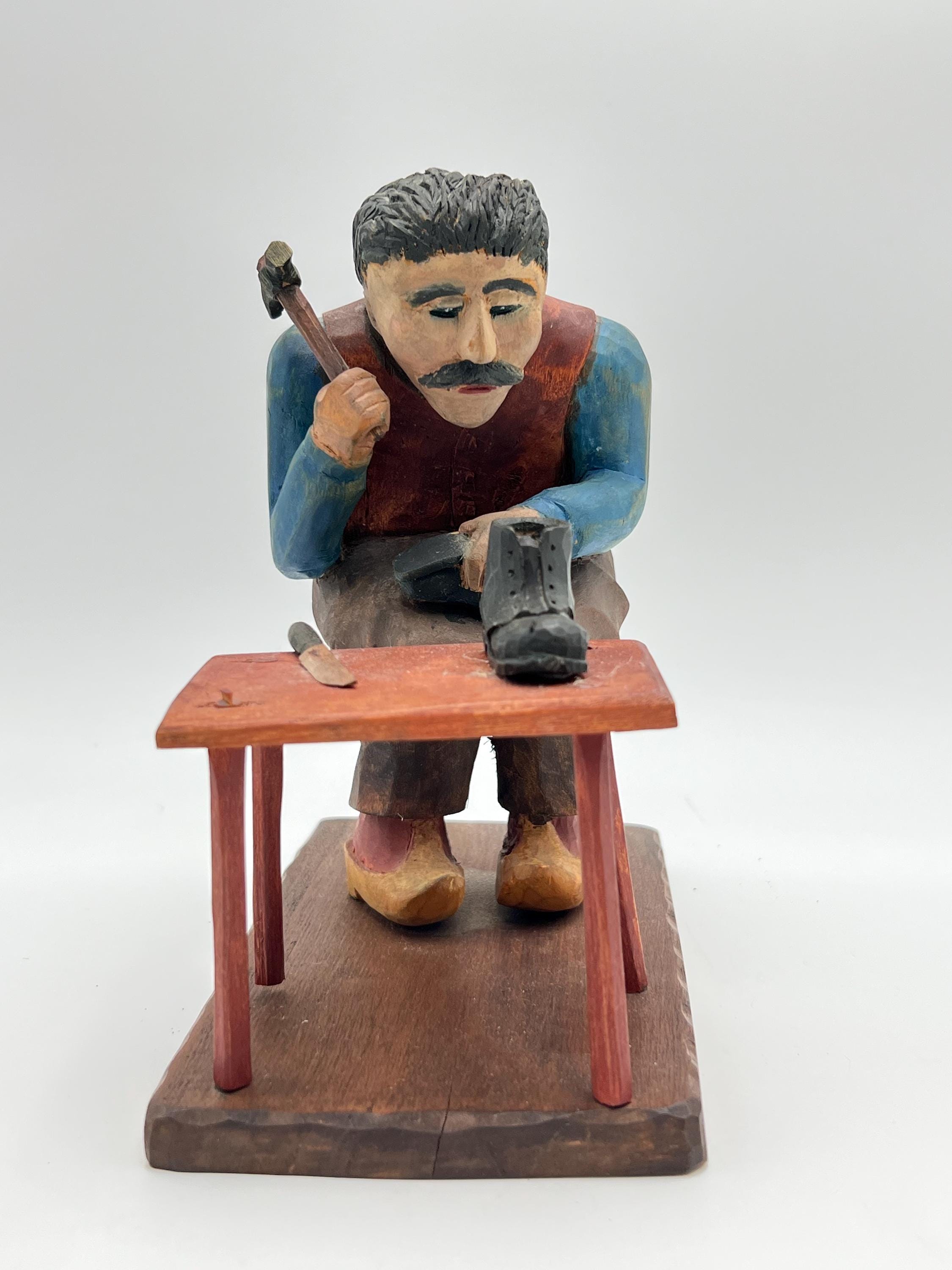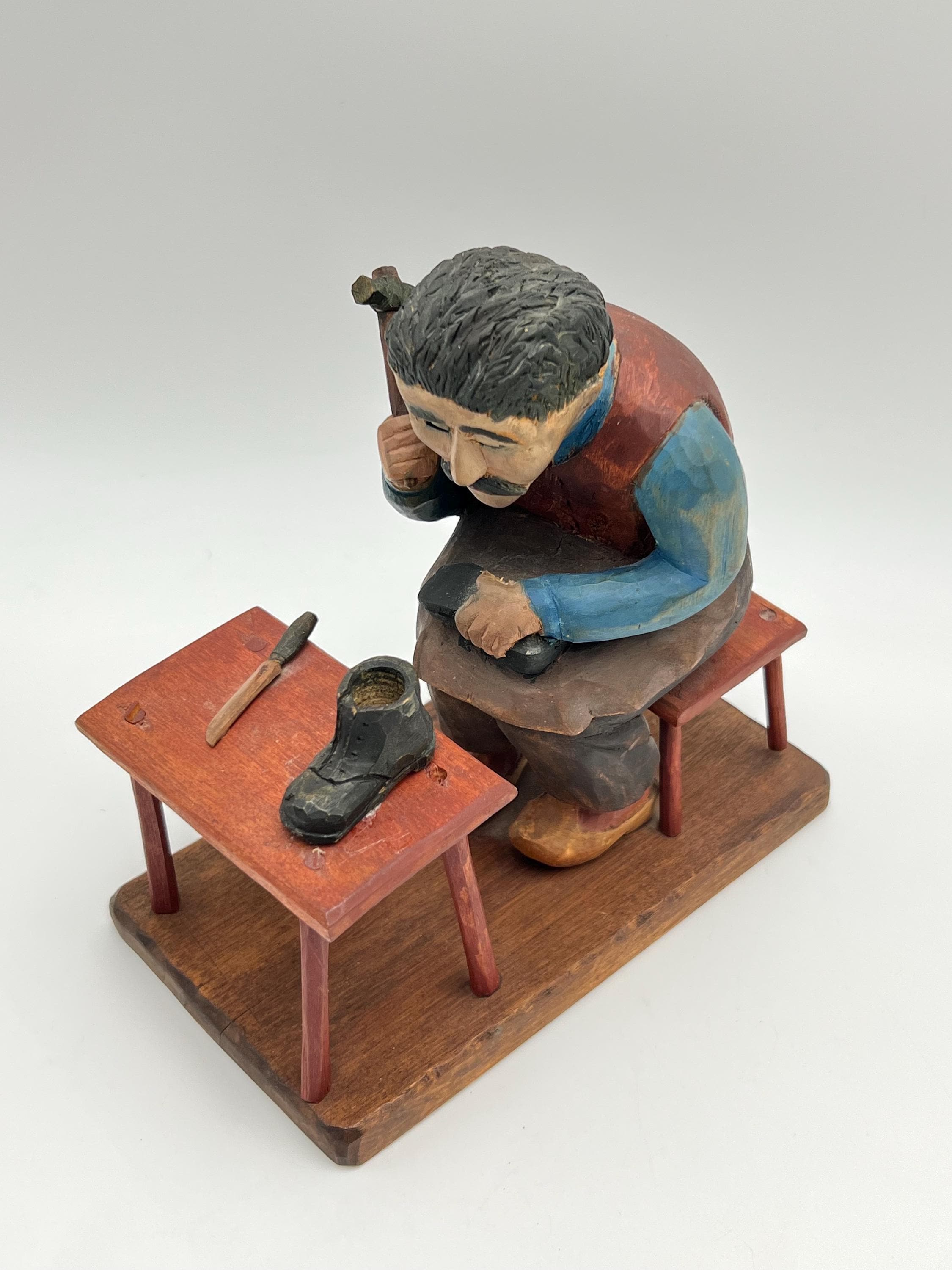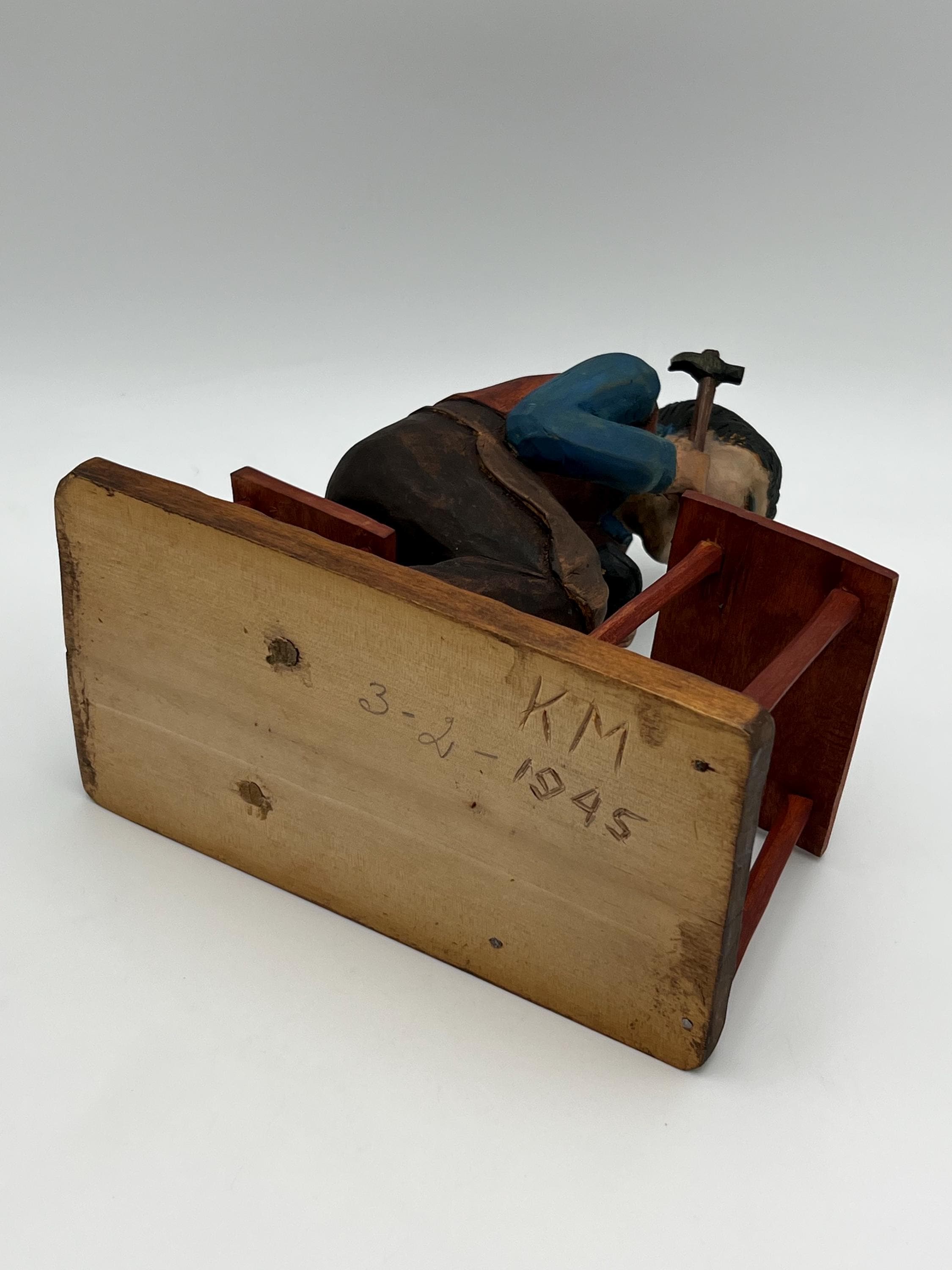 Mid-20th Century Hand-Carved and Painted Norwegian / Swedish Shoemaker Sculpture – Signed and Dated 1945 This expressive hand-carved and painted sculpture depicts a shoemaker seated on a stool, complete with a detailed worktable, shoes, and tools. Signed with deeply carved initials "K.M." and dated 1945.